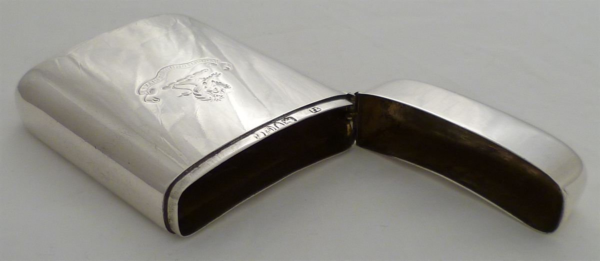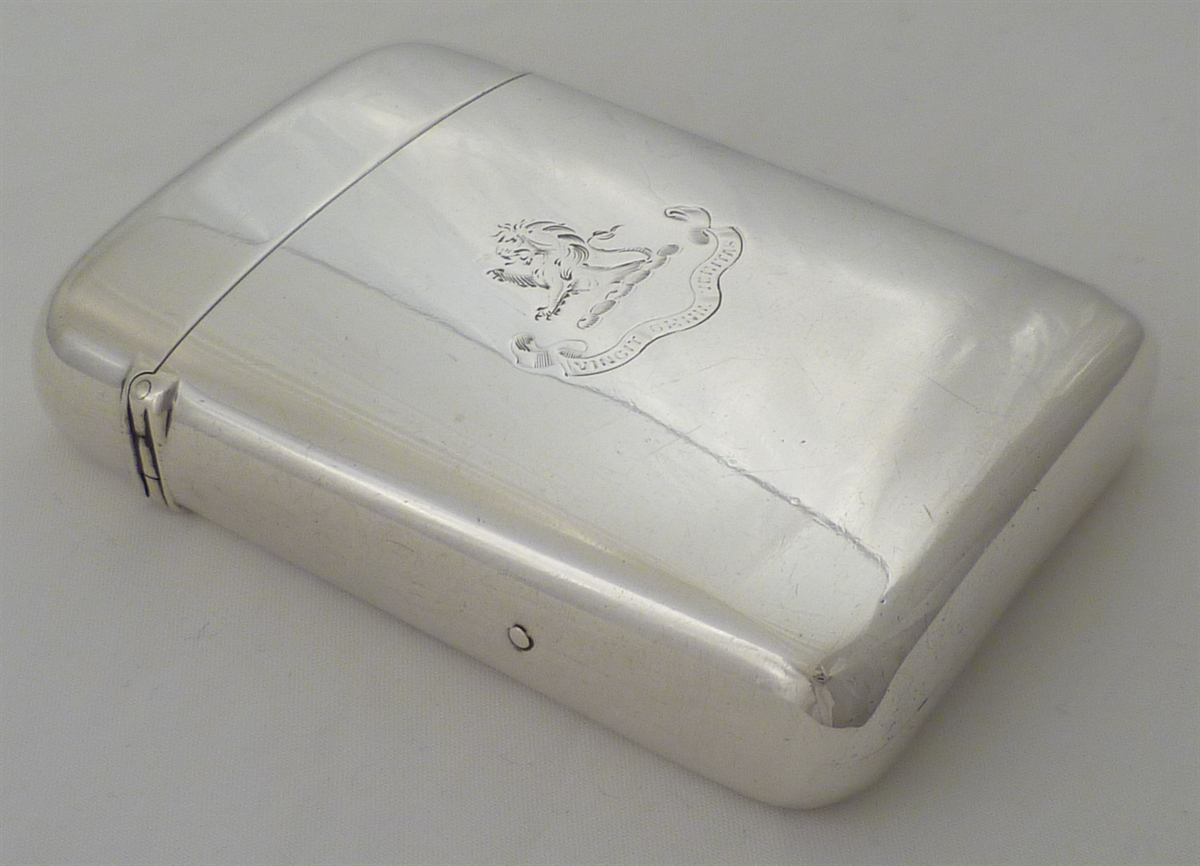 DESCRIPTION | Victorian solid silver cigarette case with a gilded interior and frontal crest engraving above a motto. |