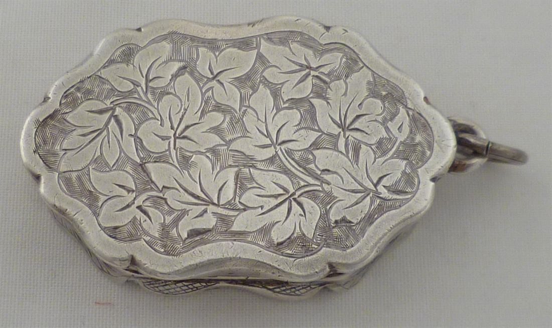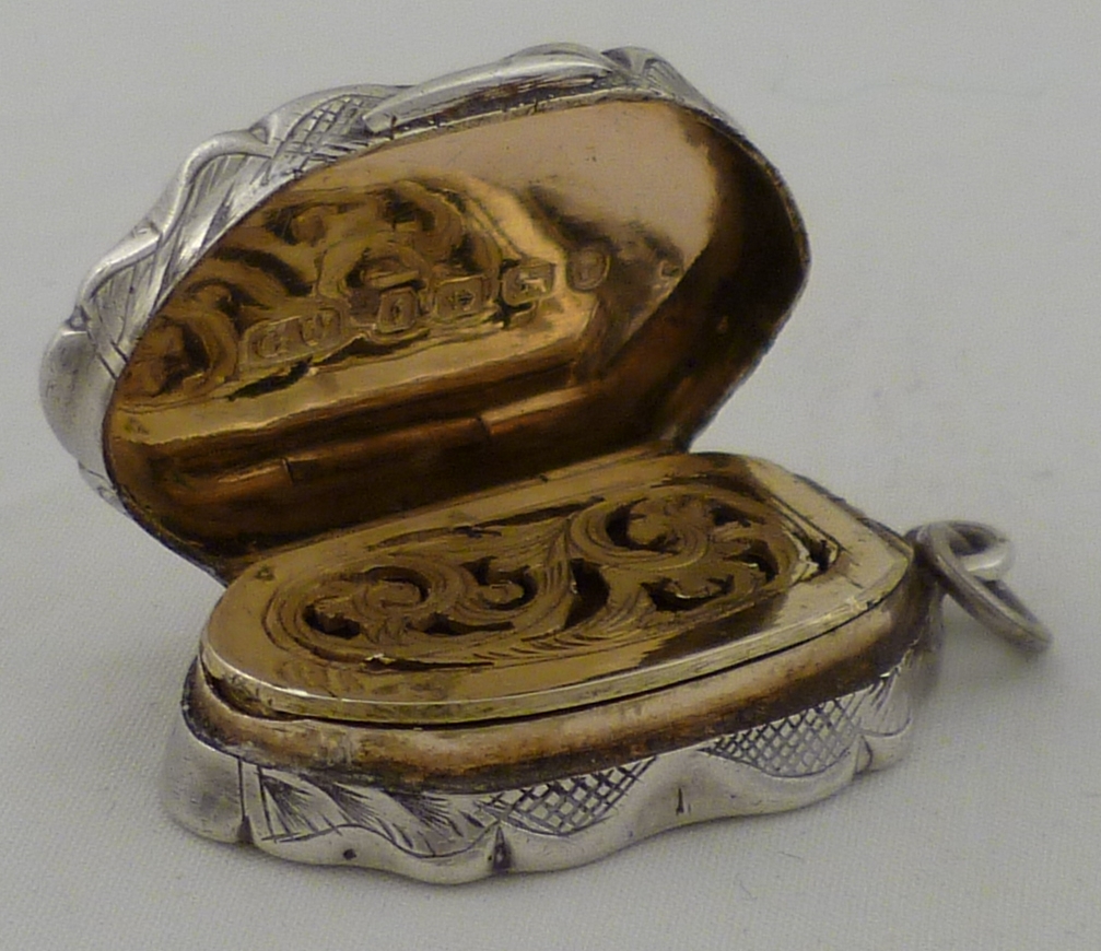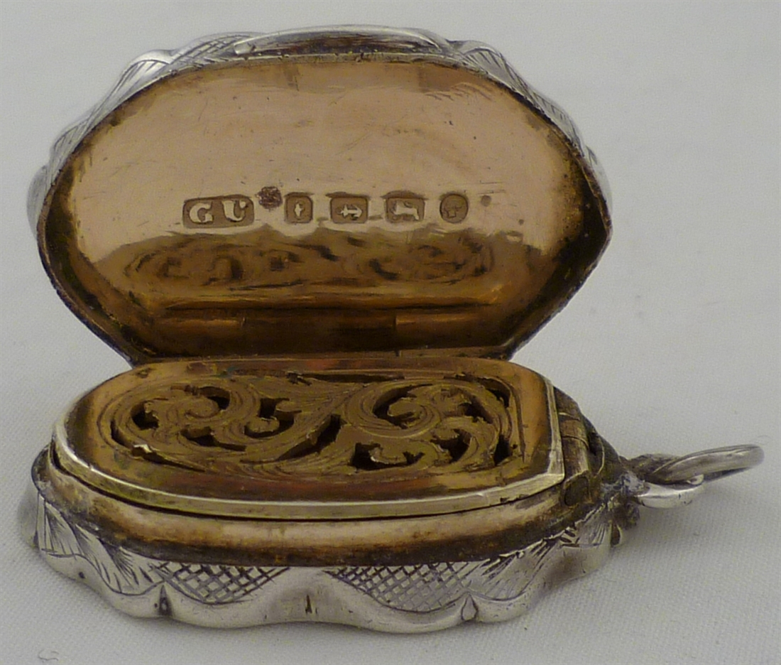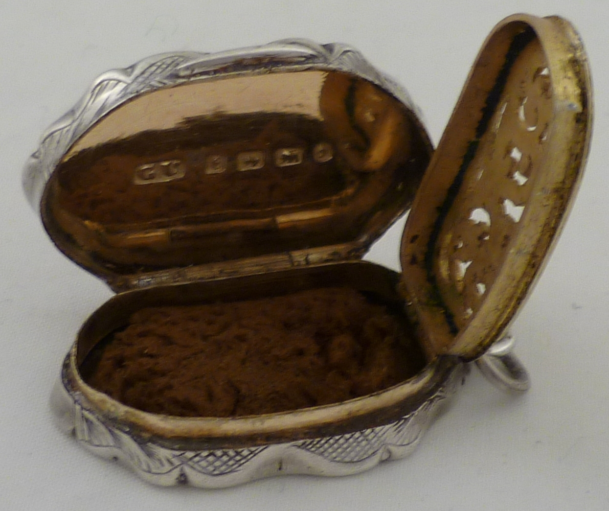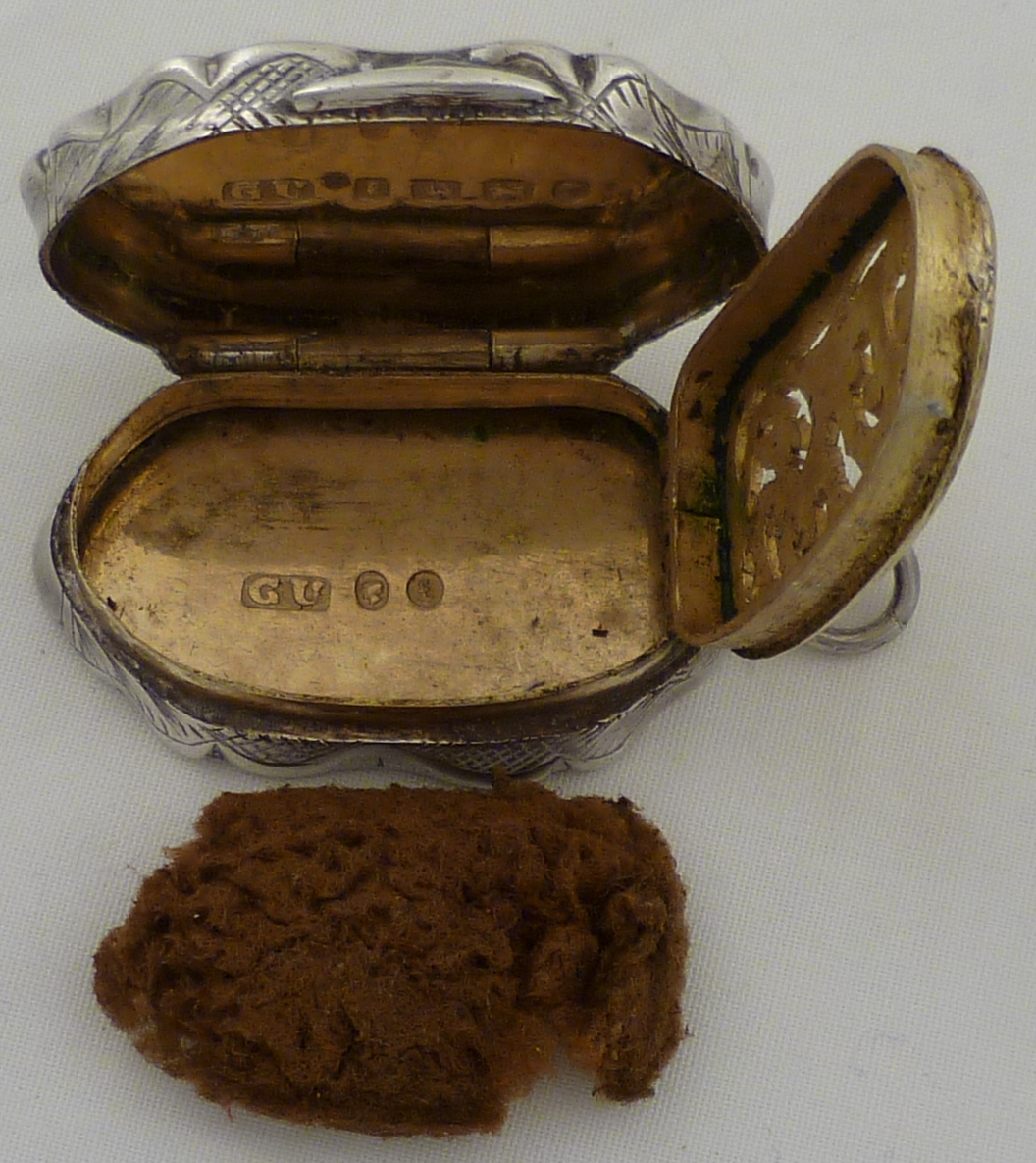 DESCRIPTION | Wonderfully original Victorian solid silver vinaigrette with engraved decoration, a strongly gilded interior and original natural sponge that is still noticeably perfumed. |