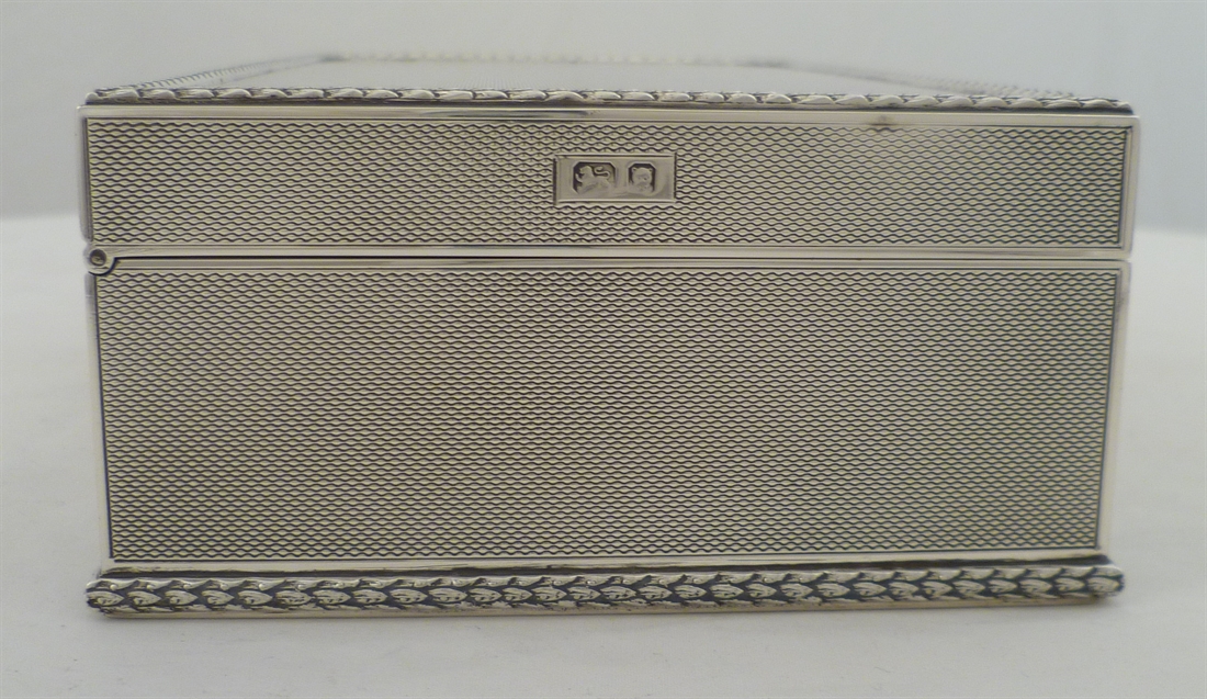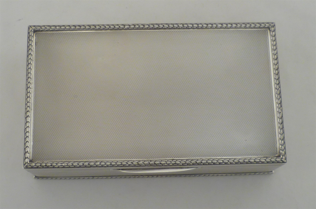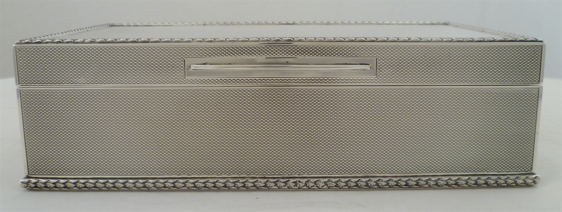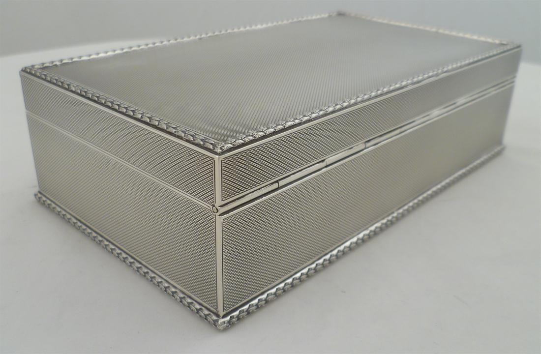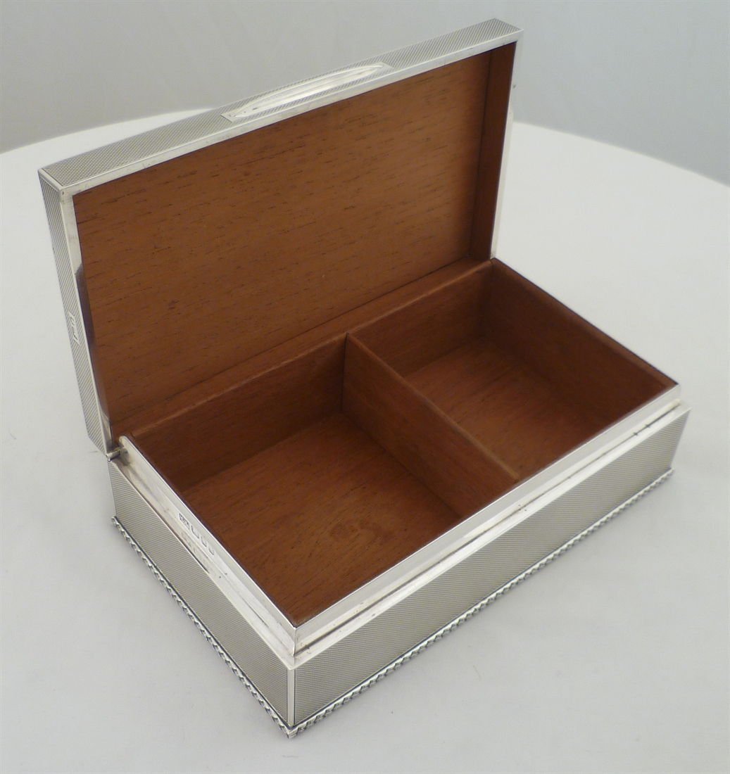 DESCRIPTION | Finest quality silver cigarette box with engine turned engraved decoration, a piano hinge and cedar wood lined interior. |