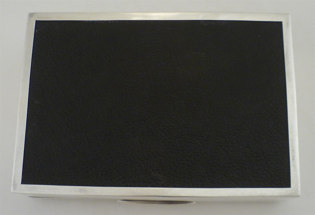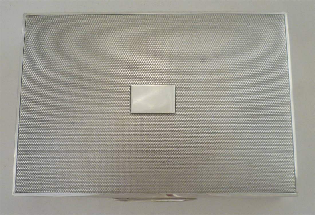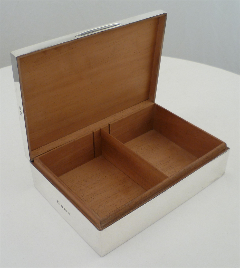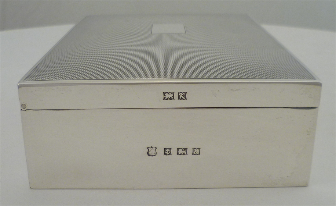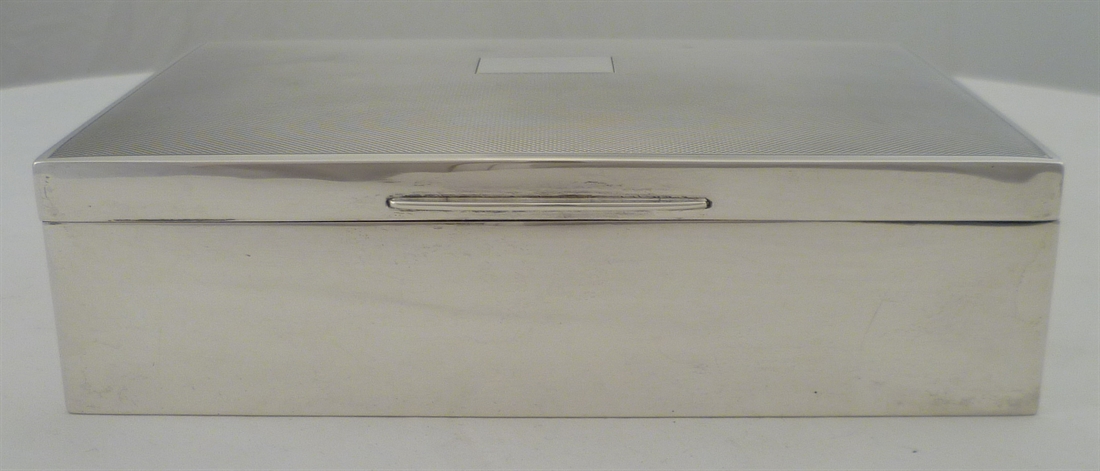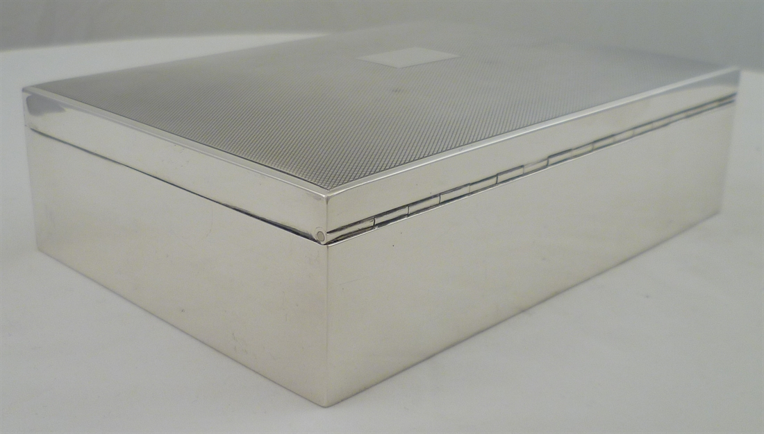 DESCRIPTION | Large solid silver cigarette box with engine turned engraved decoration to the lid, a piano hinge and a cedar wood lined interior with three position moveable divider. |