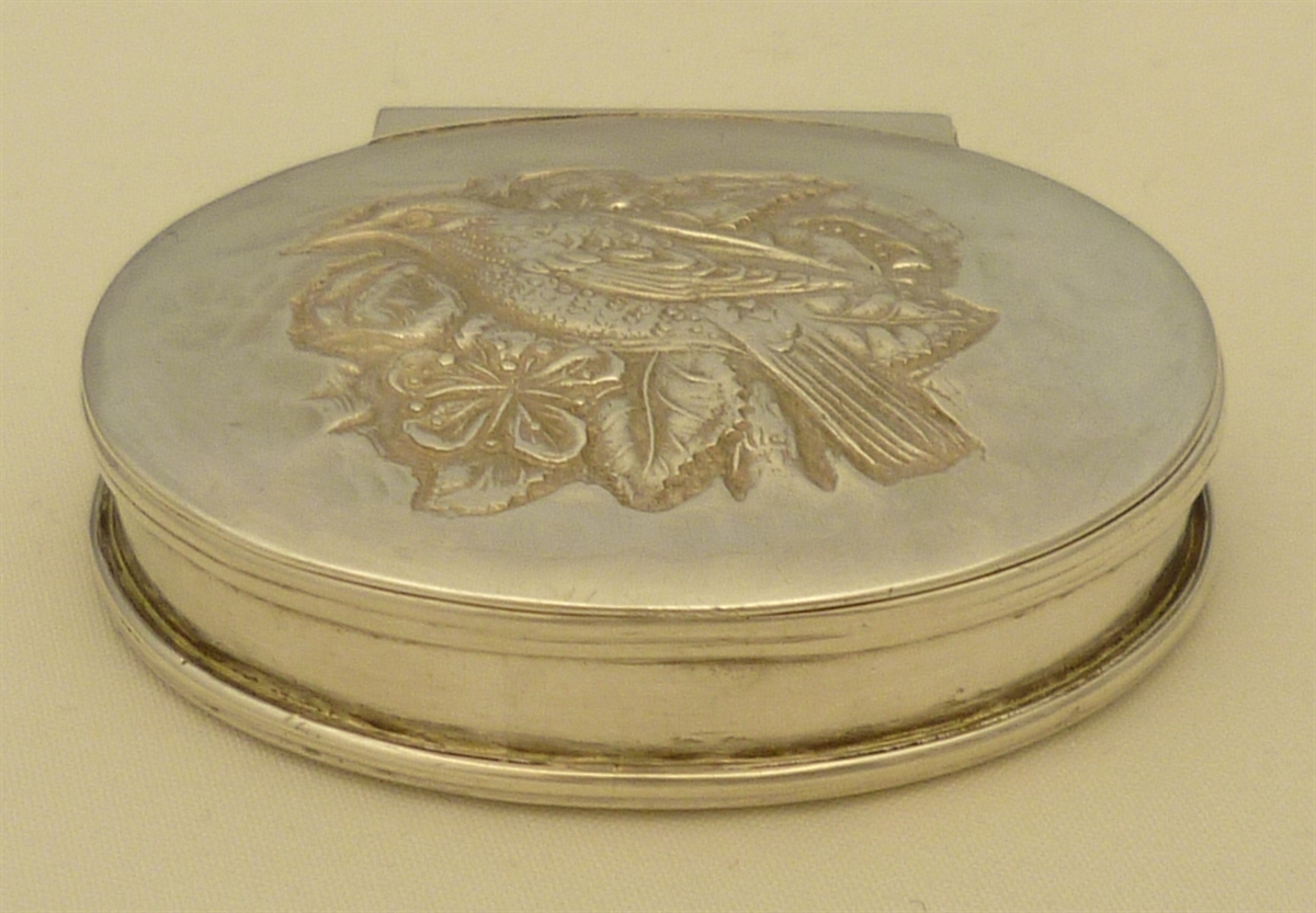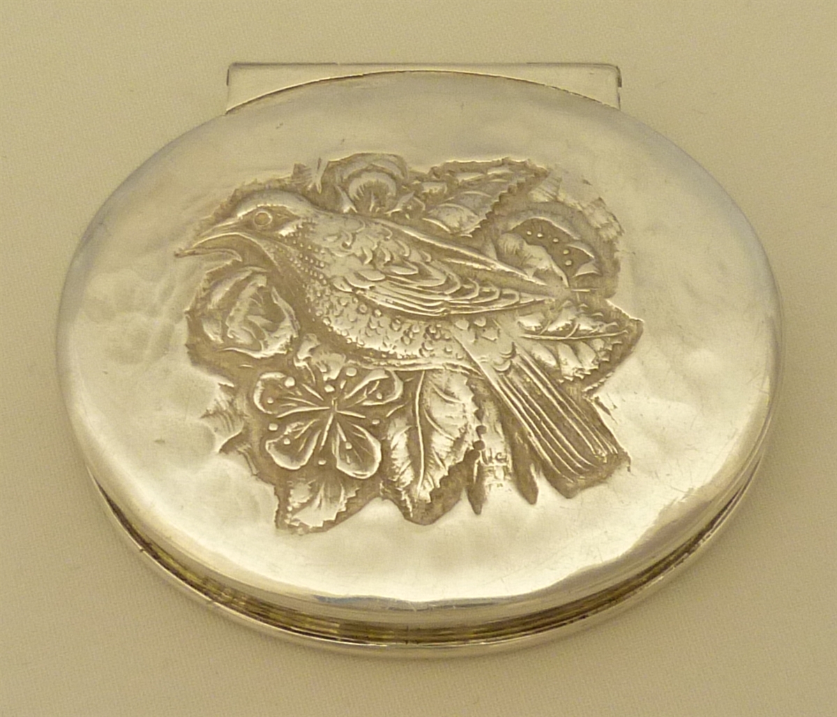 DESCRIPTION | Useful little English solid sterling silver drug or pill box with hammered decoration and a bird amongst flowers and foliage to the hinged lid. |