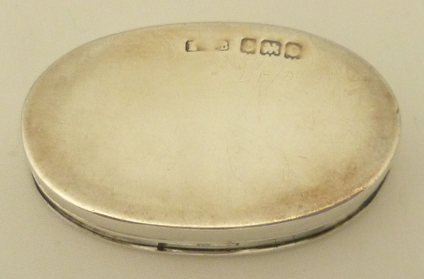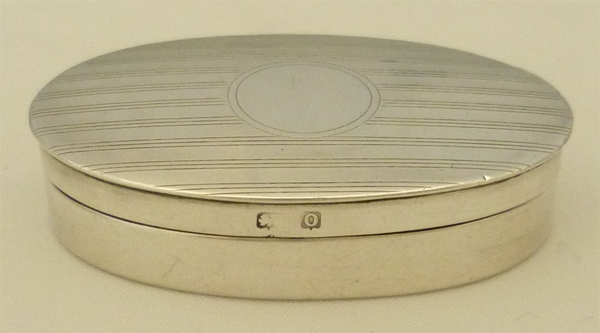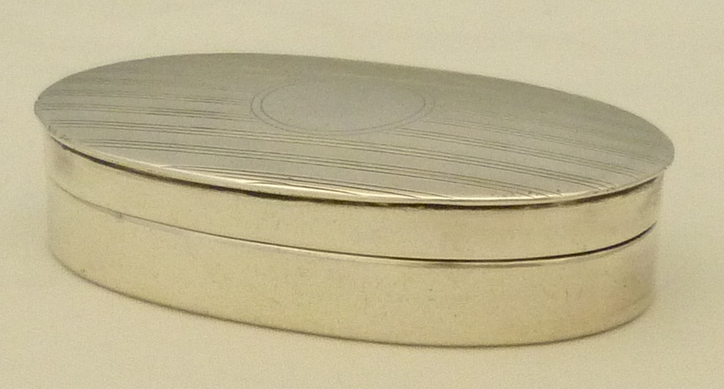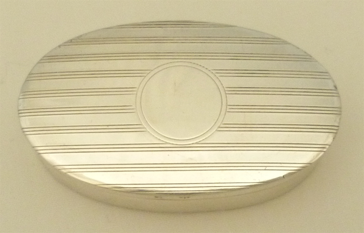 DESCRIPTION | English solid sterling silver box with engine turned engraved decoration to the pull off lid, a blank cartouche and a matt gilded interior. |