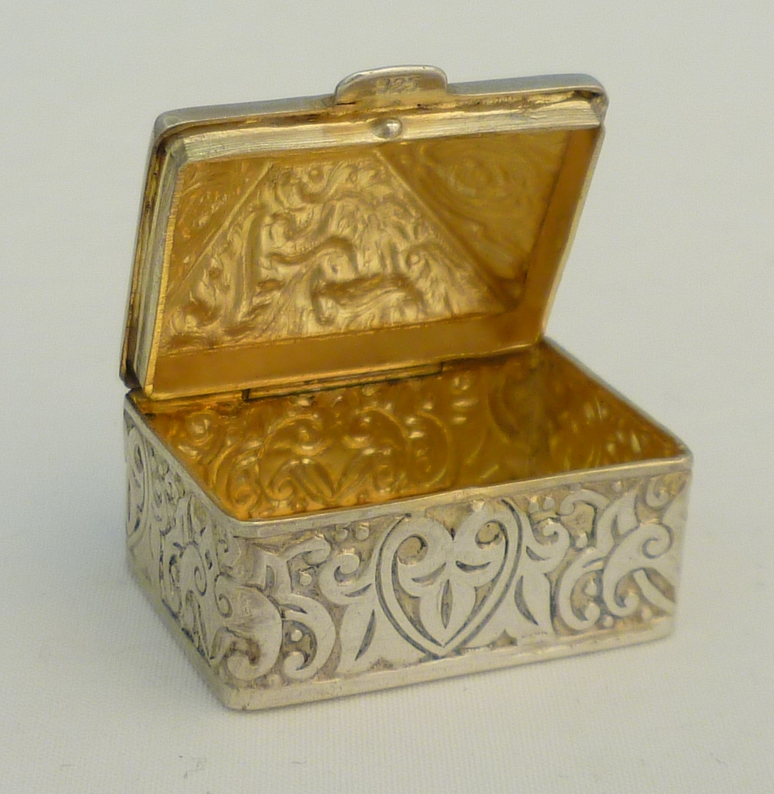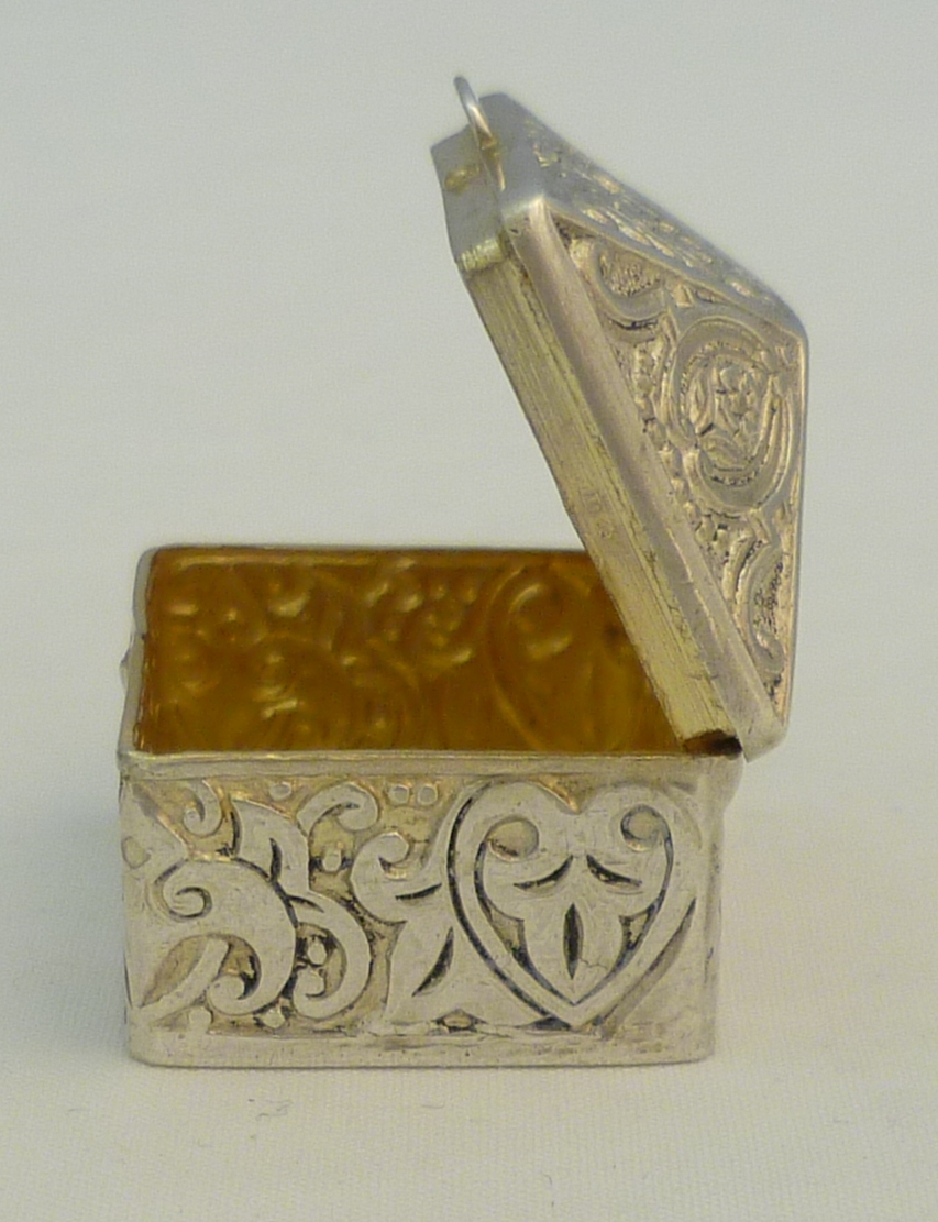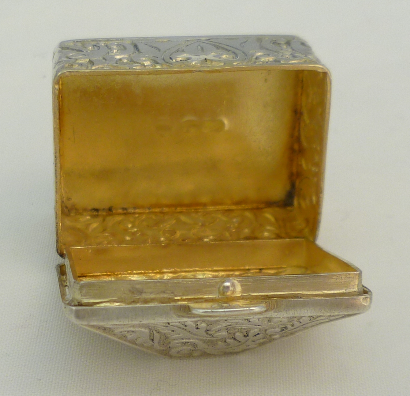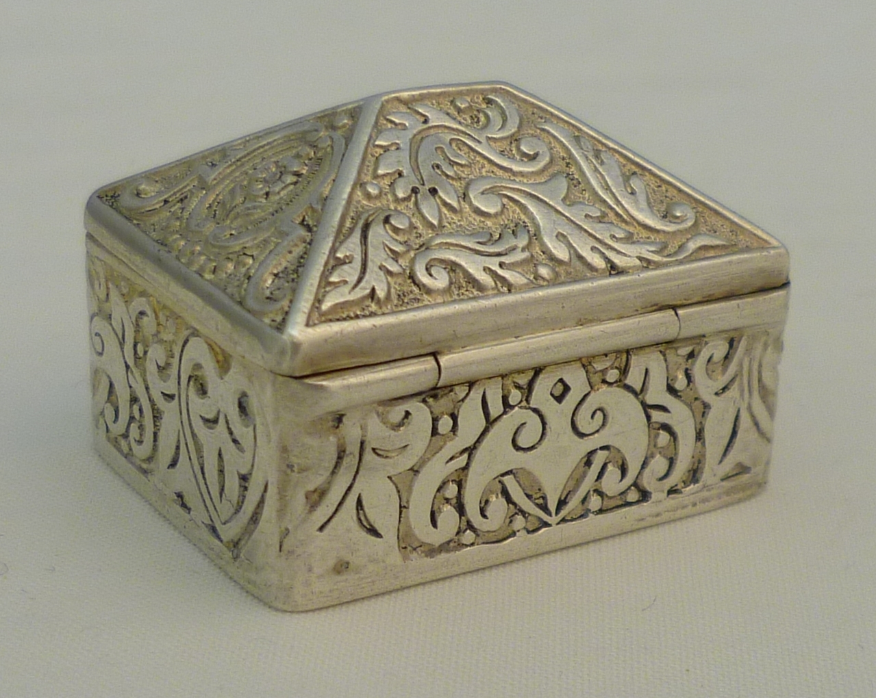 DESCRIPTION | Solid sterling silver hinge lidded box with a fully gilded interior and embossed and engraved decoration. Considering the date, quite possibly intended to hold a piece of hashish. |