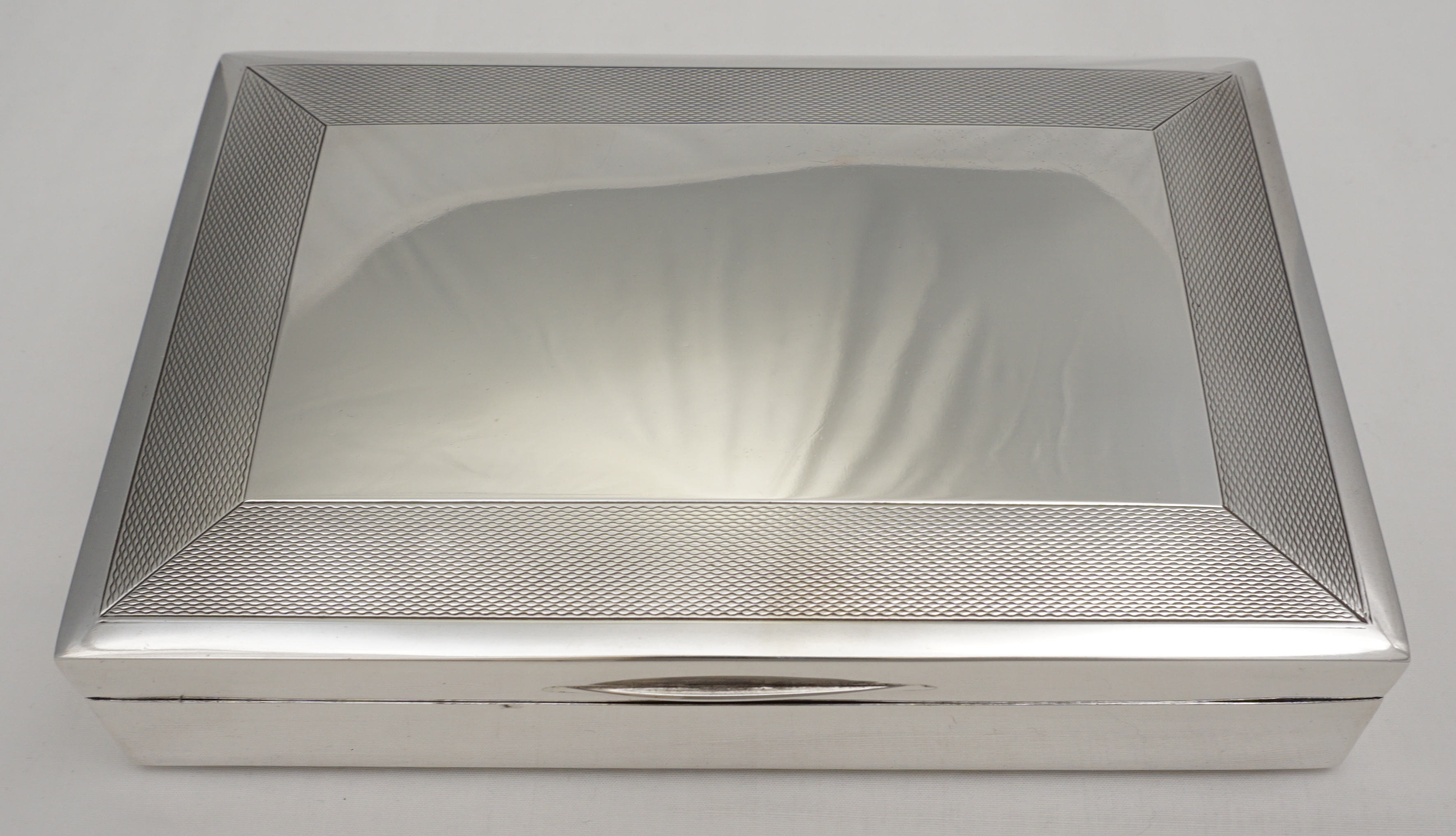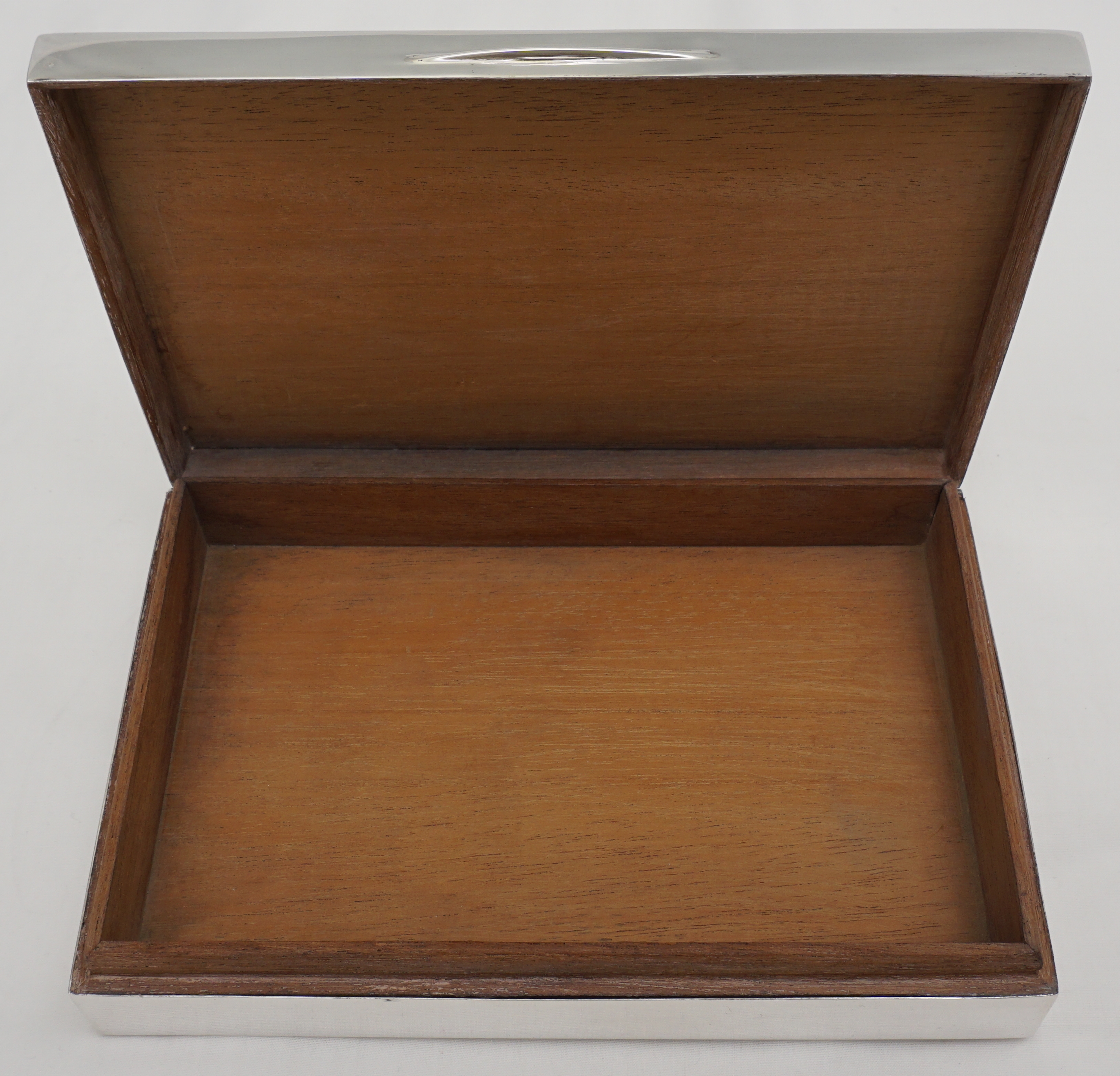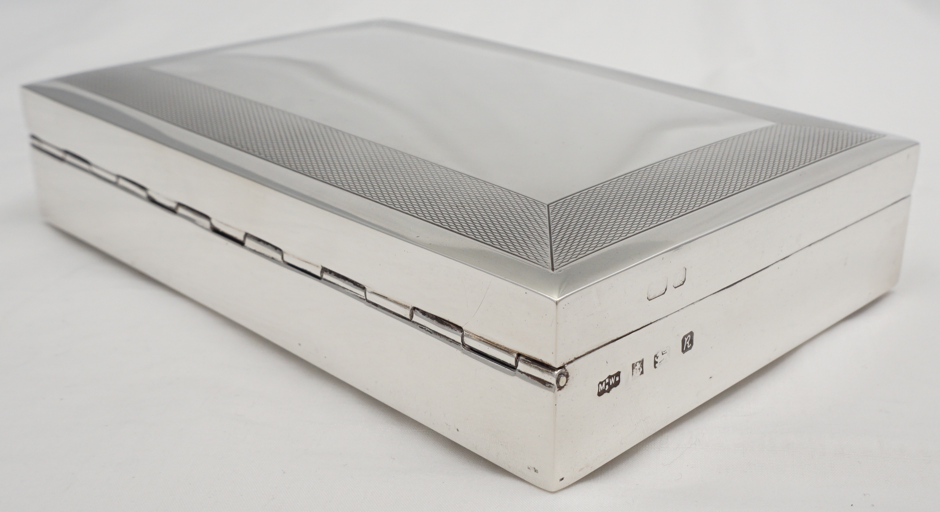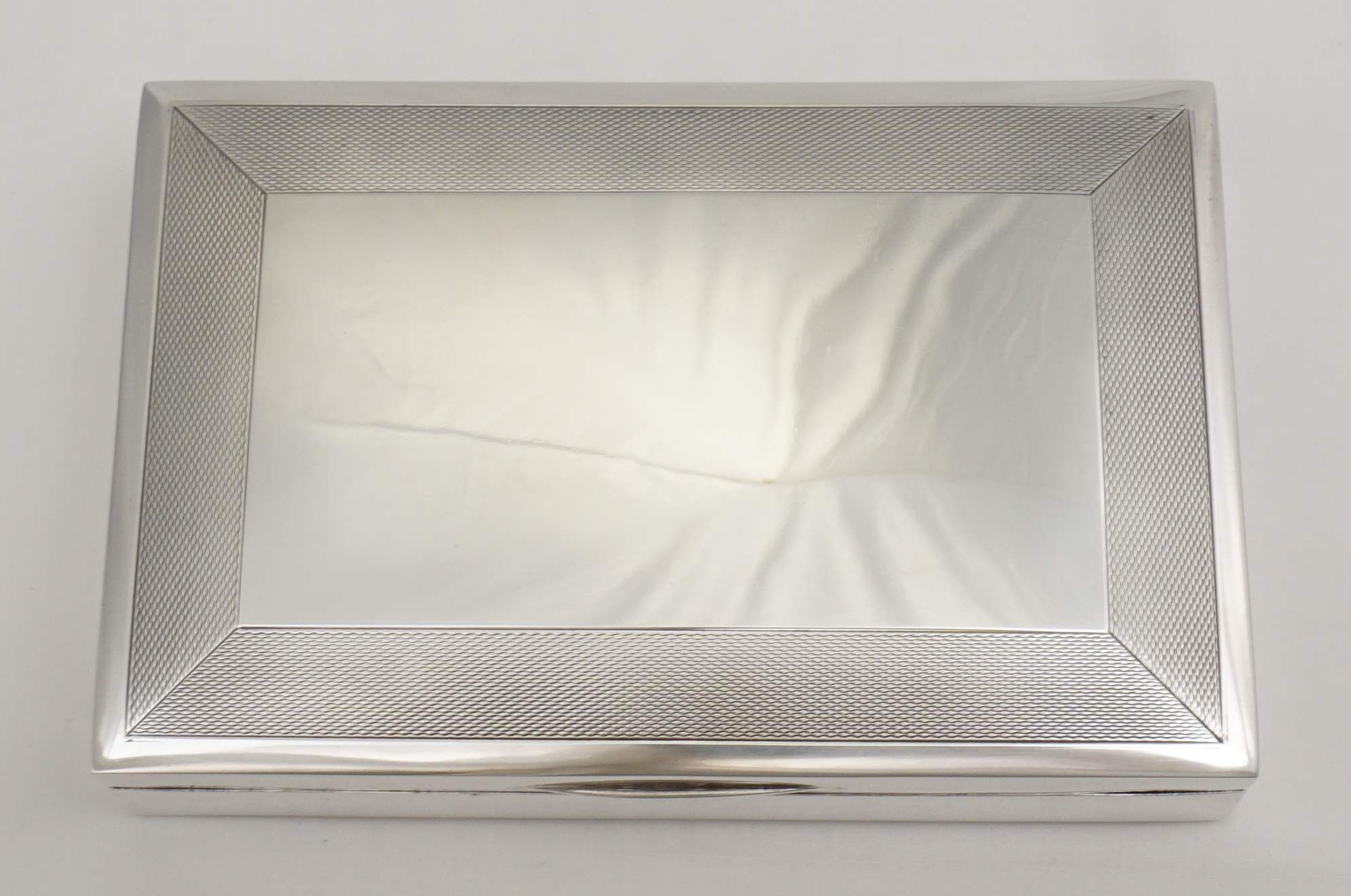 DESCRIPTION | Very good English sterling silver box with engine turned engraved decoration and cedar wood interior. Originally intended for cigarettes but now more likely used for jewellery or herbs. |