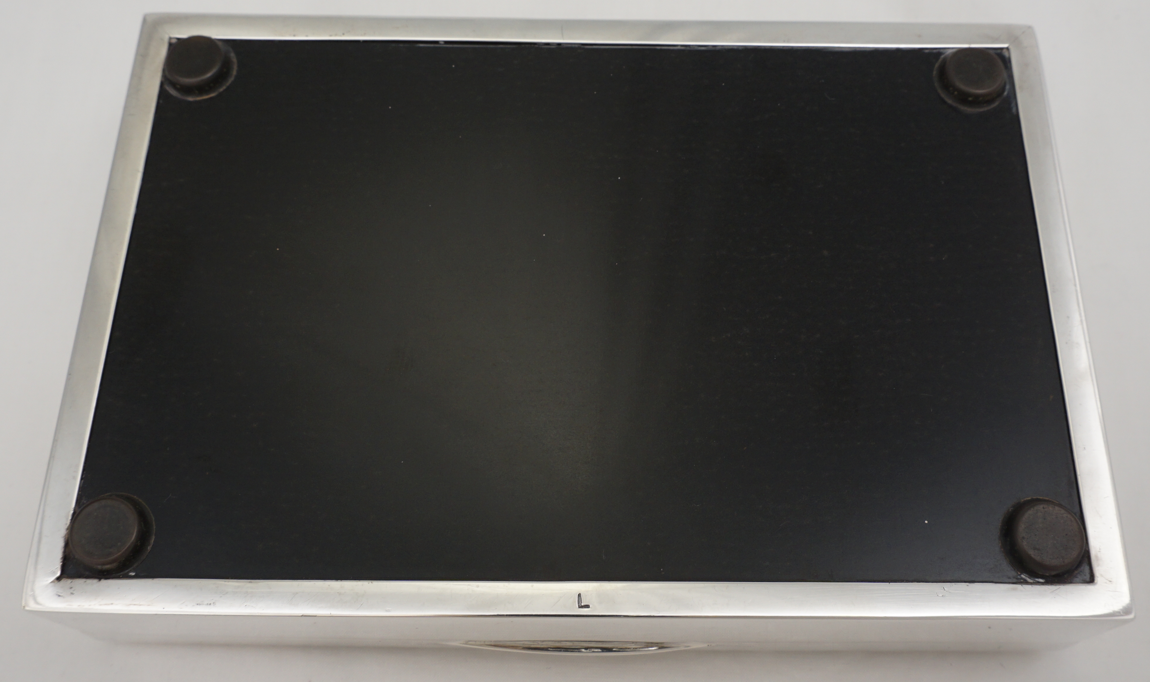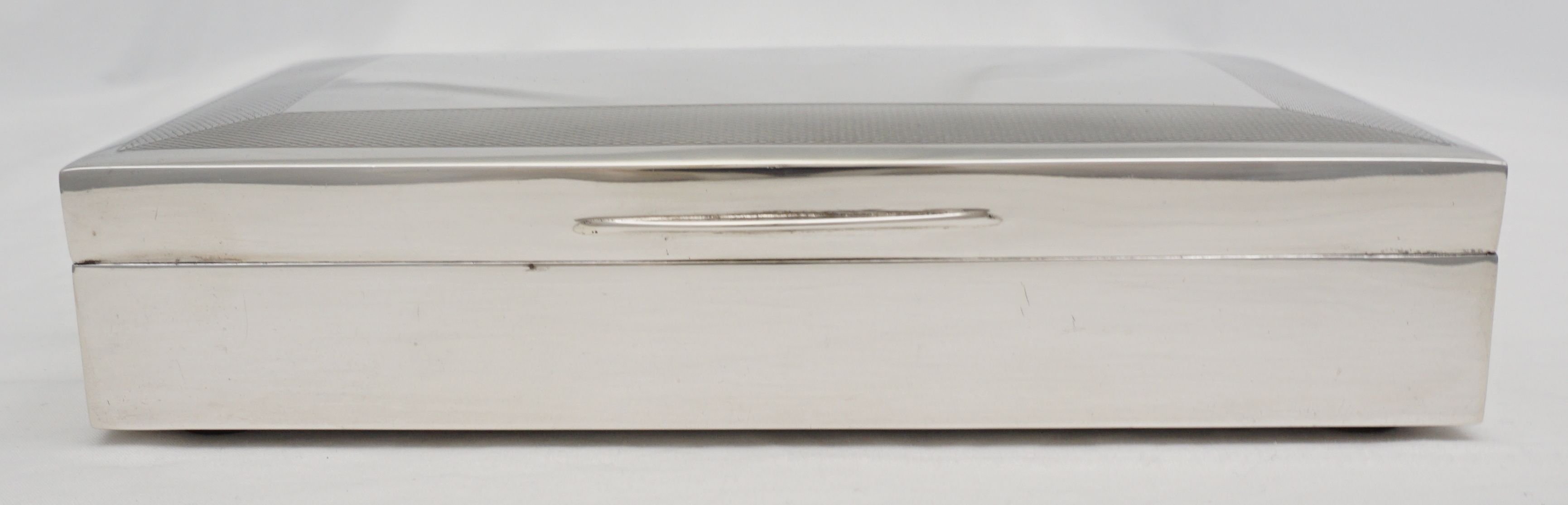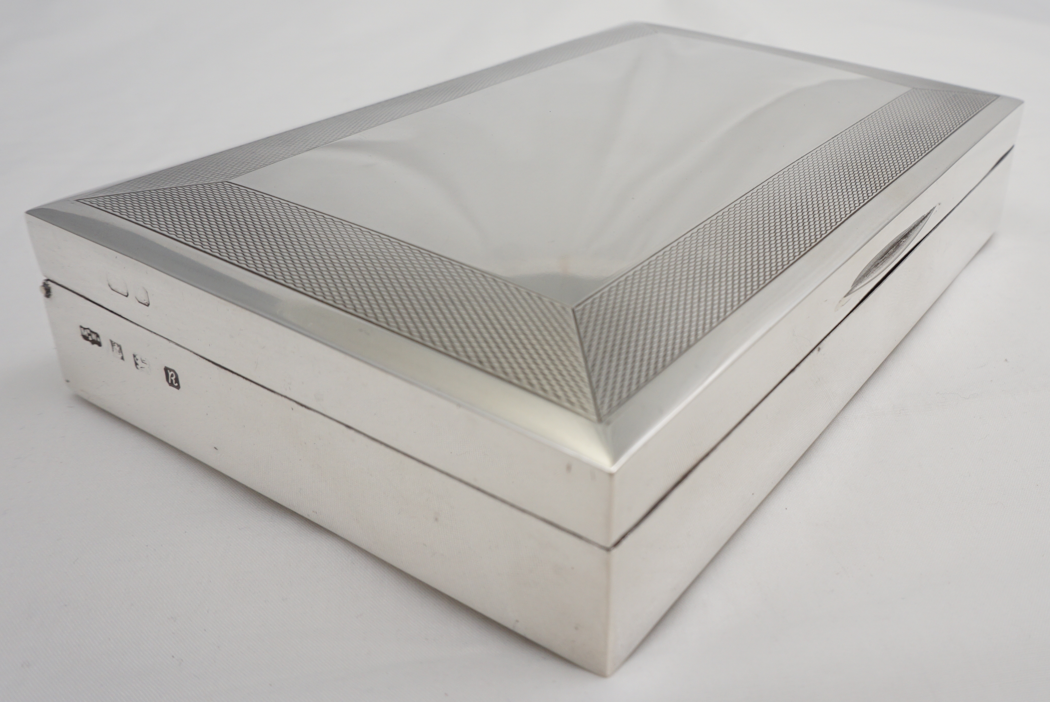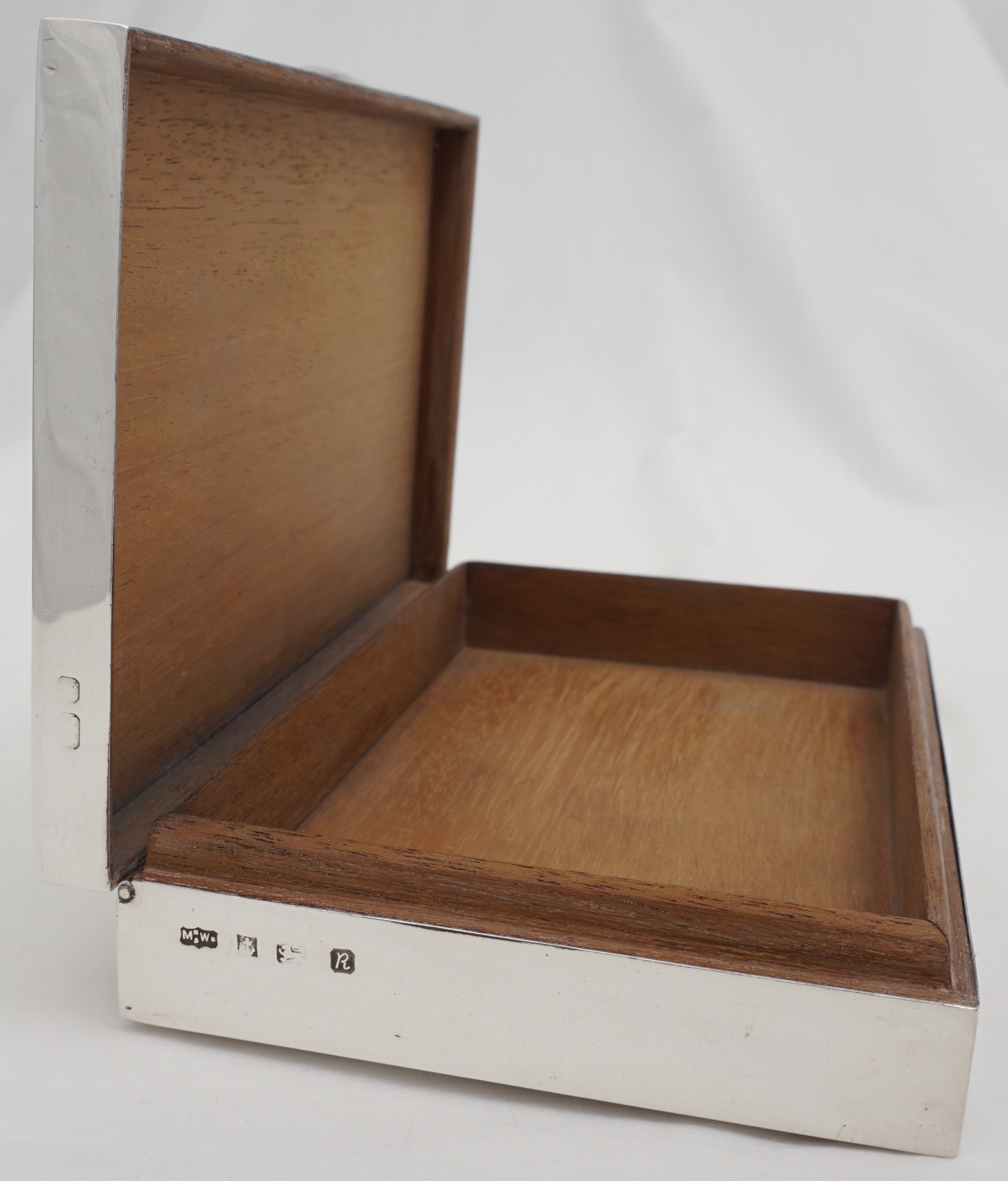 DESCRIPTION | Very good English sterling silver box with engine turned engraved decoration and cedar wood interior. Originally intended for cigarettes but now more likely used for jewellery or herbs. |