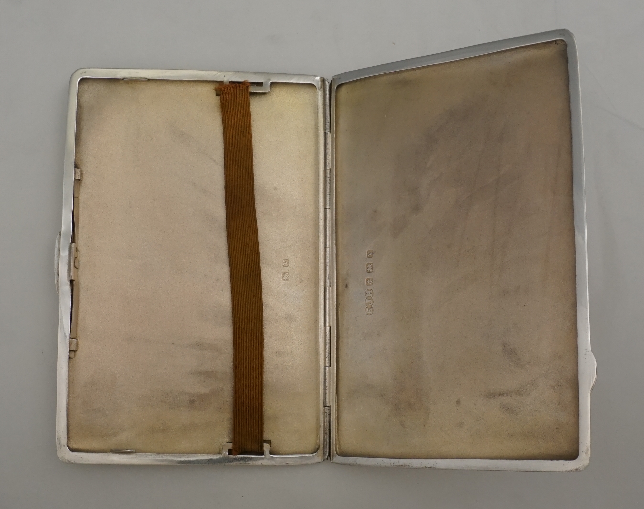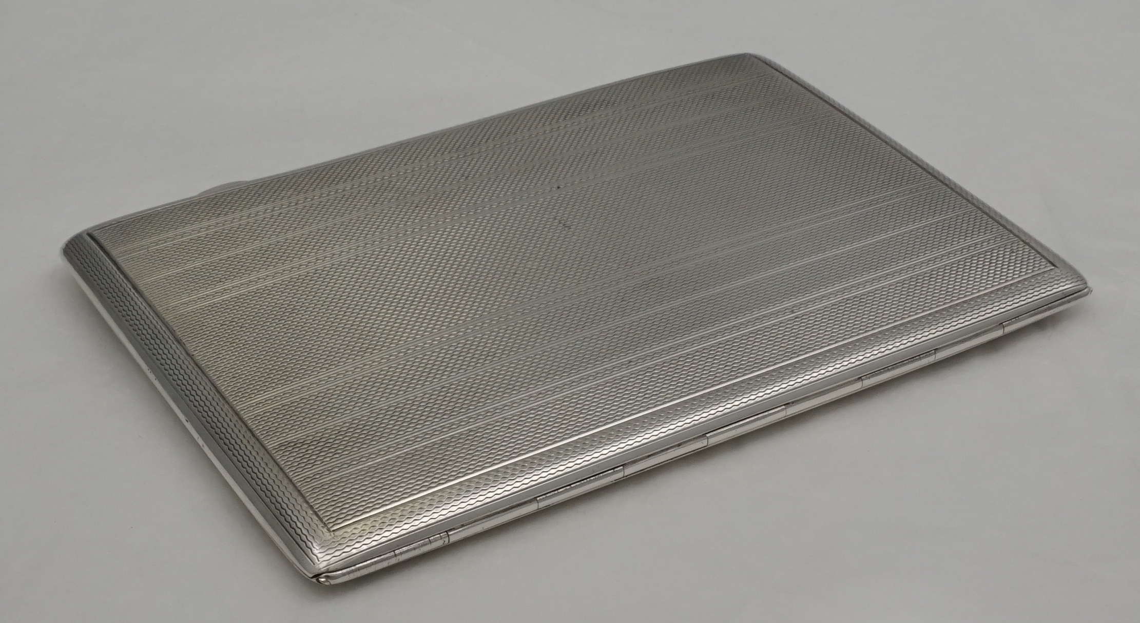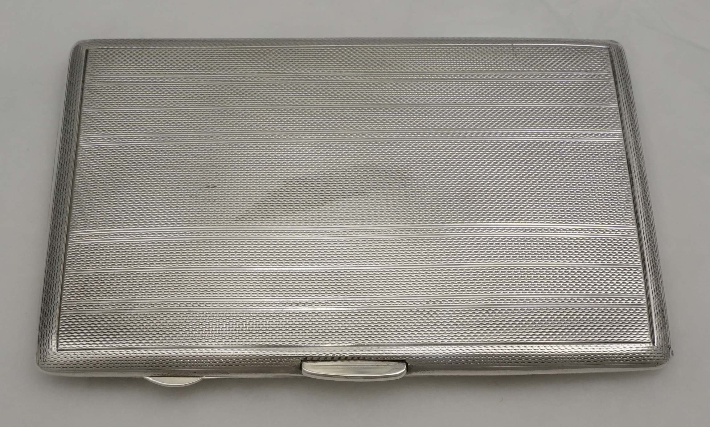 DESCRIPTION | Good quality and surprisingly heavy English solid sterling silver cigarette case with engine turned engraved decoration and a matt gilded interior. |