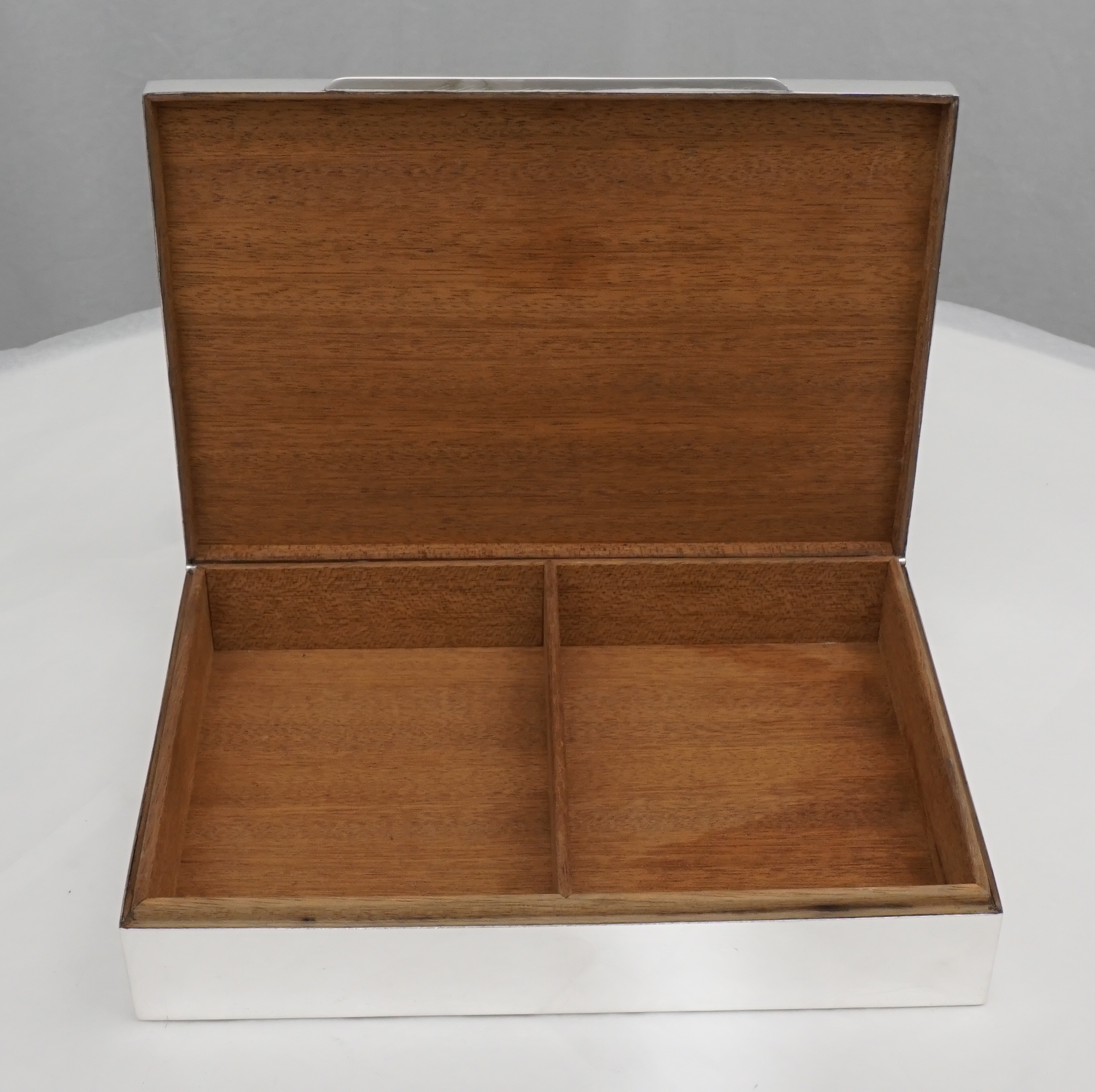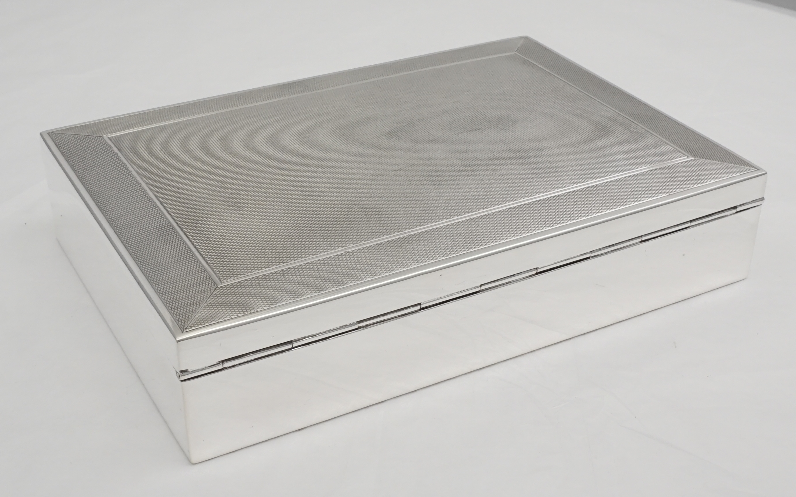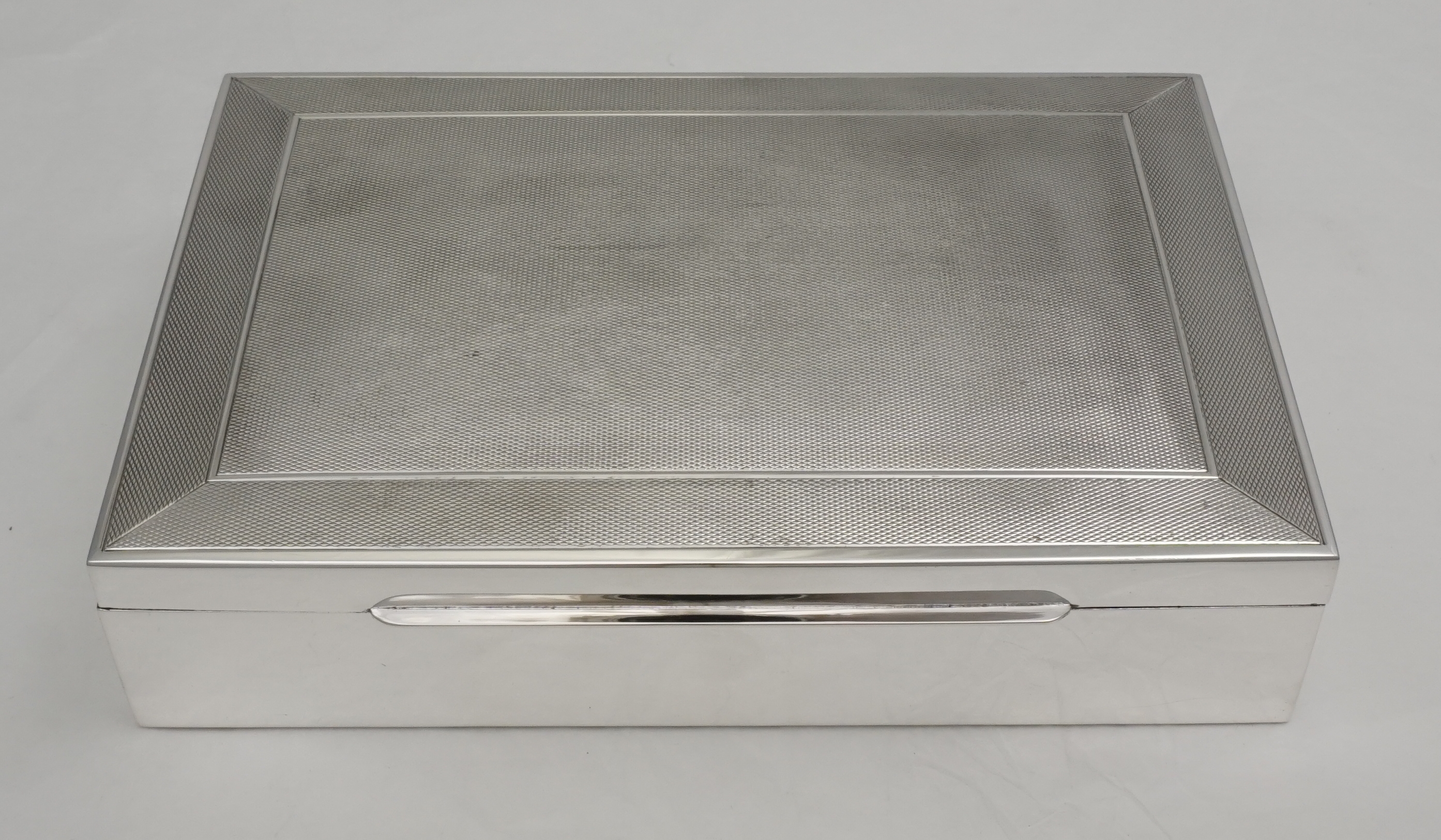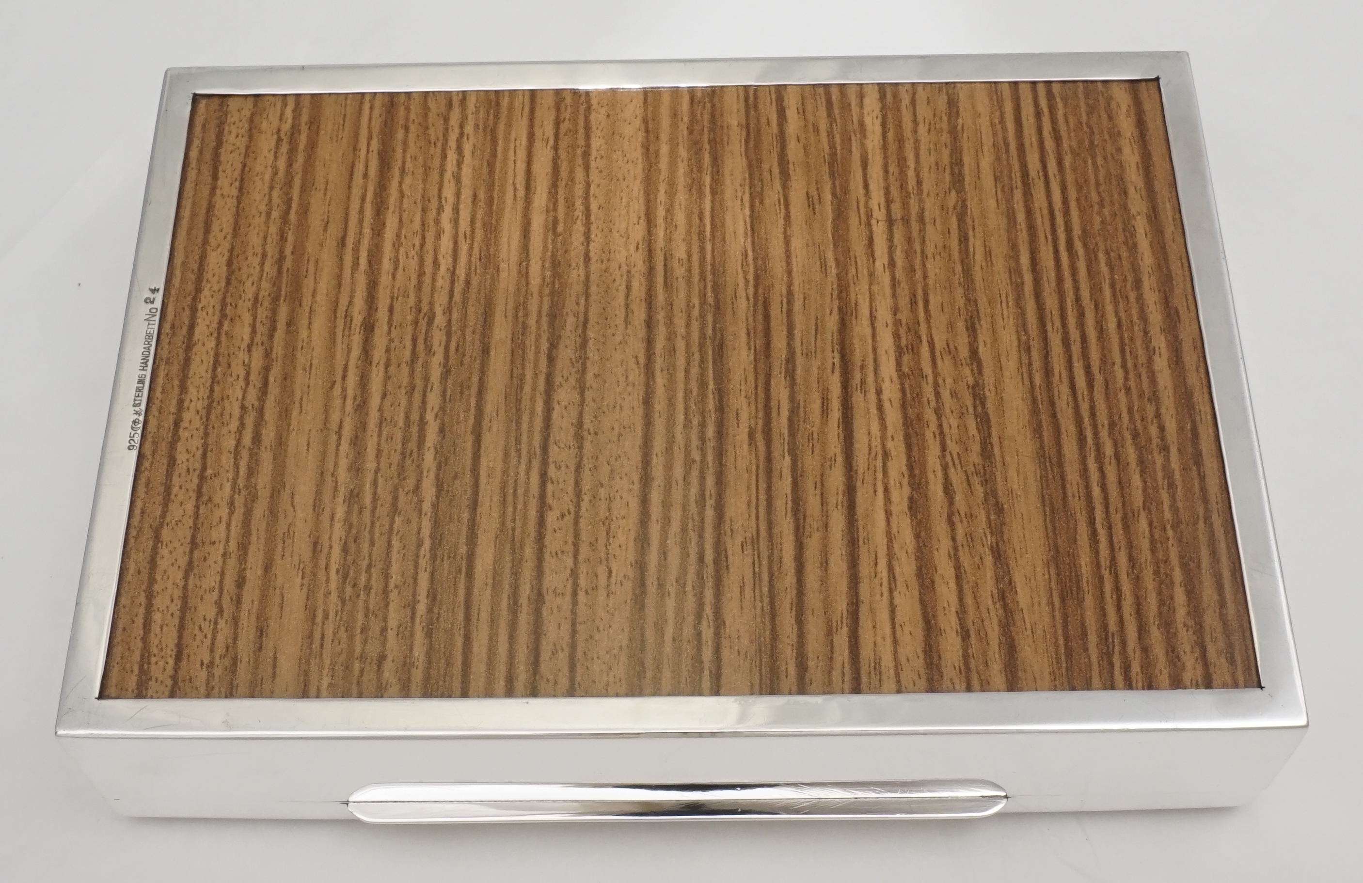 DESCRIPTION | High quality and beautifully made German solid sterling silver box with engine turned engraved decoration and a cedar wood lined interior. Marked 'HANDARBEIT' to base meaning handmade. Wood effect base plate is synthetic, not real wood. Originally intended for cigarettes but now more likely used for jewellery or herbs. |
