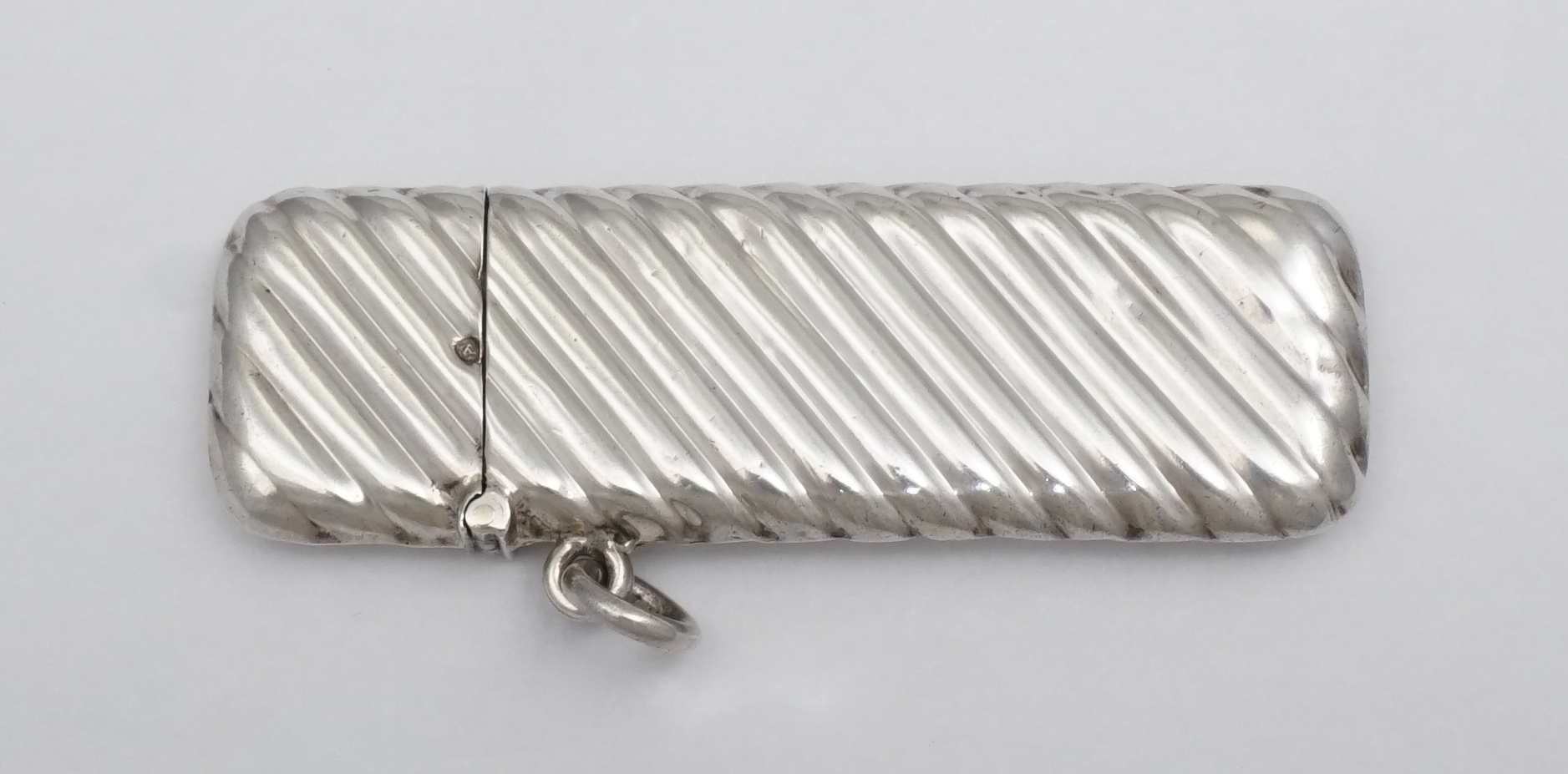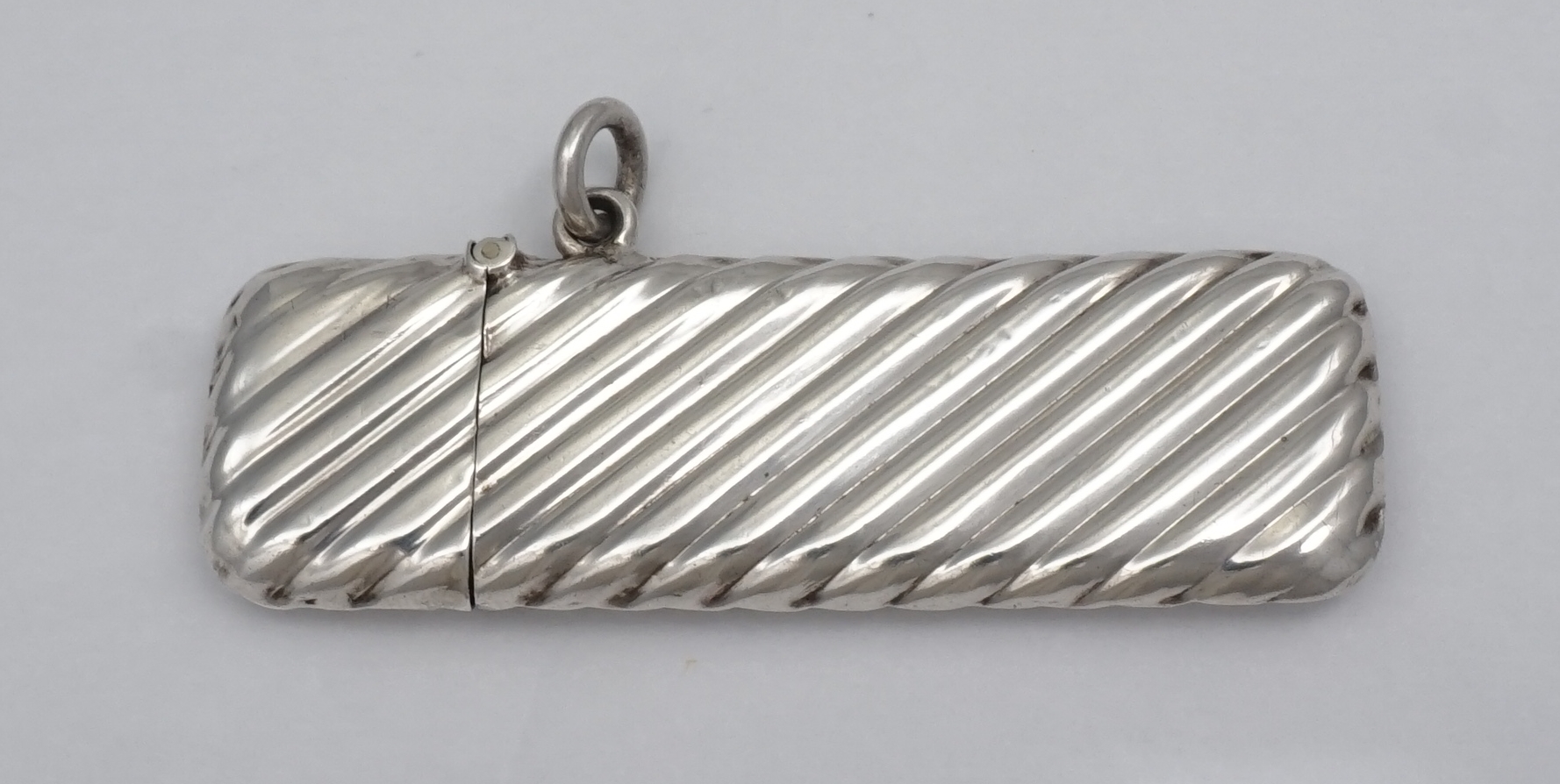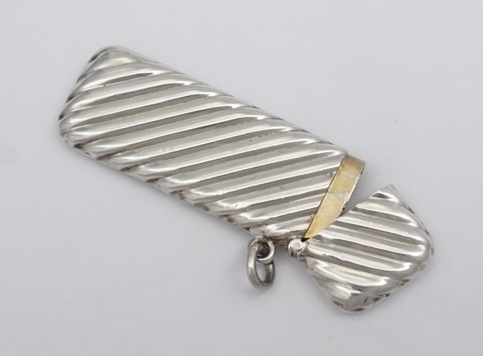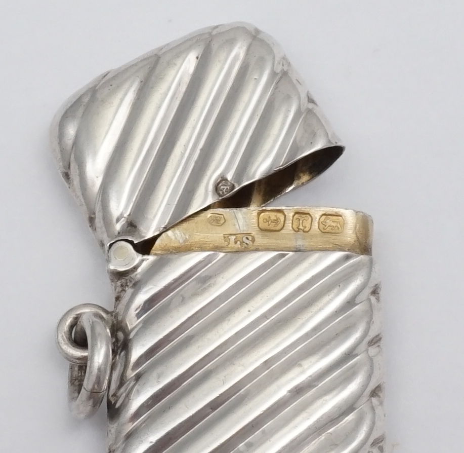 DESCRIPTION | Antique English solid sterling silver toothpick box with spiral fluted decoration, hinged lid, suspension ring and fully gilded interior. |