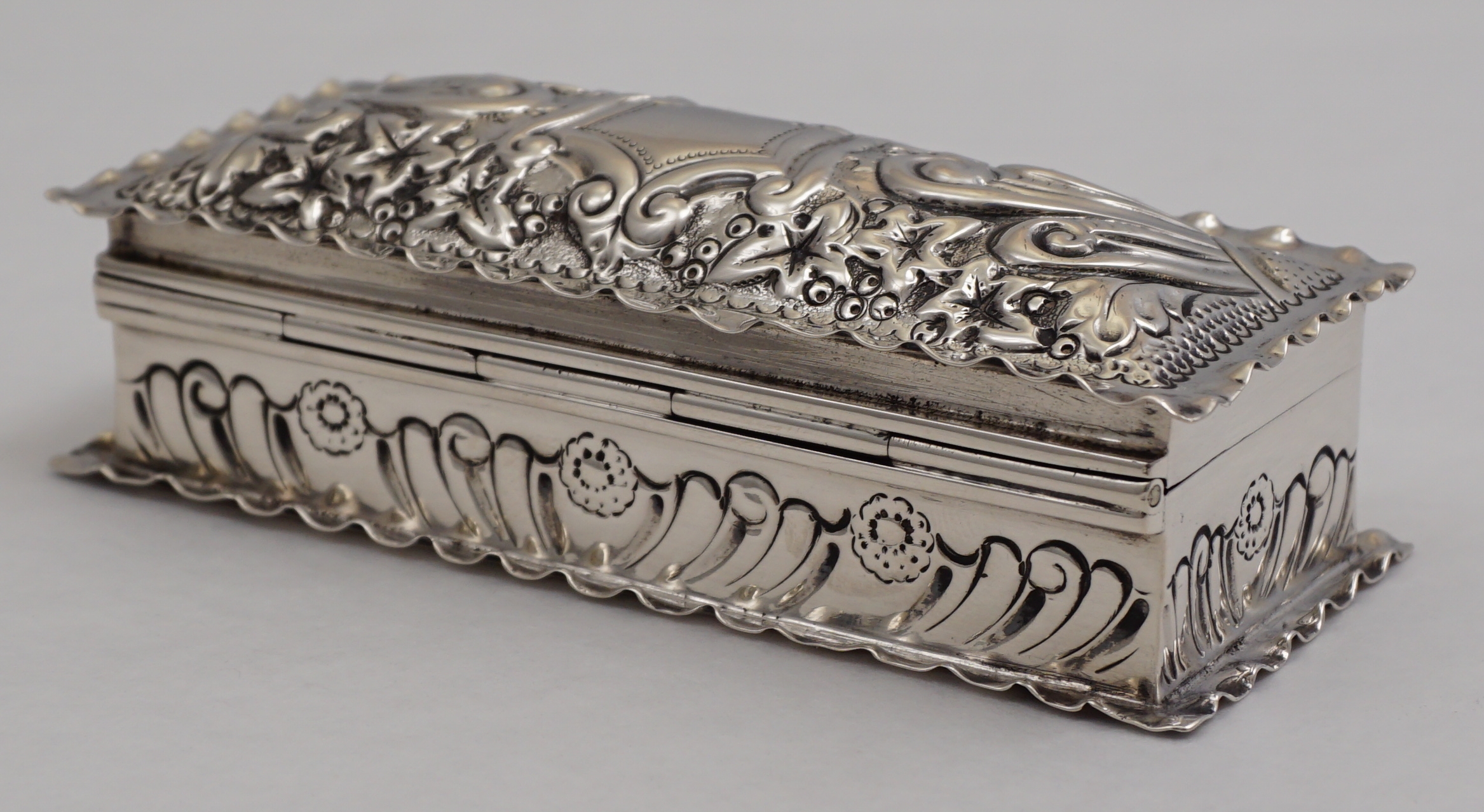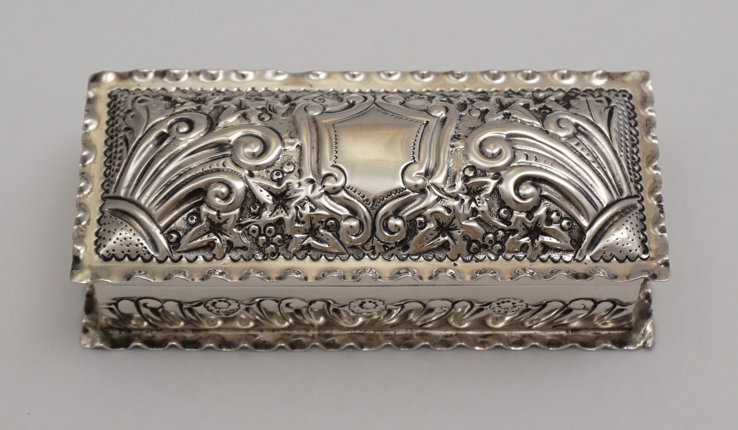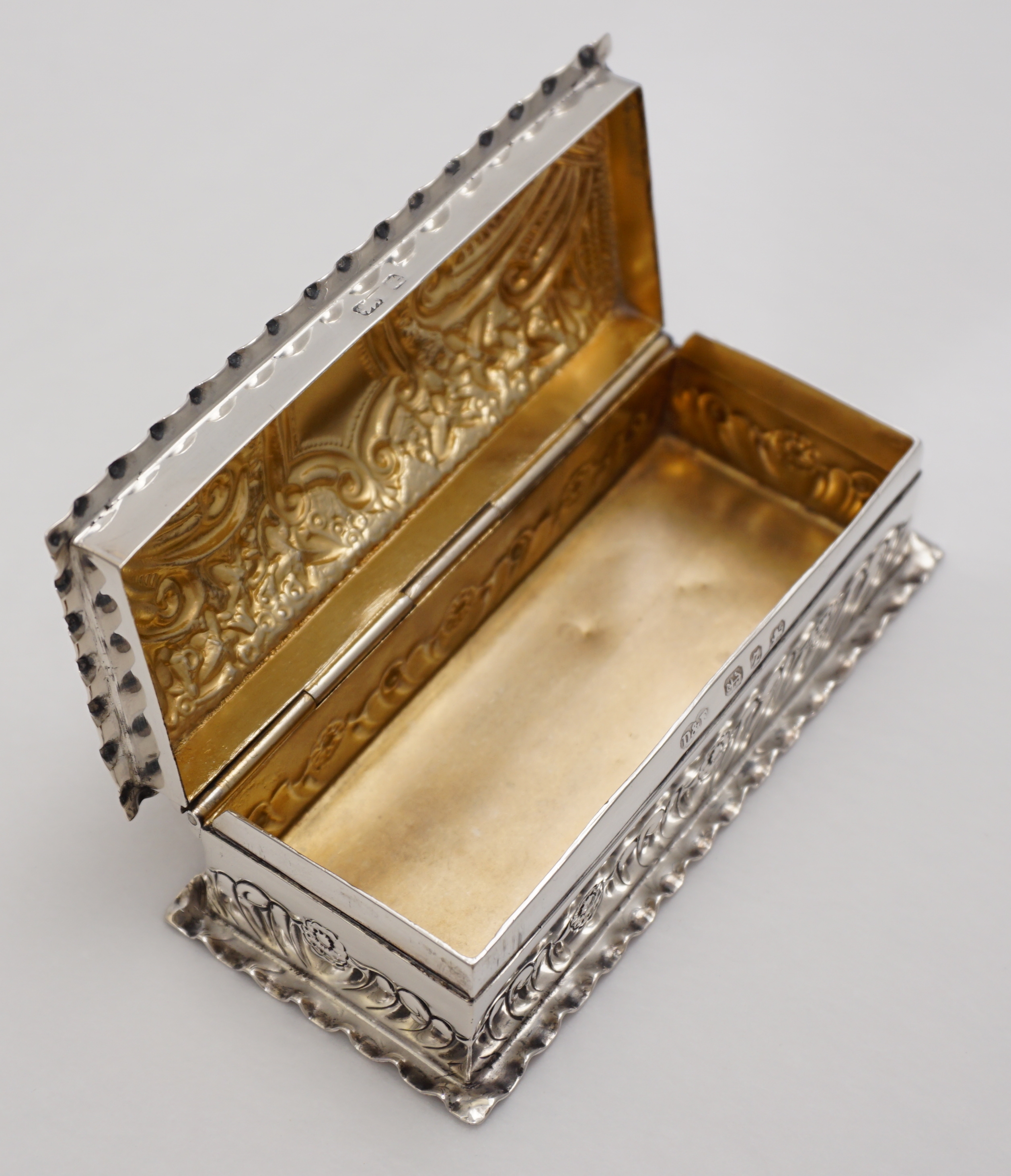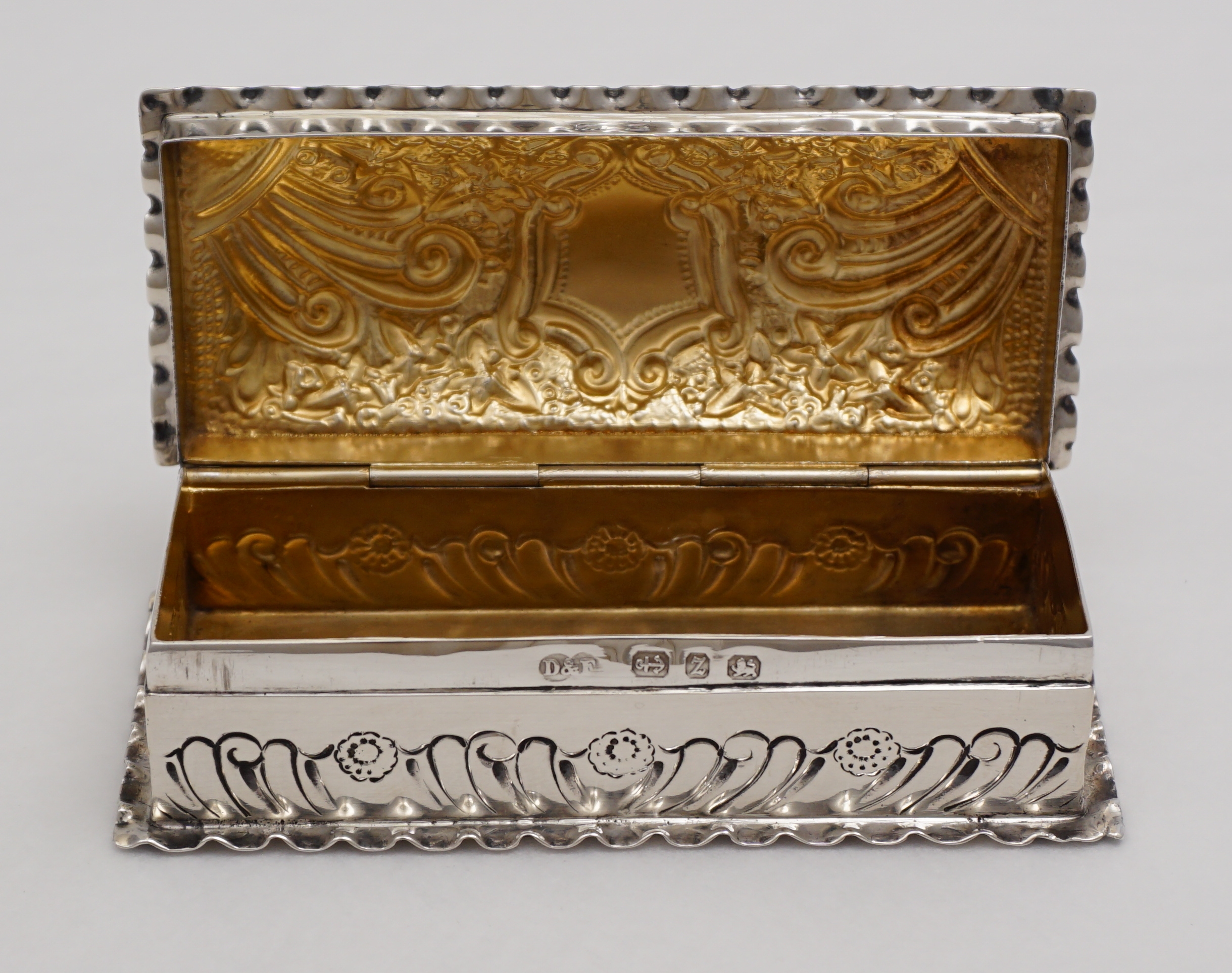 DESCRIPTION | Very good antique English Victorian solid sterling silver tooth pick box with embossed and engraved decoration and a fully gilded interior. |