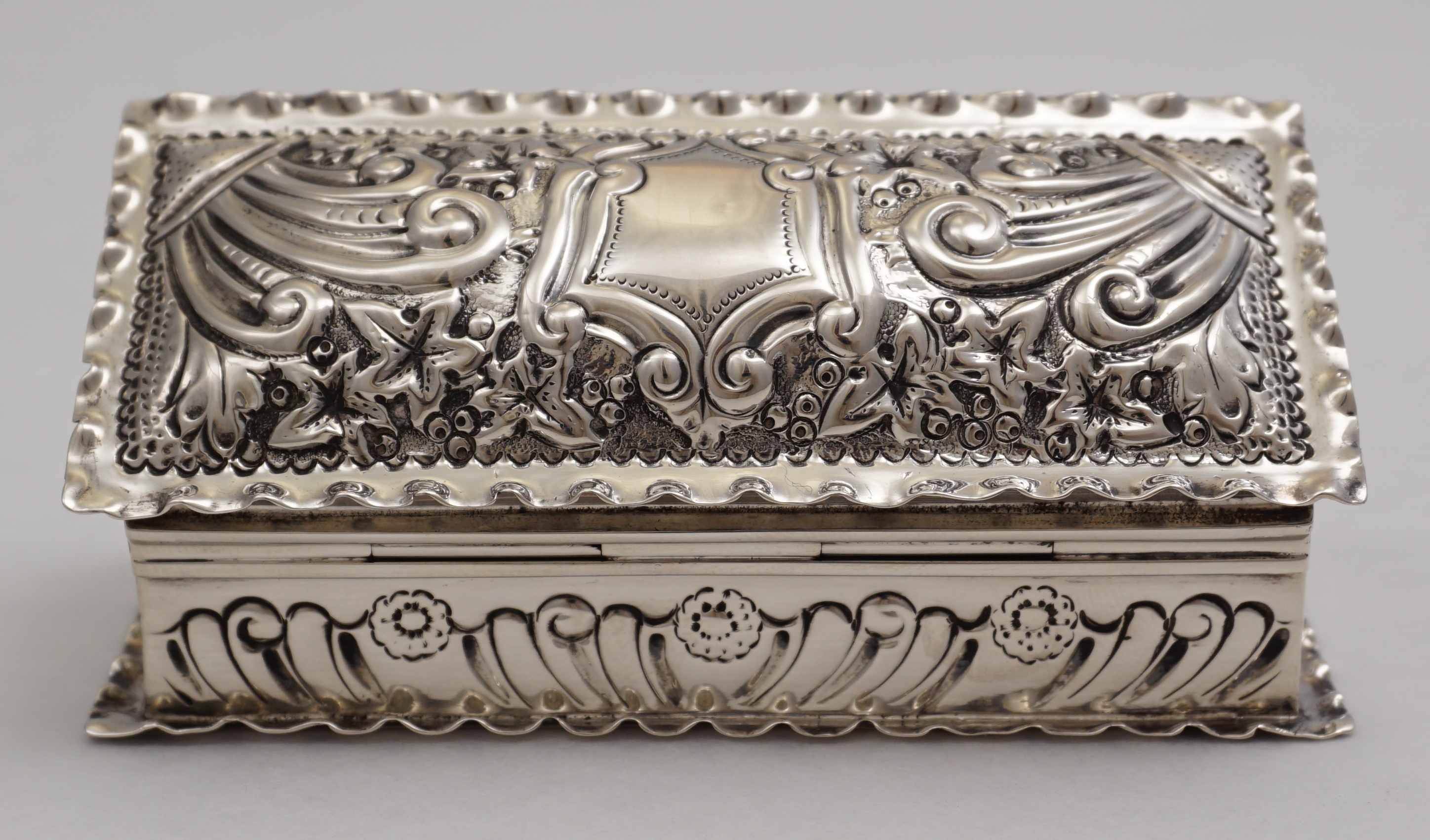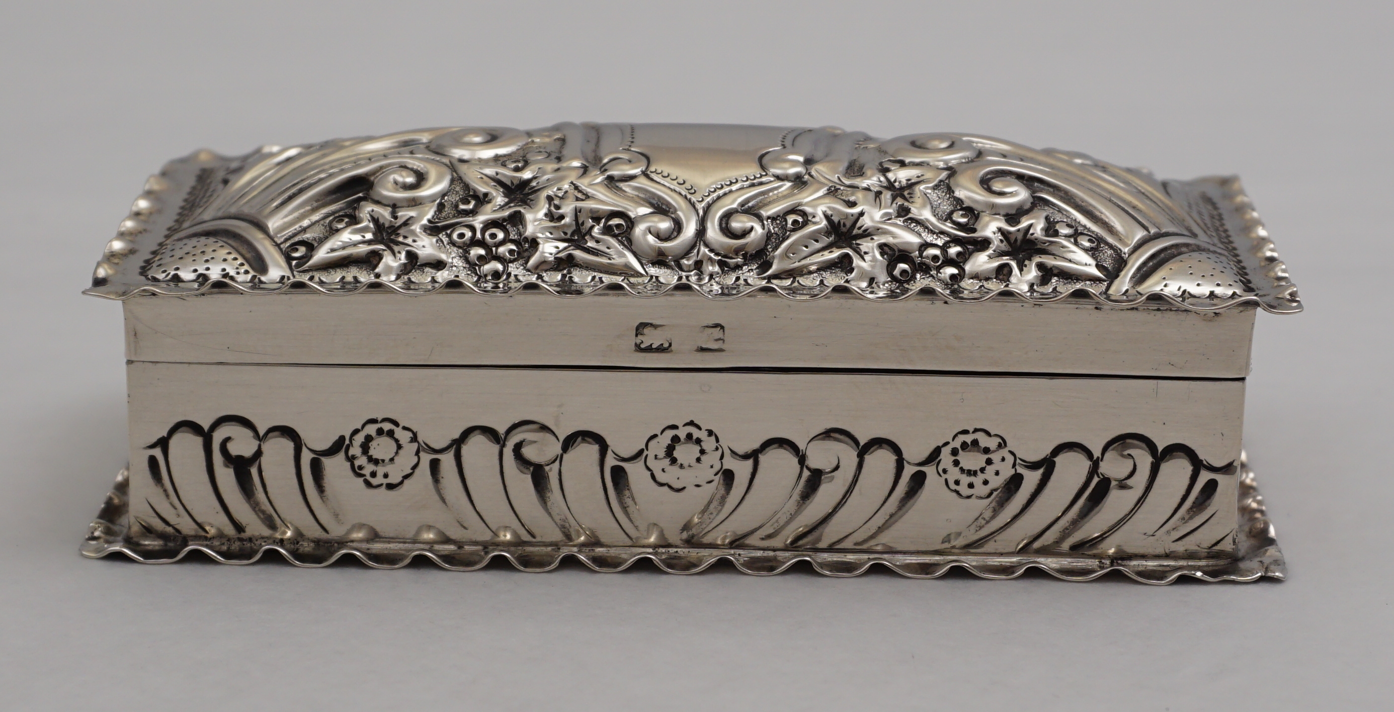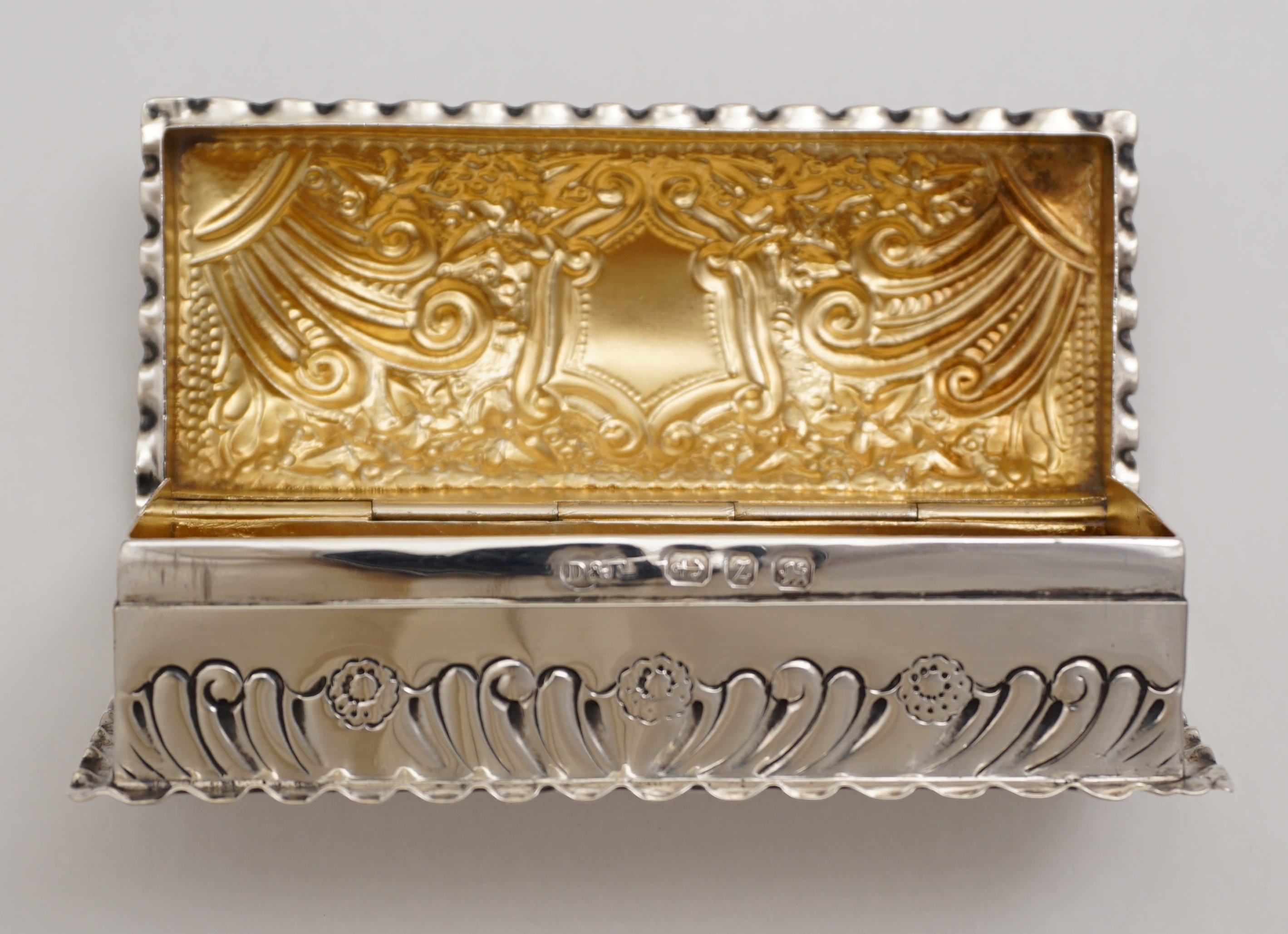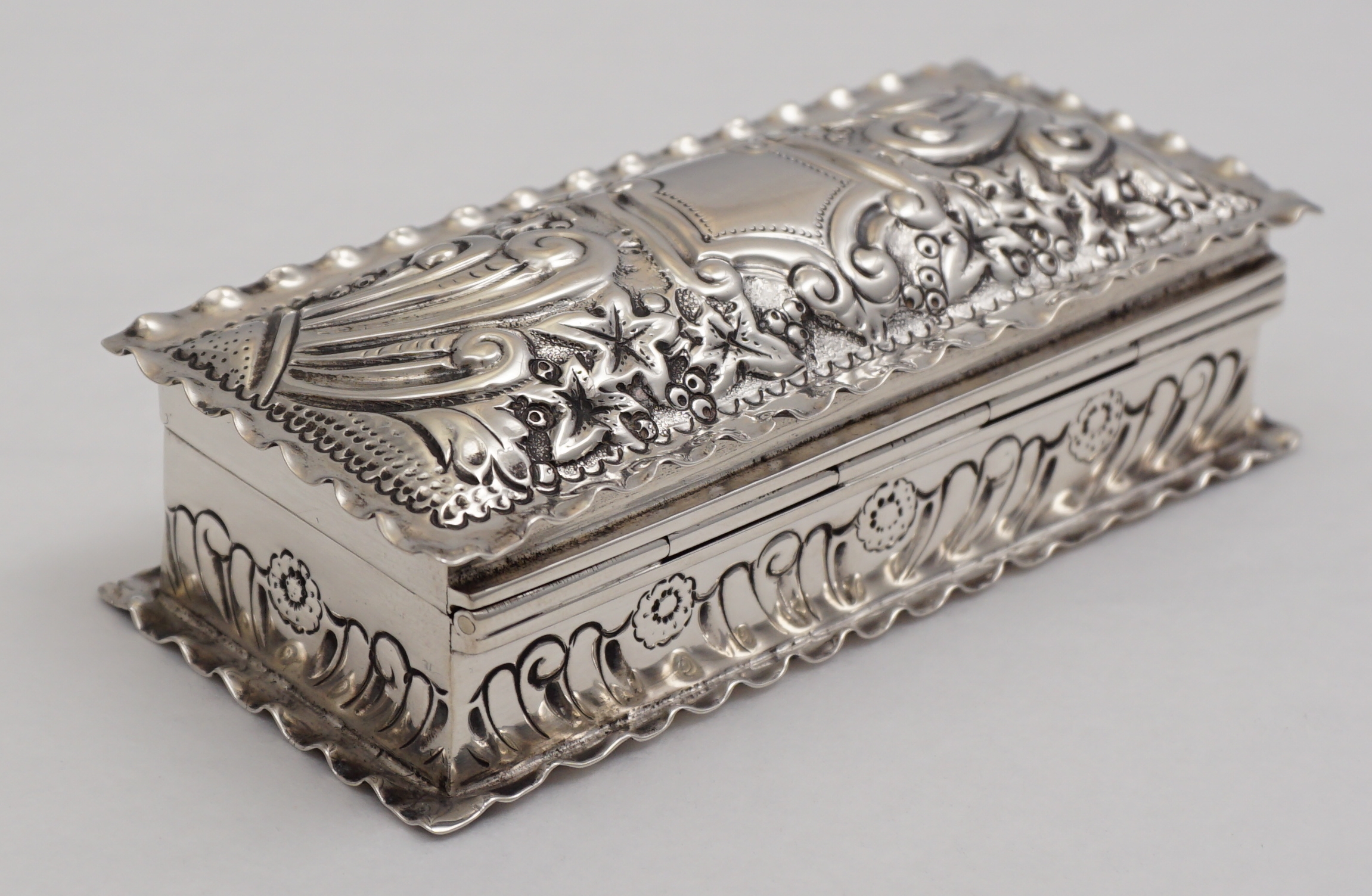 DESCRIPTION | Very good antique English Victorian solid sterling silver tooth pick box with embossed and engraved decoration and a fully gilded interior. |