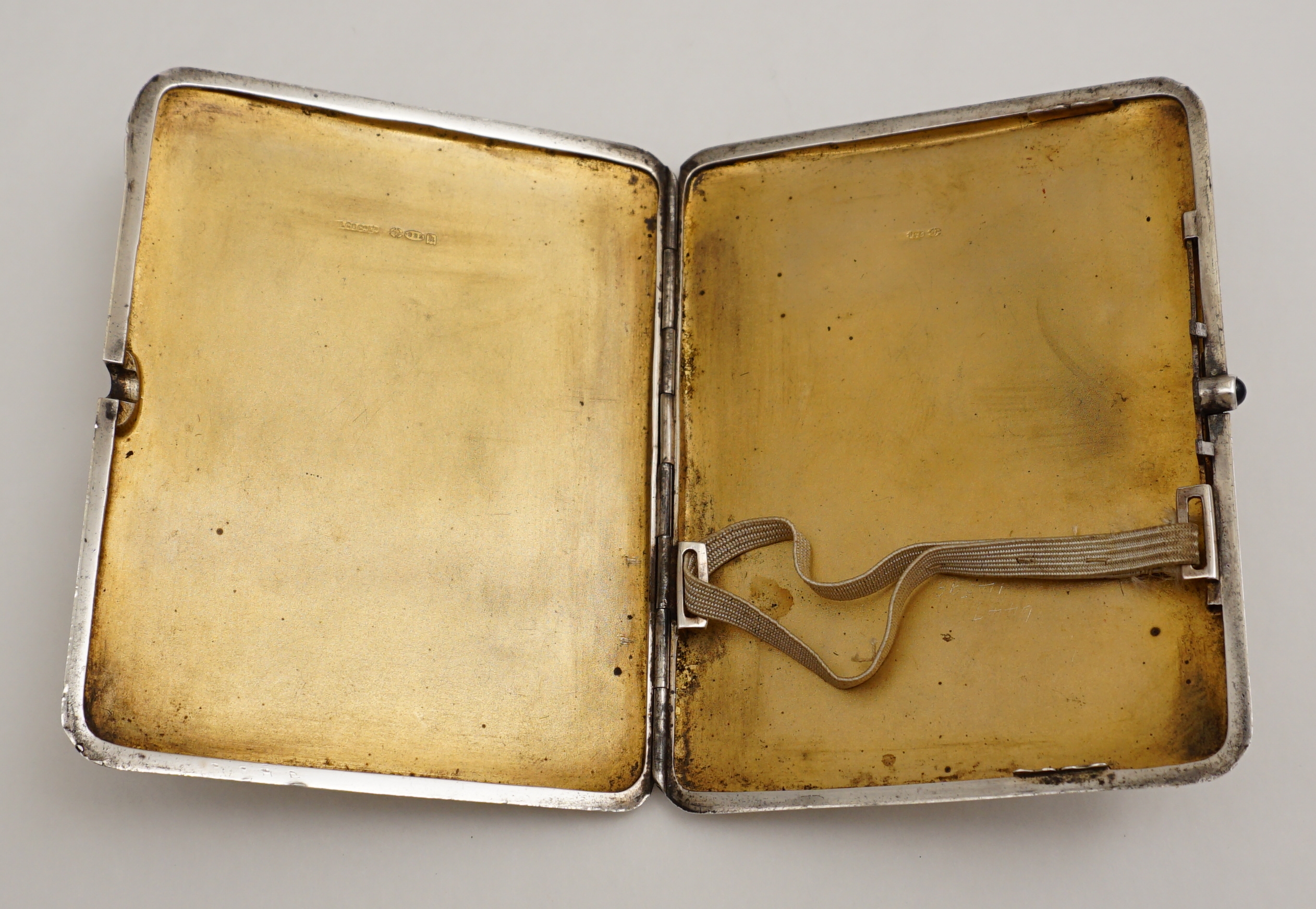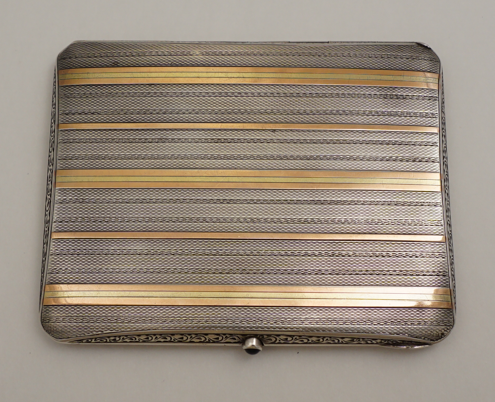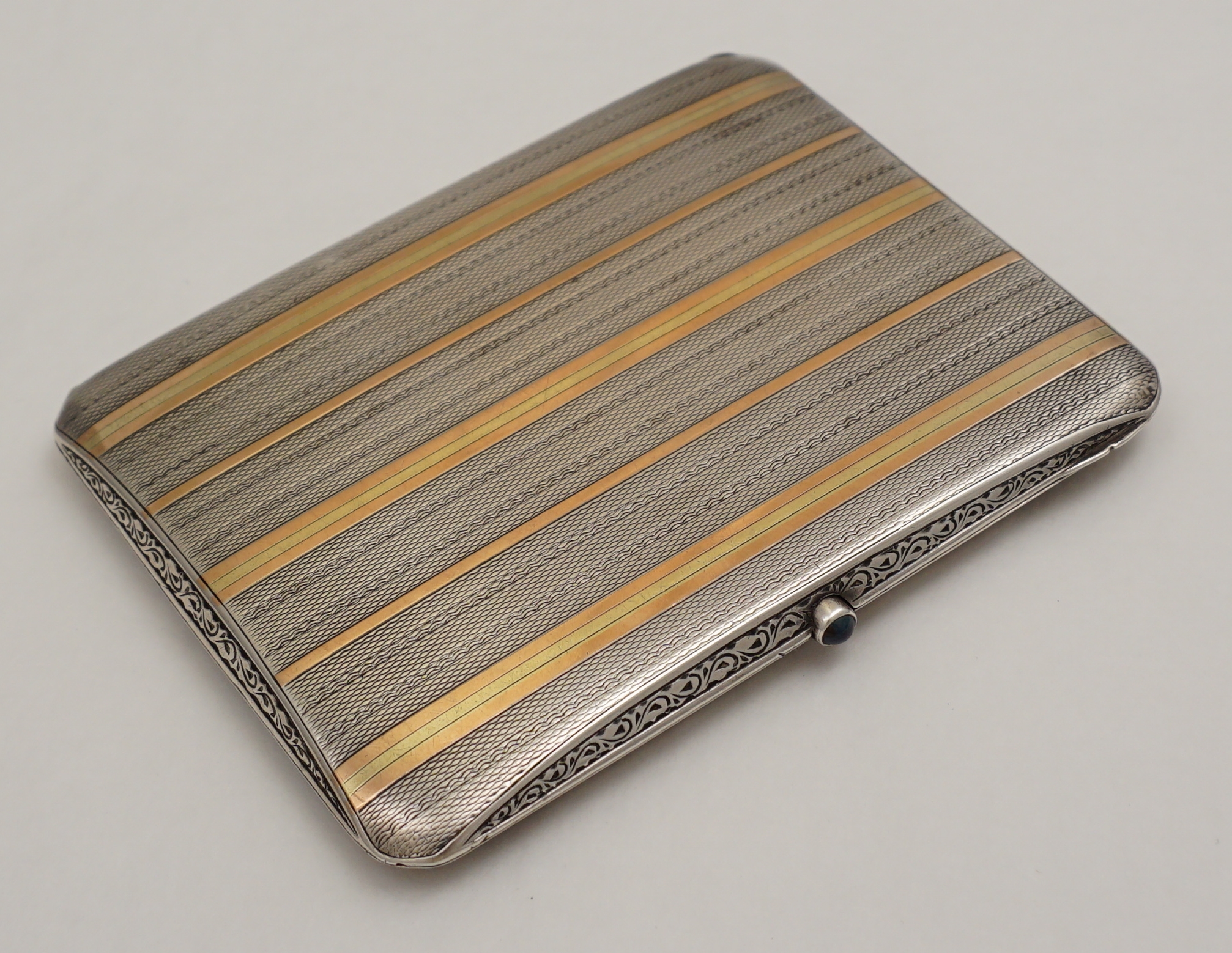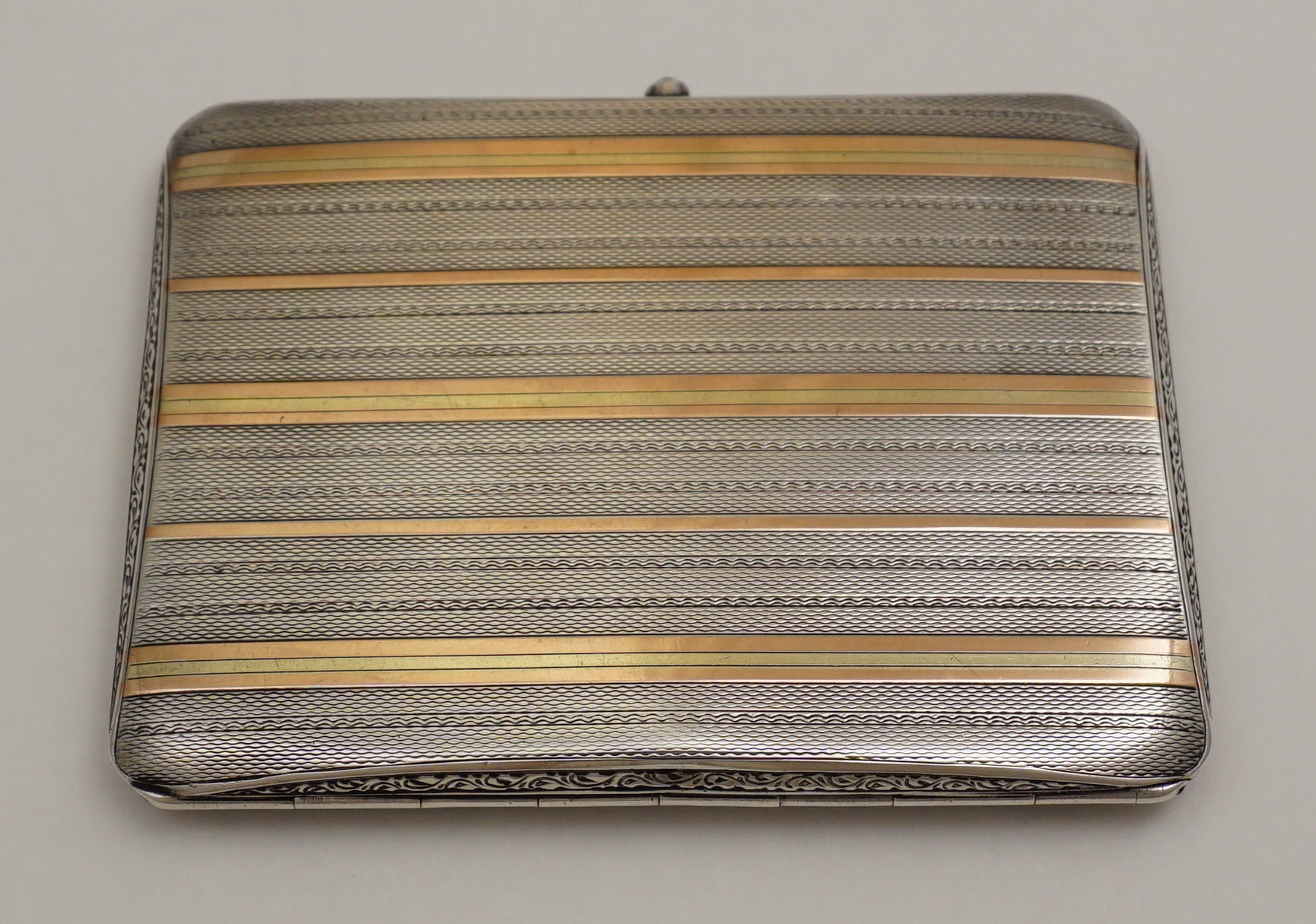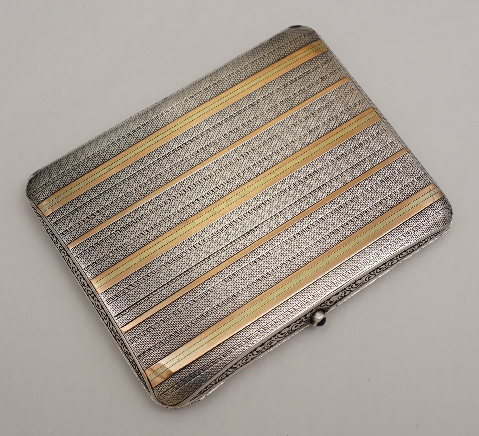 DESCRIPTION | Stunningly beautiful and highest quality vintage solid sterling silver cigarette case with engine turned engraved decoration overlaid with gold bands of two colours, a matt gilded interior and cabochon gem set catch. The gem maybe a fabulous sapphire or simply glass, I do not know. Case fits modern credit cards very well. |