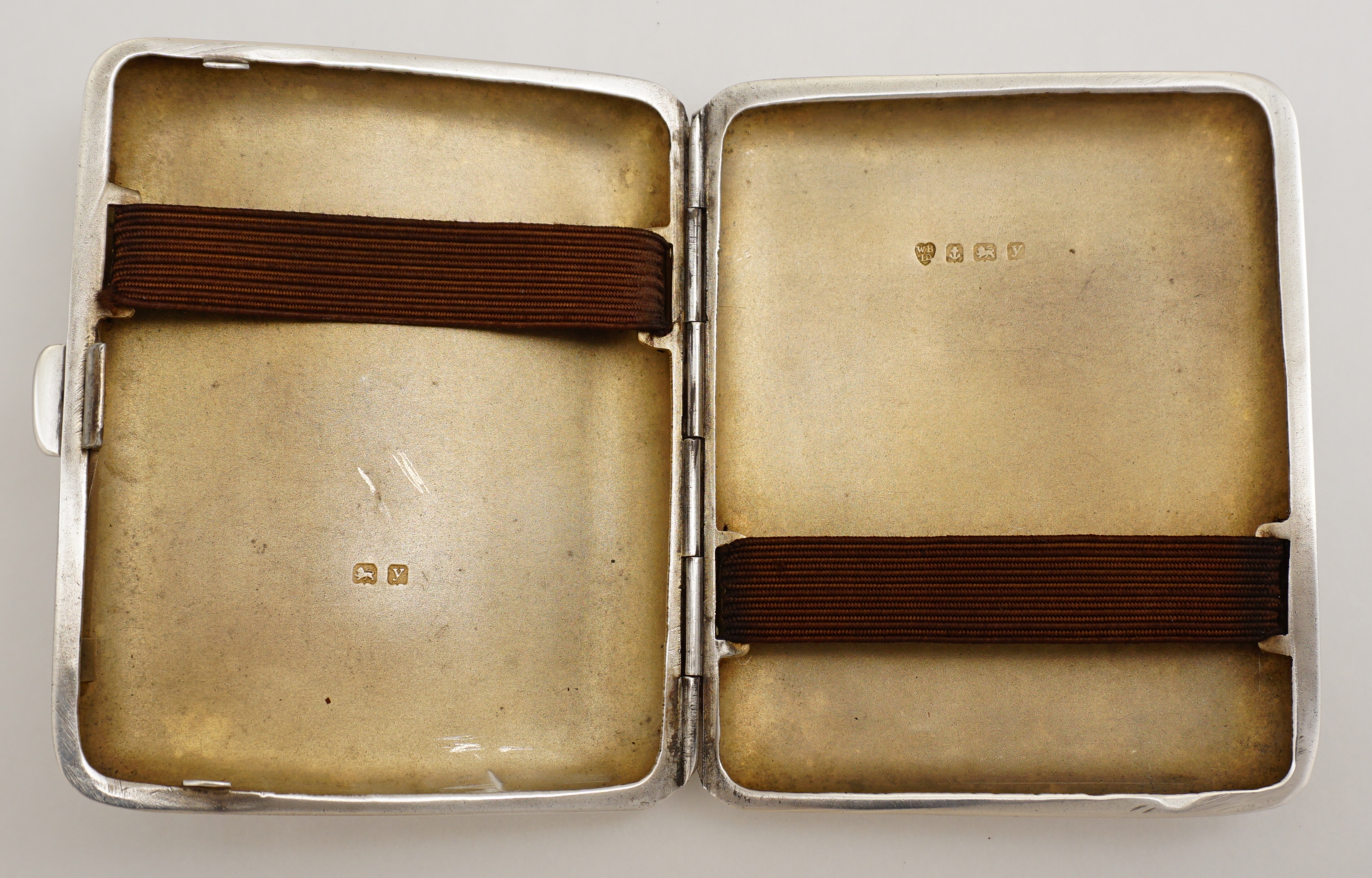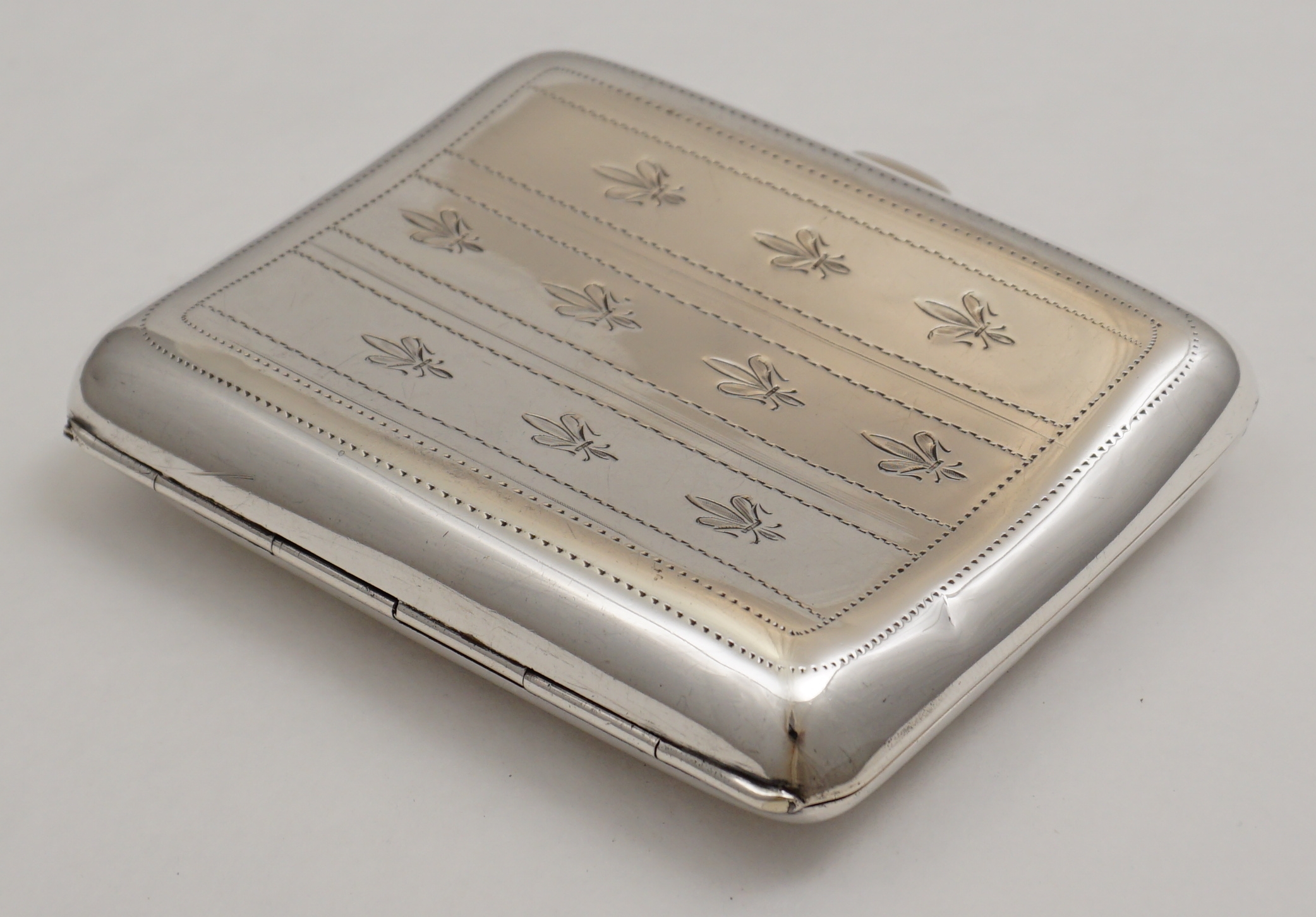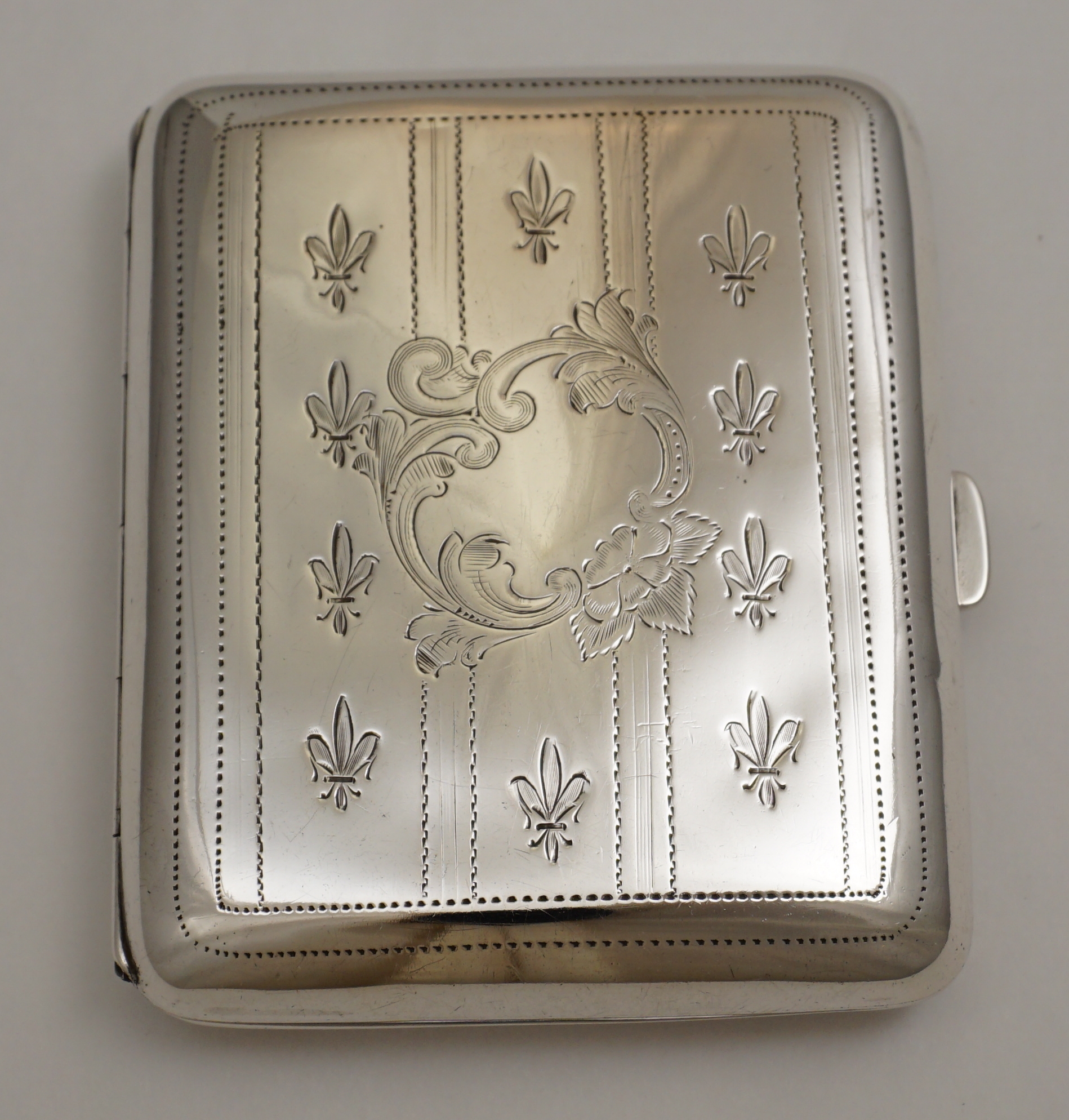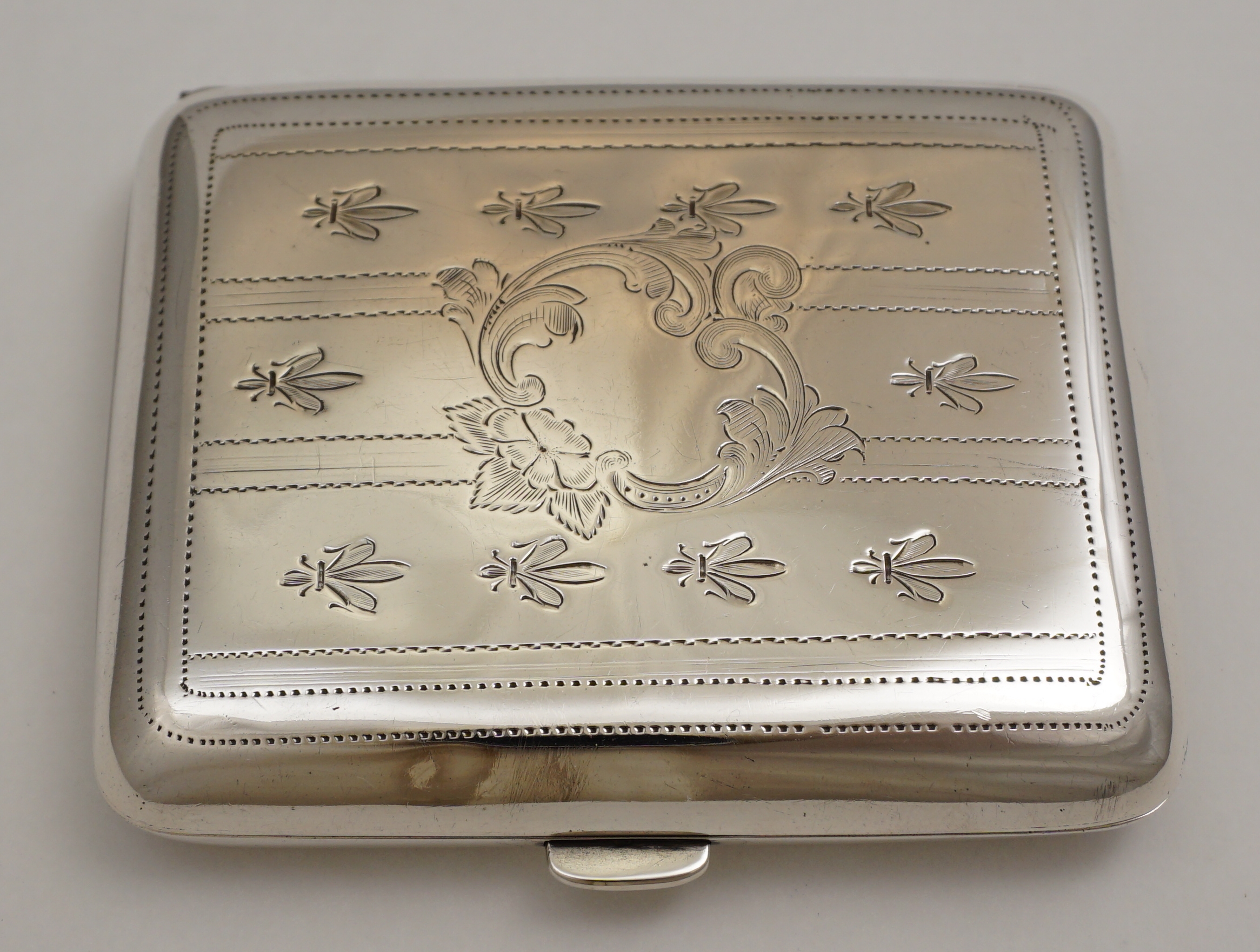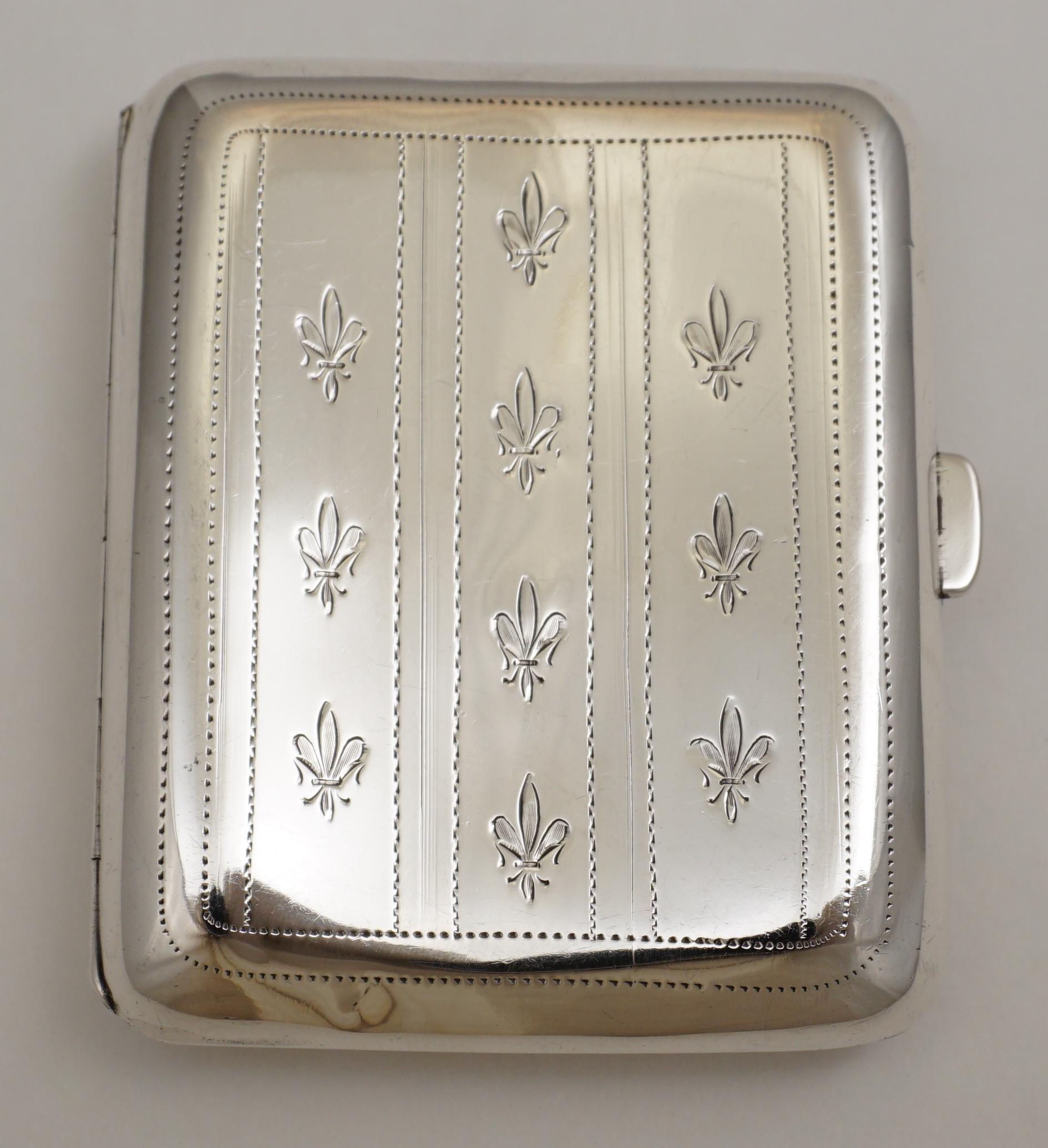 DESCRIPTION | Good and chunky vintage English solid sterling silver cigarette case with fleurs-de-lys engraved decoration, blank rococo cartouche and a matt gilded interior. A deep case designed for cigarettes both sides. |