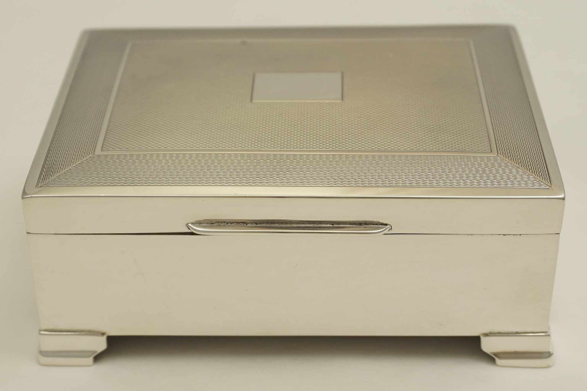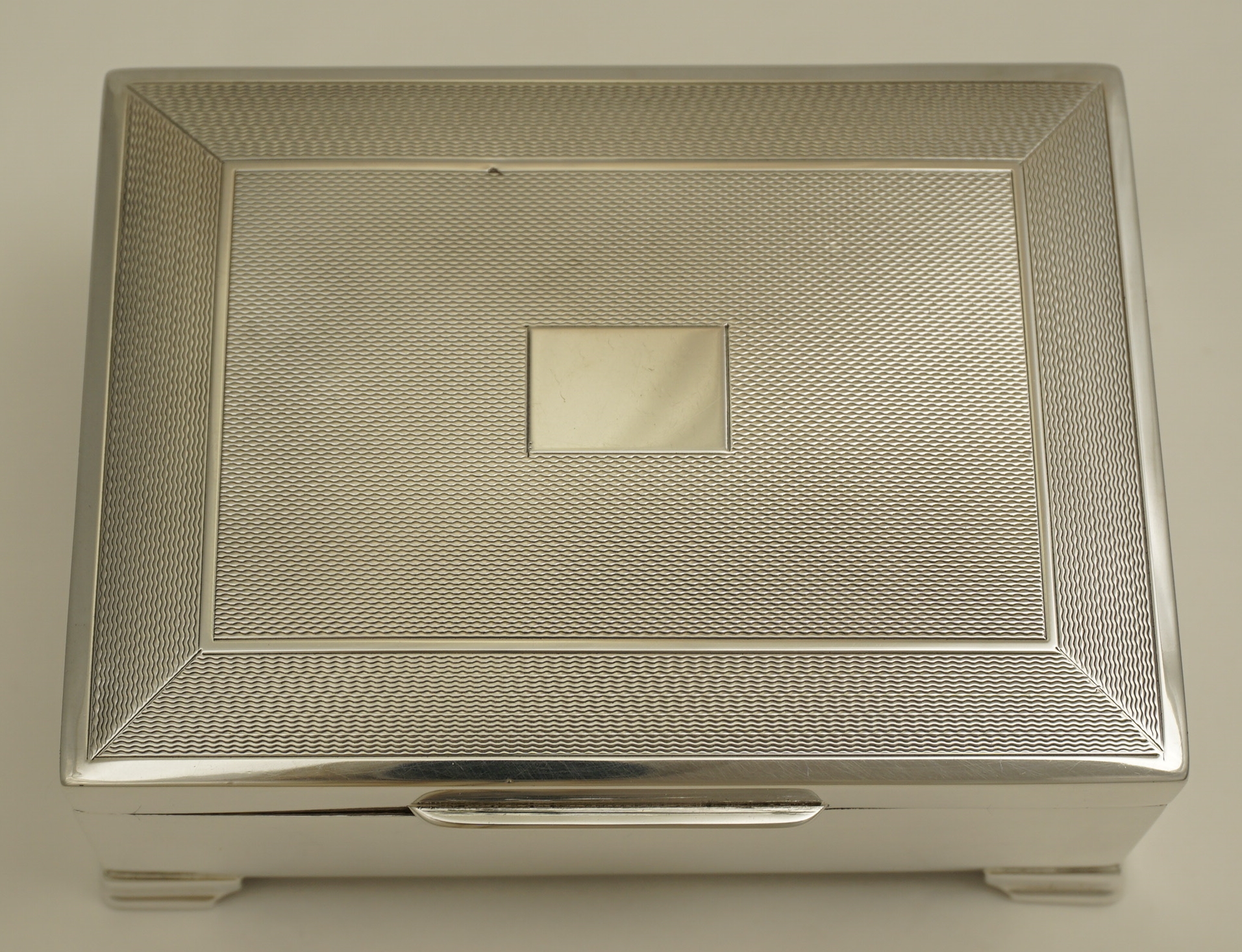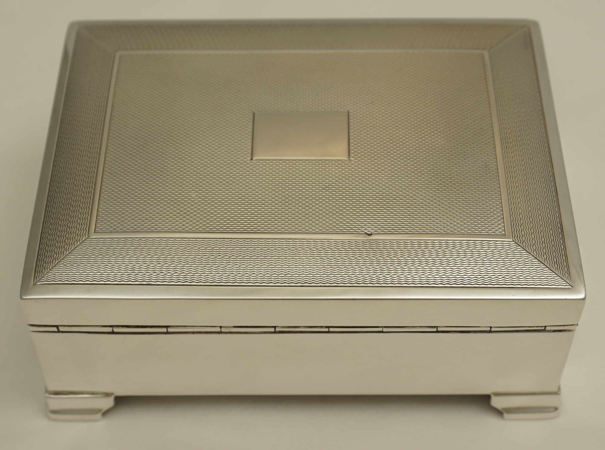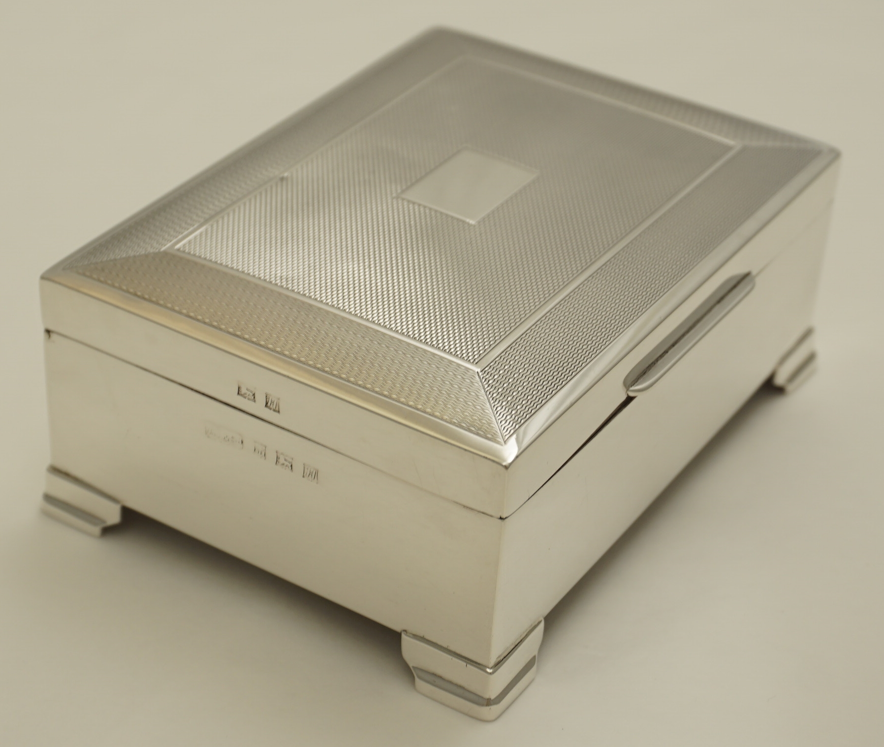 DESCRIPTION | Vintage English solid sterling silver cigarette box with engine turned engraved decoration, a blank rectangular cartouche and a cedar lined interior that still smells pleasant. |