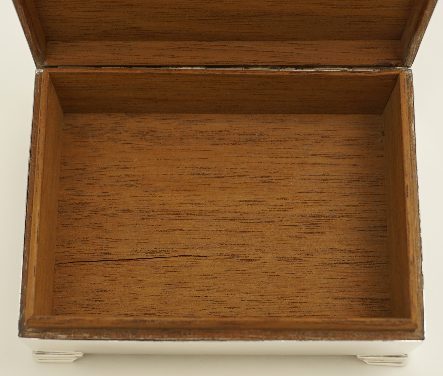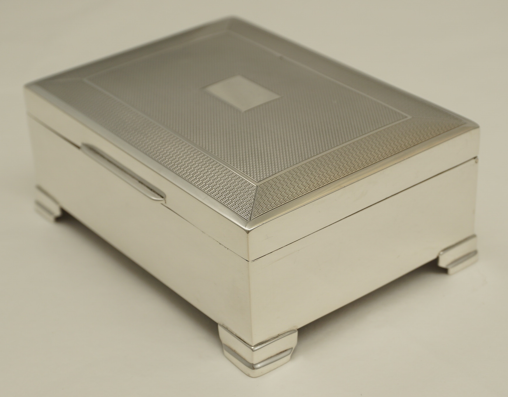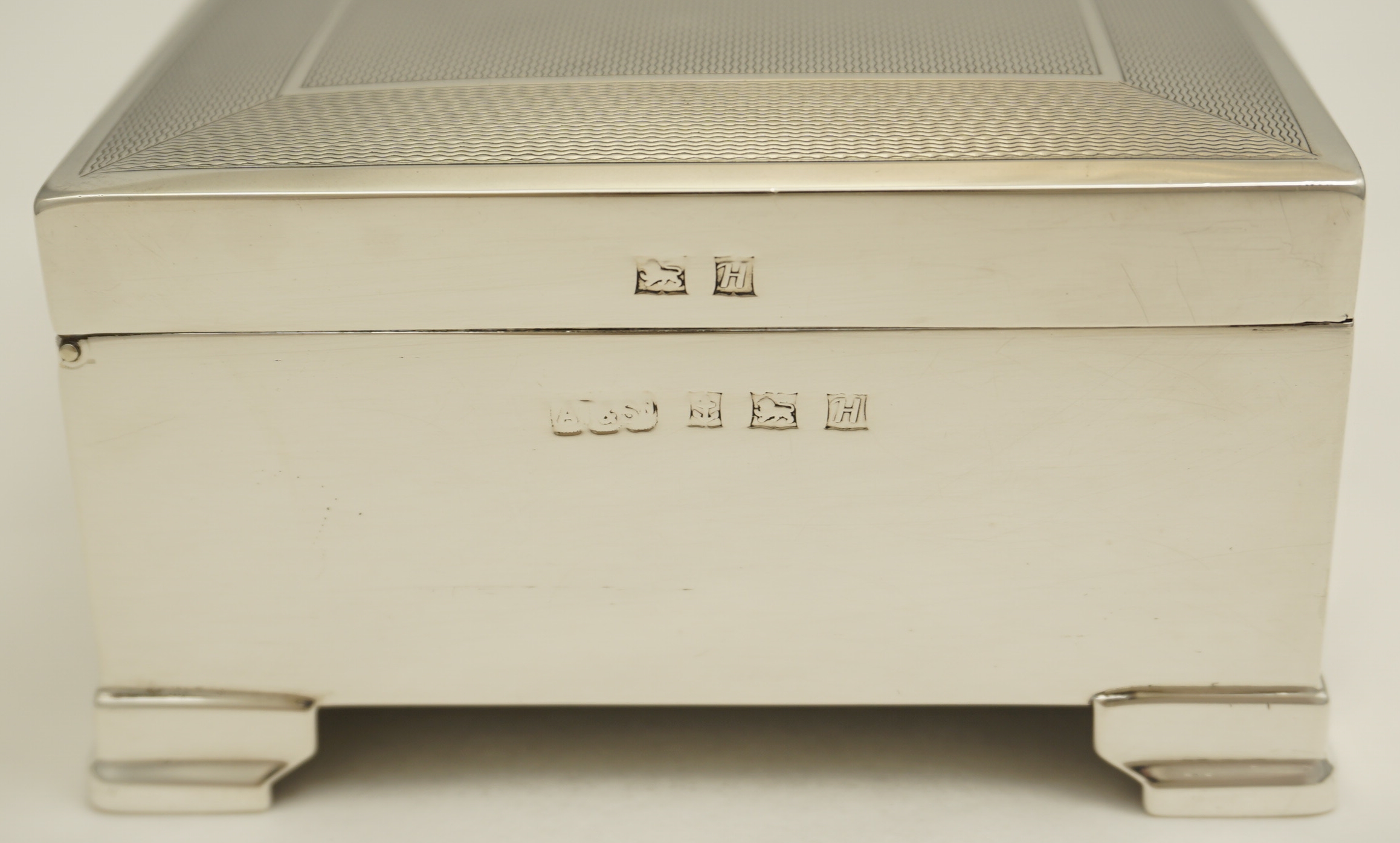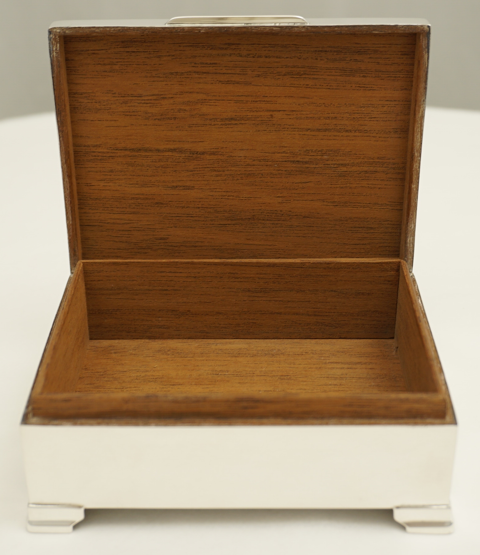 DESCRIPTION | Vintage English solid sterling silver cigarette box with engine turned engraved decoration, a blank rectangular cartouche and a cedar lined interior that still smells pleasant. |
