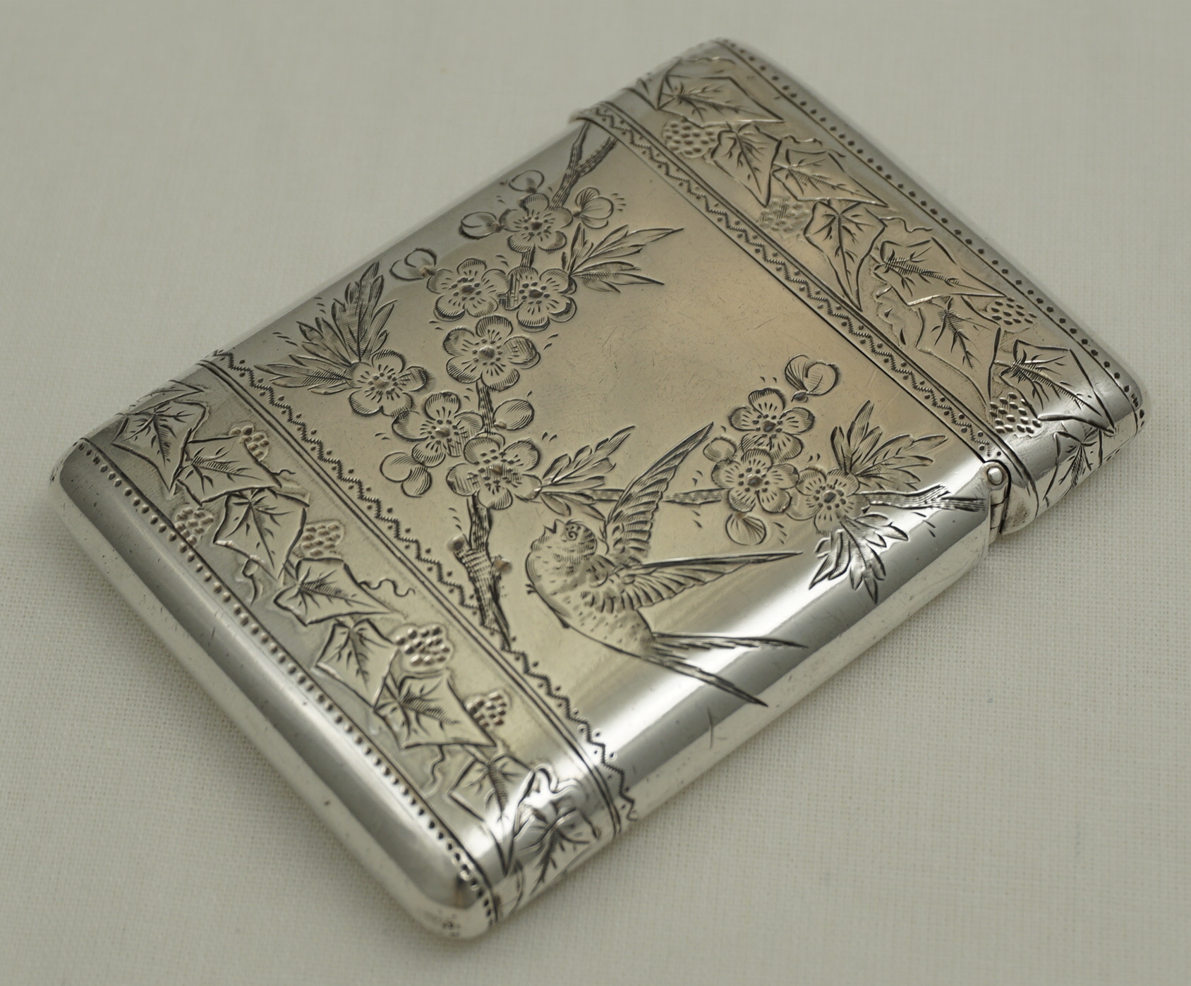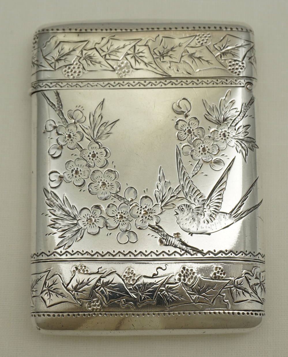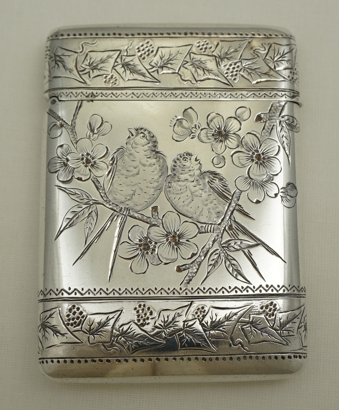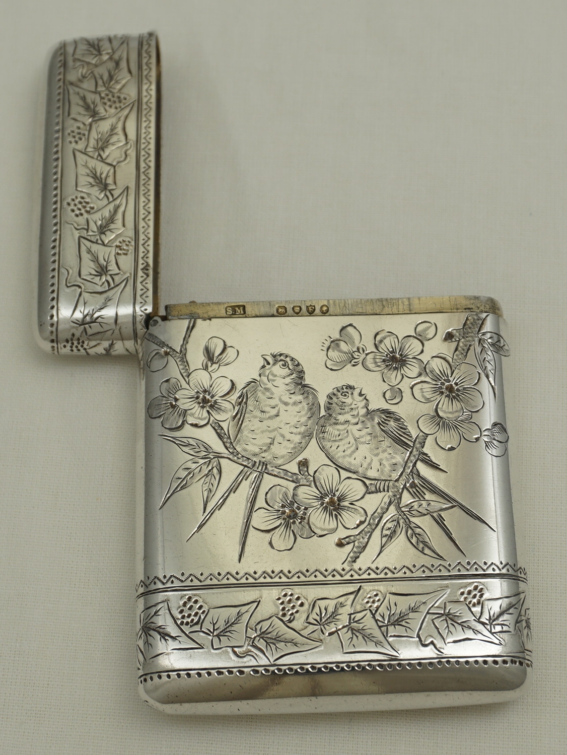 DESCRIPTION | Attractive antique English Victorian solid sterling silver card case engraved with birds amongst apple blossom between bands of fruiting ivy and a fully gilded interior. |
