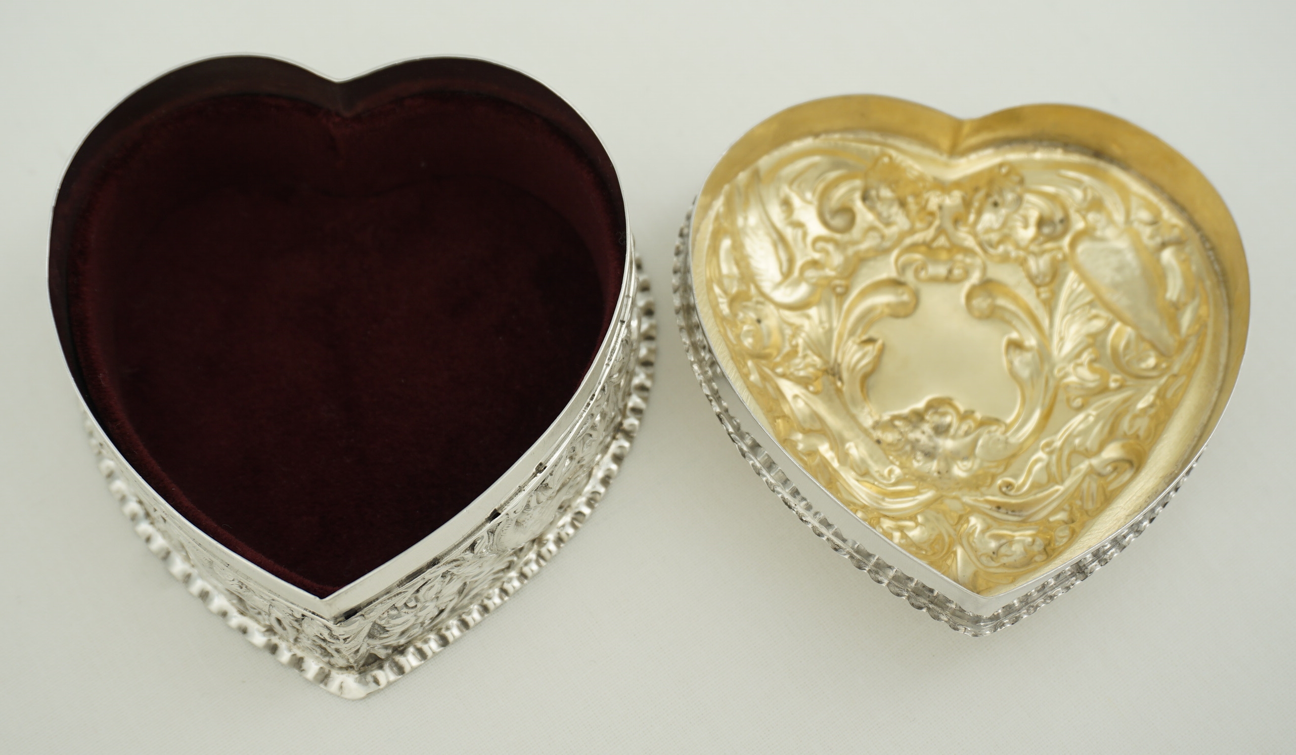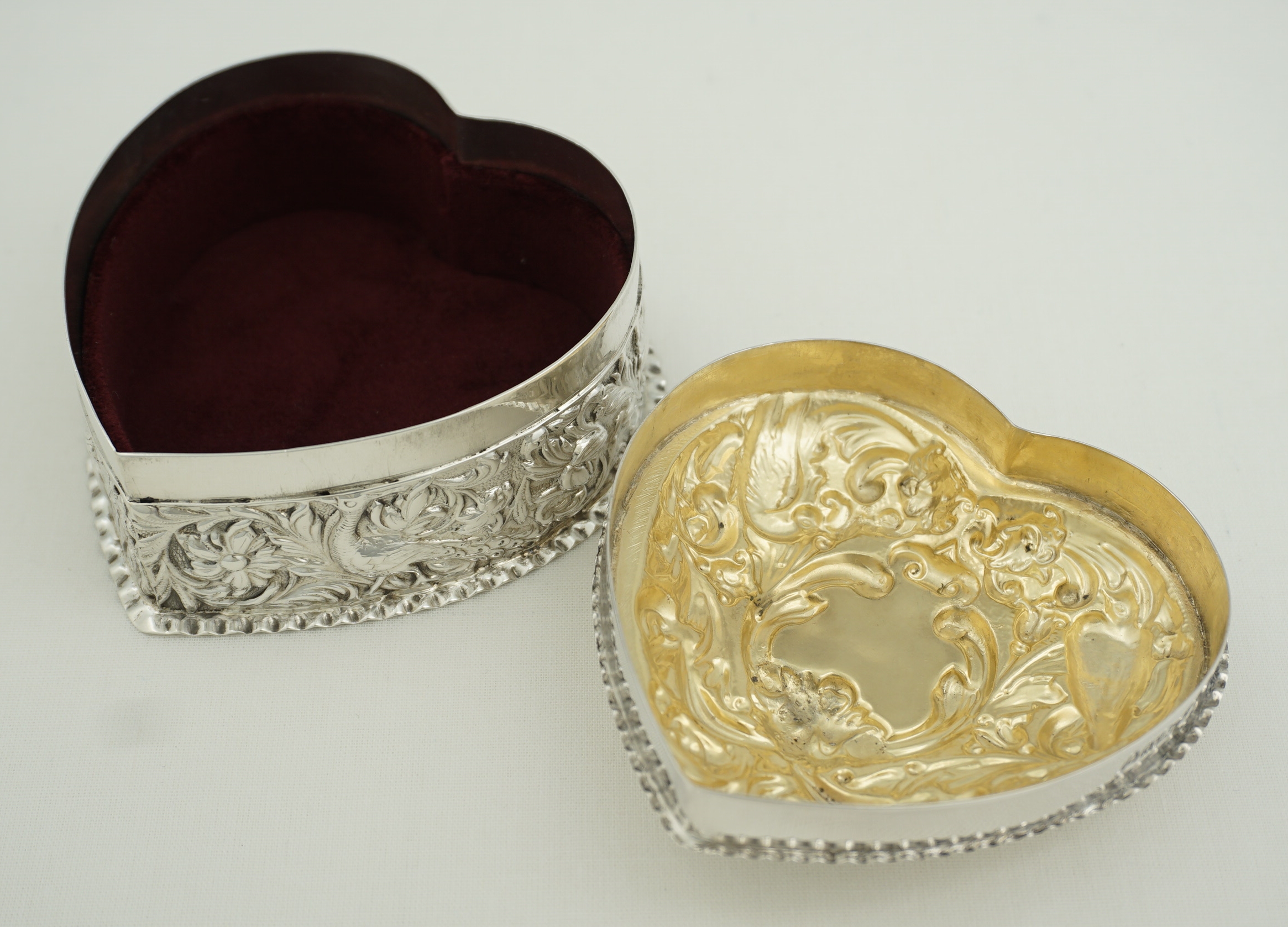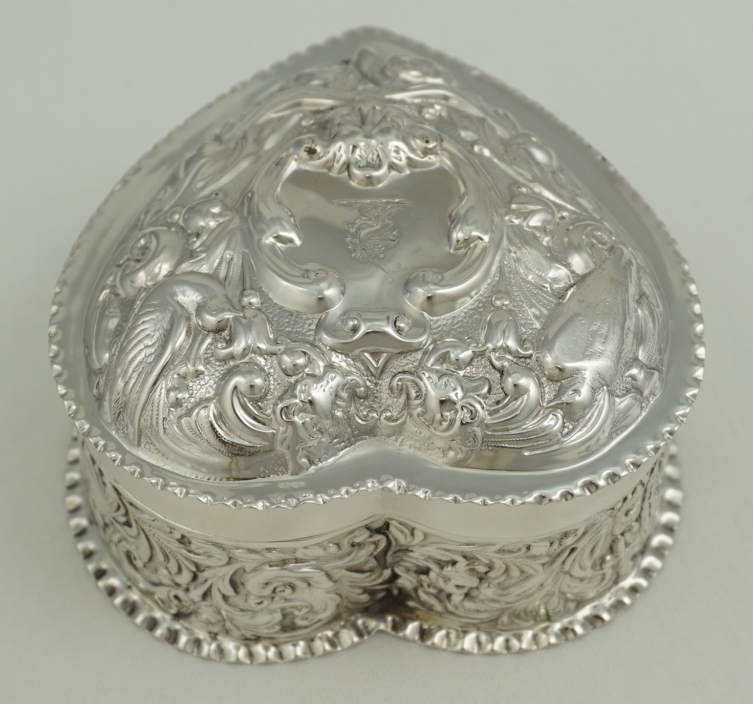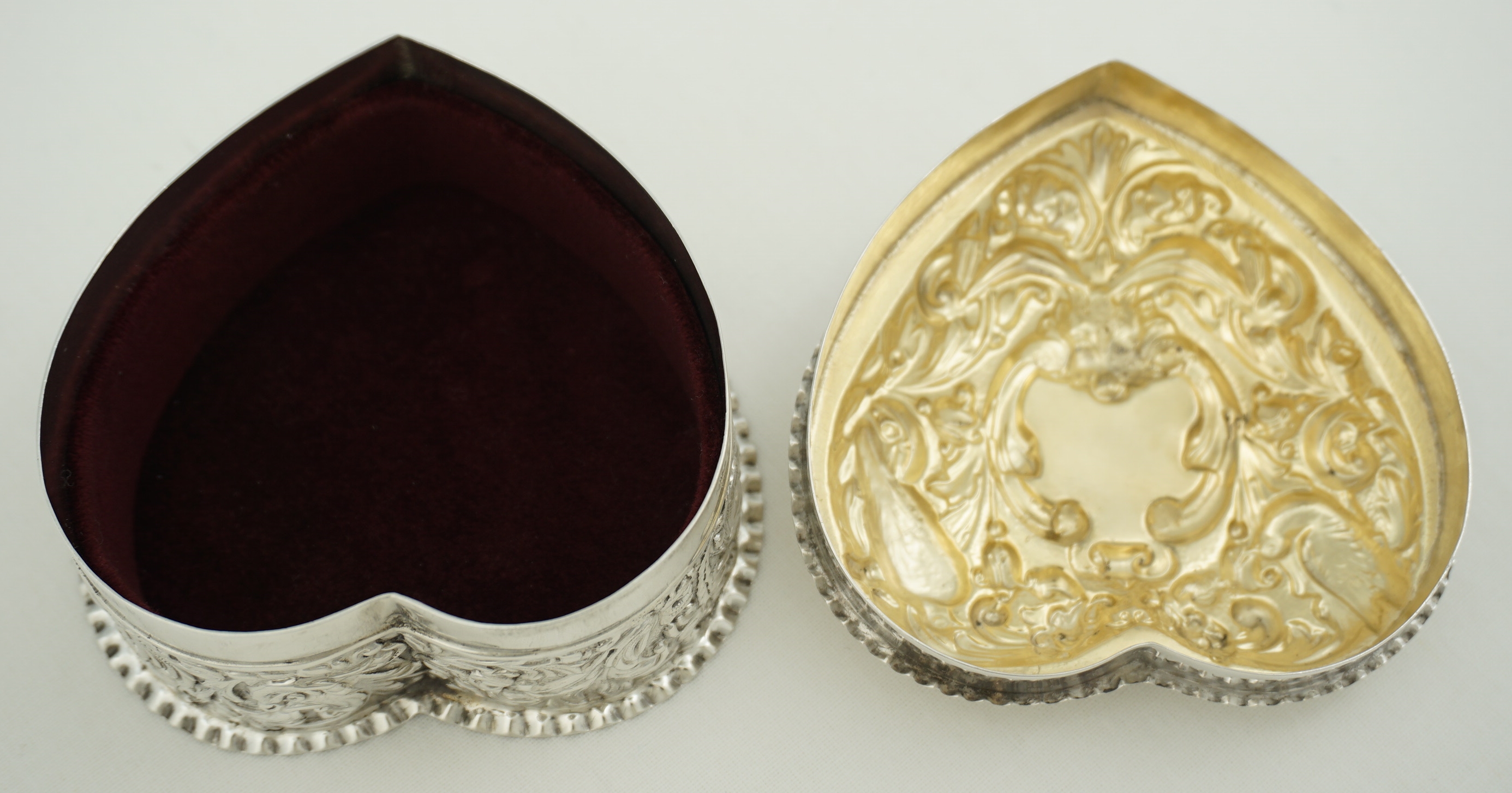 DESCRIPTION | Beautiful English Victorian solid sterling silver heart form box with a gilded and velvet lined interior and embossed and engraved decoration. |