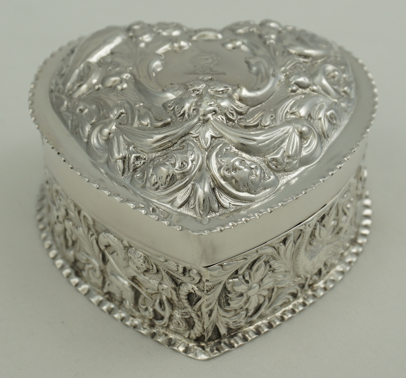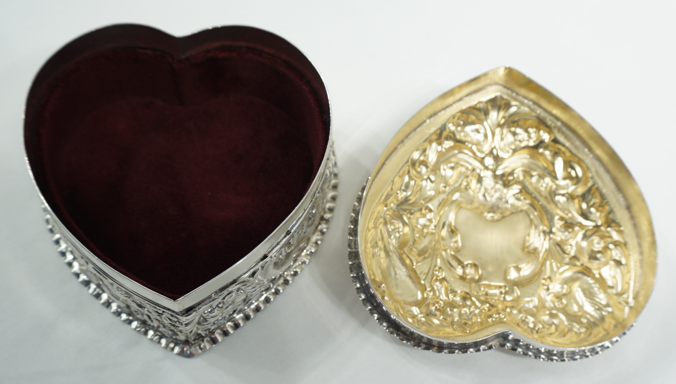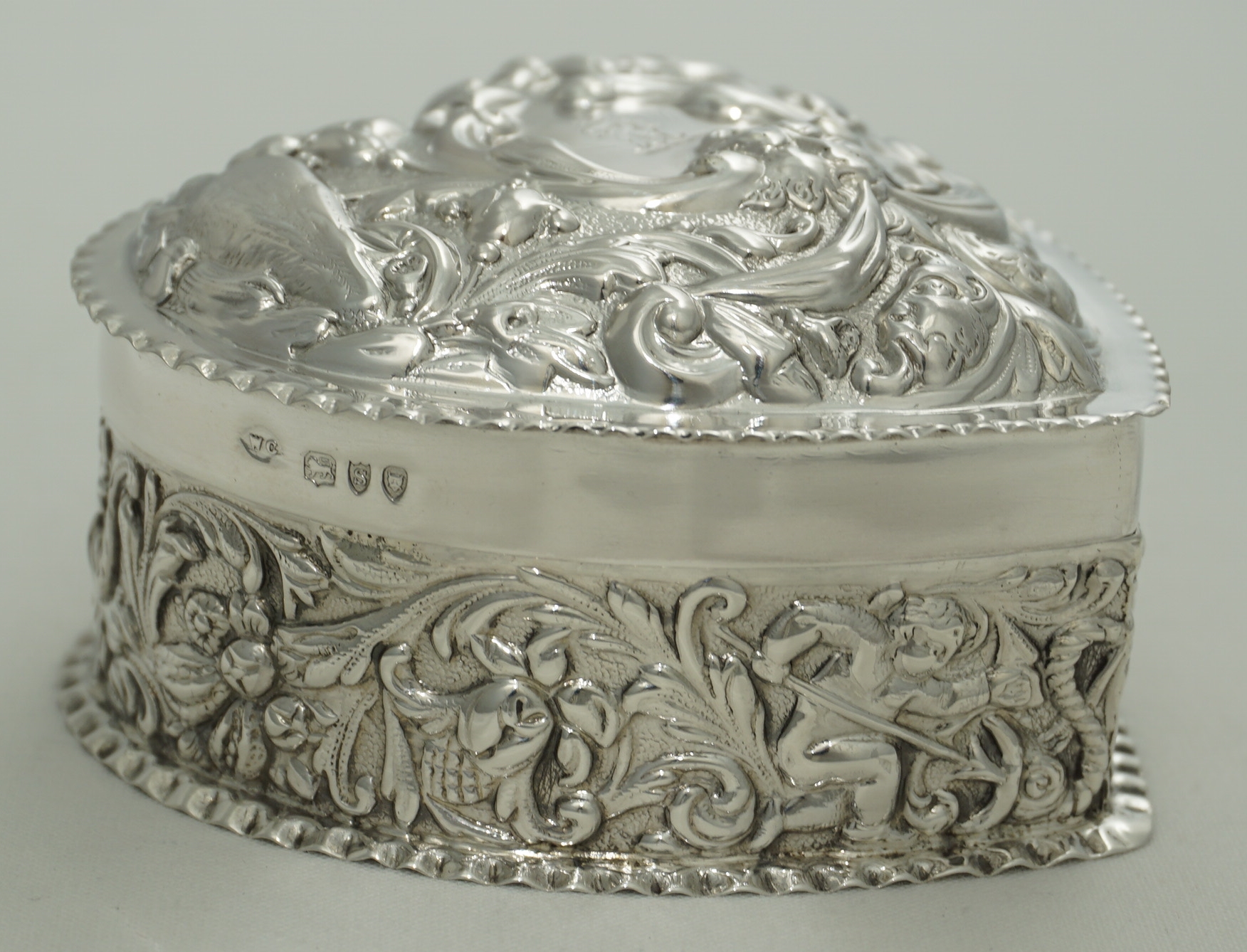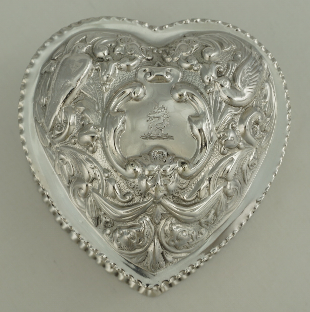 DESCRIPTION | Beautiful English Victorian solid sterling silver heart form box with a gilded and velvet lined interior and embossed and engraved decoration. |