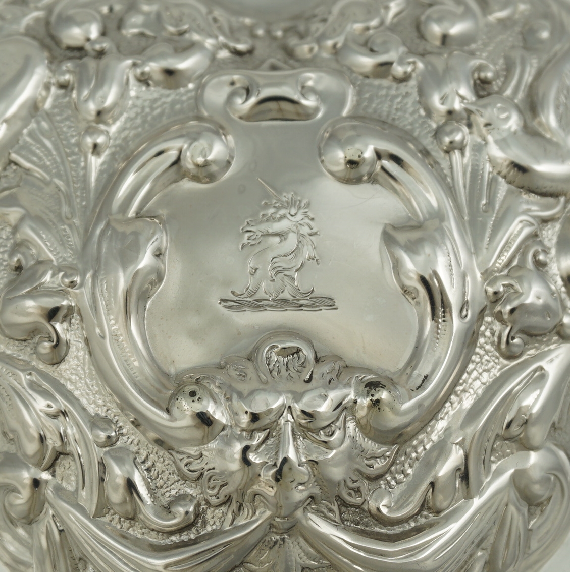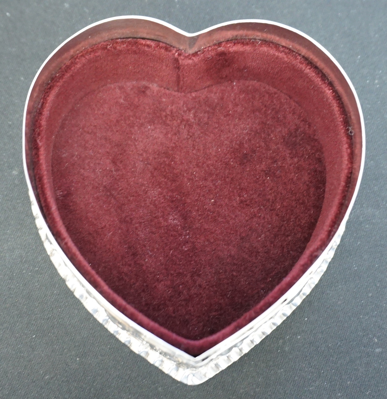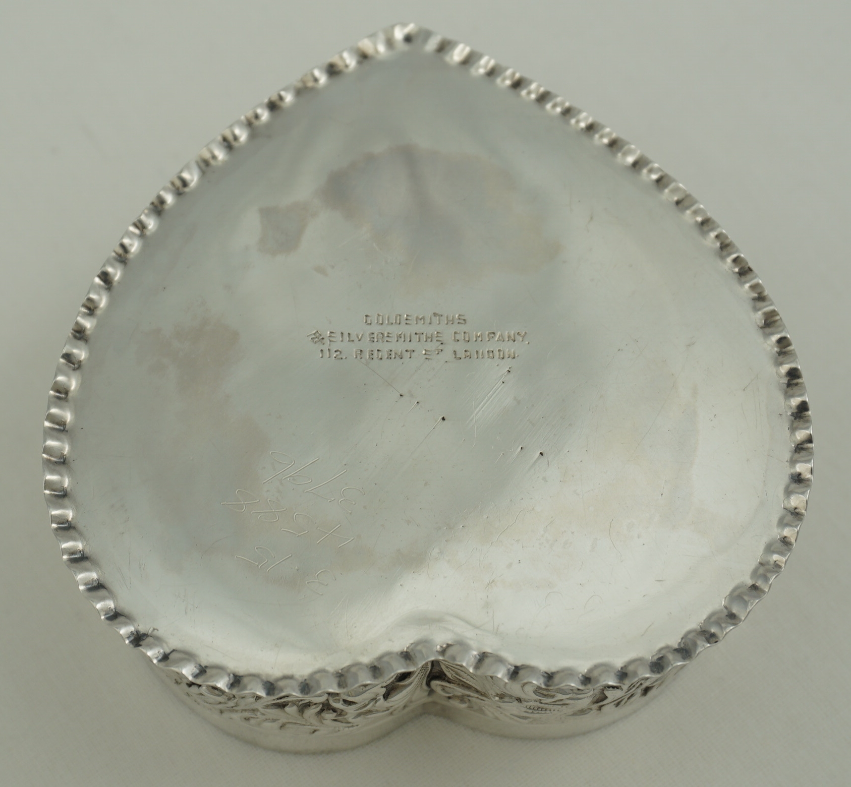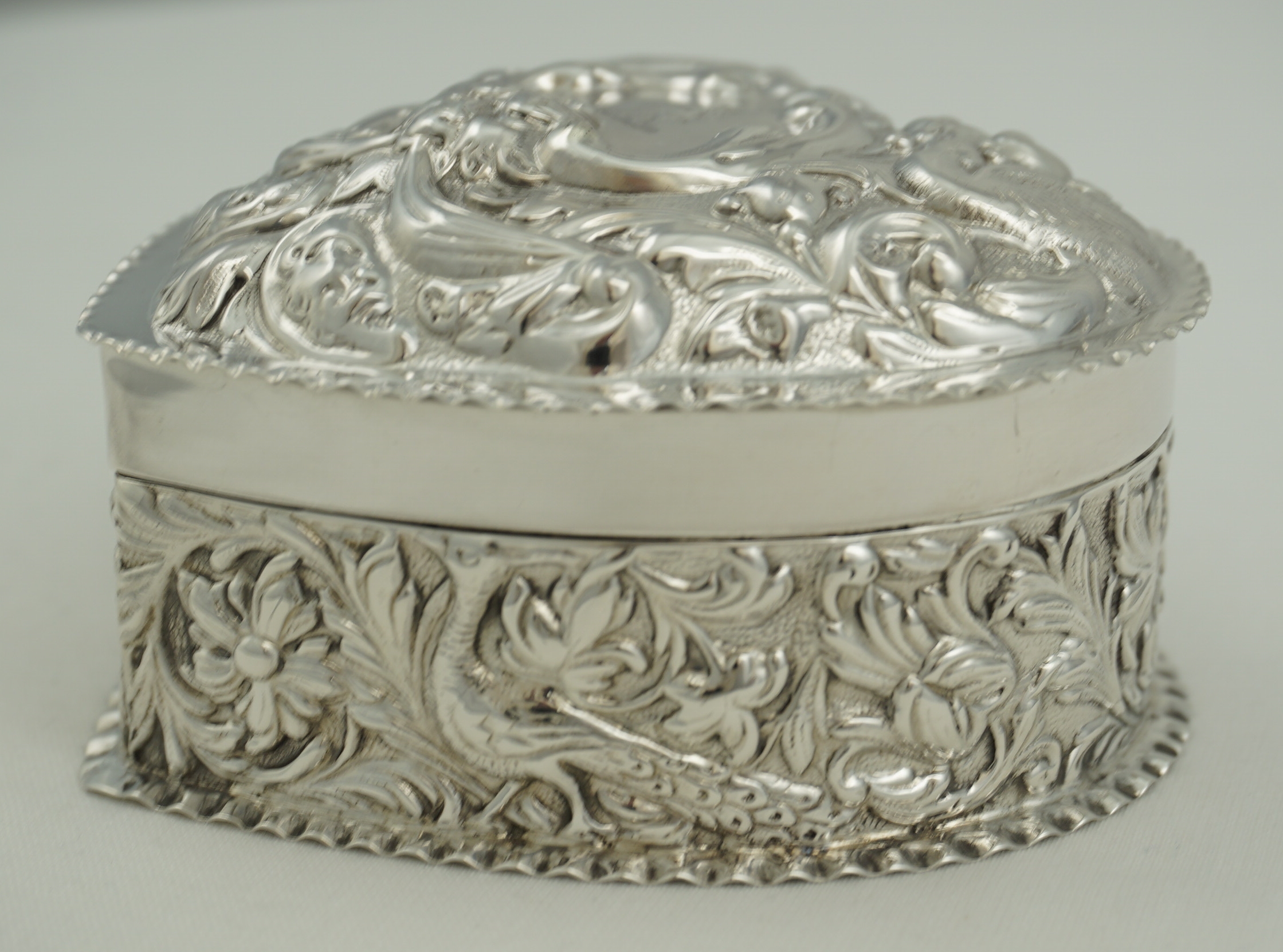DESCRIPTION | Beautiful English Victorian solid sterling silver heart form box with a gilded and velvet lined interior and embossed and engraved decoration. |