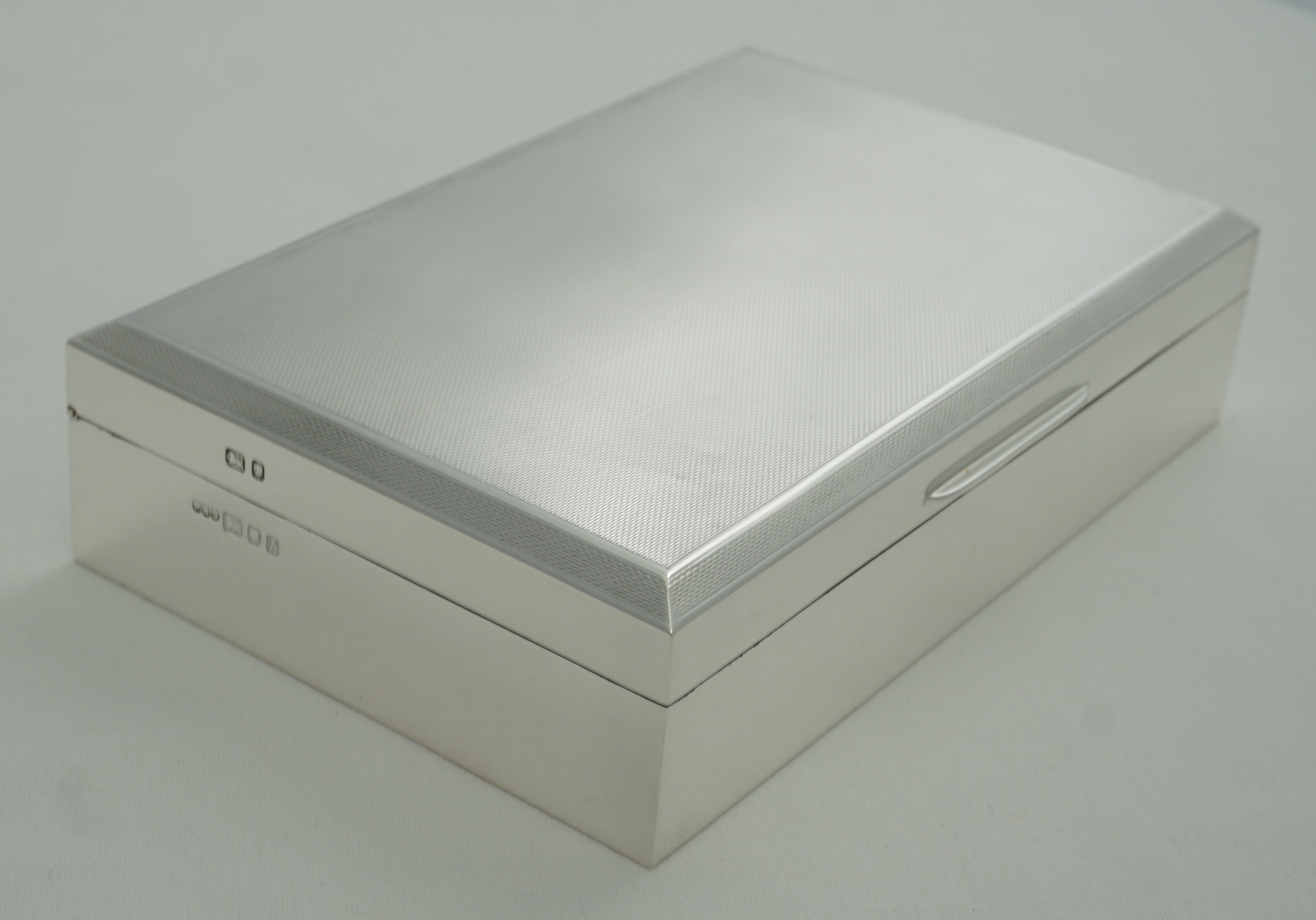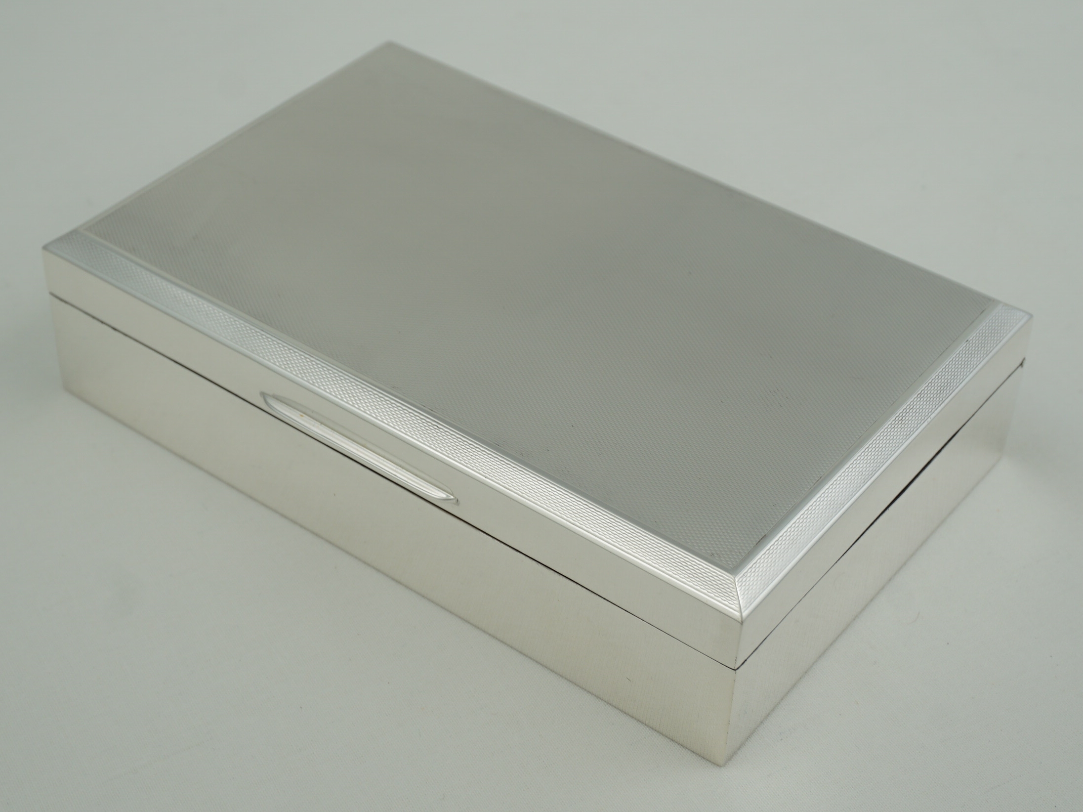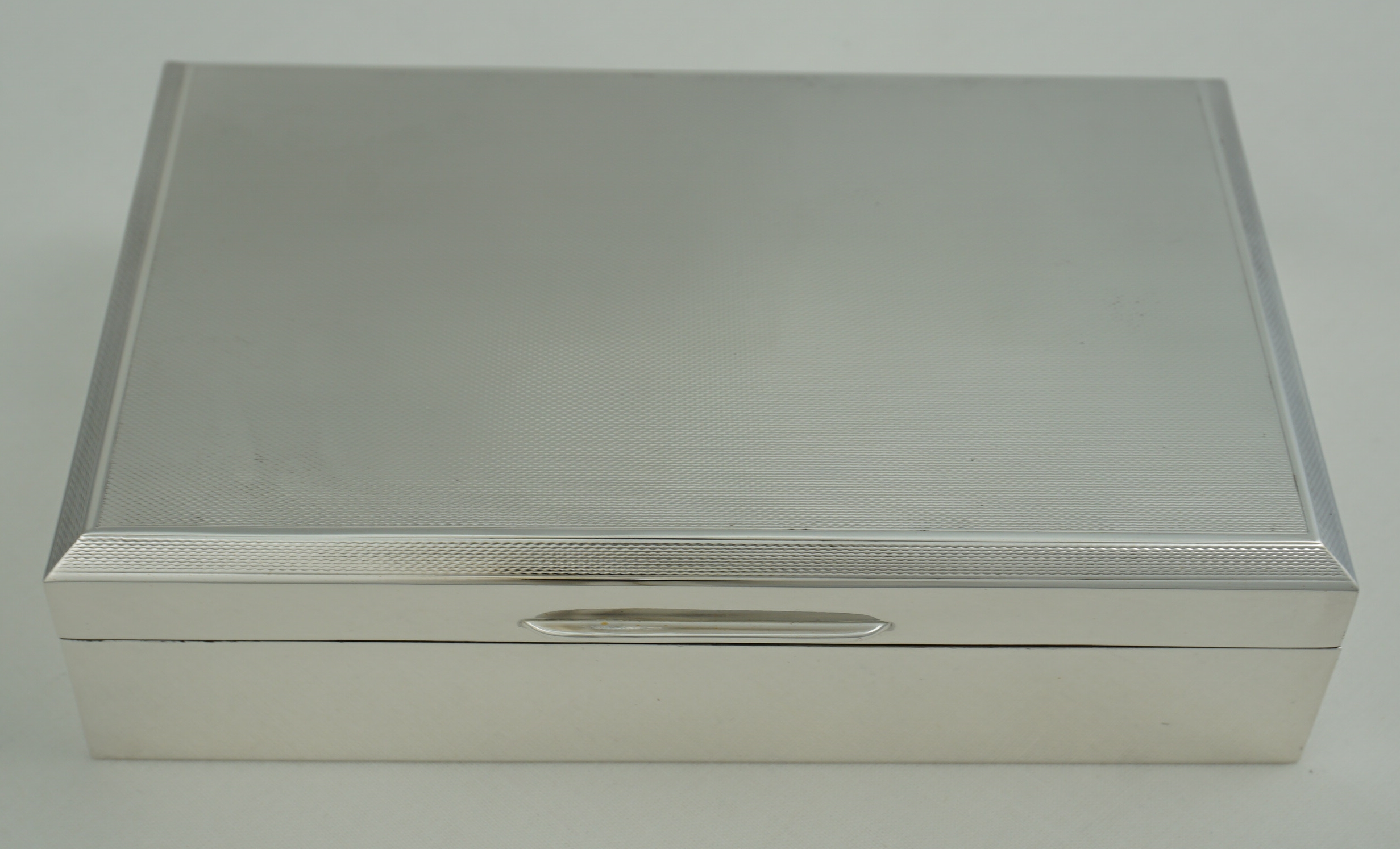 DESCRIPTION | Very good vintage English sterling silver cigarette box with engine turned engraved decoration and cedar wood interior. |