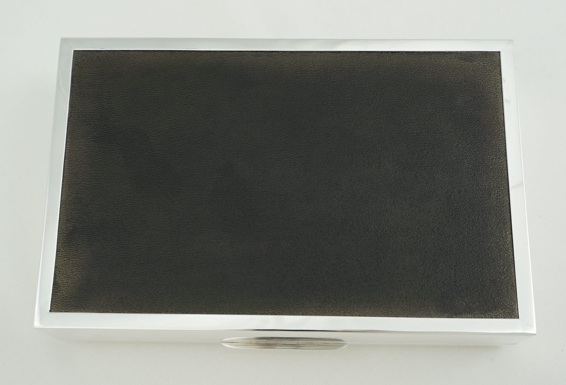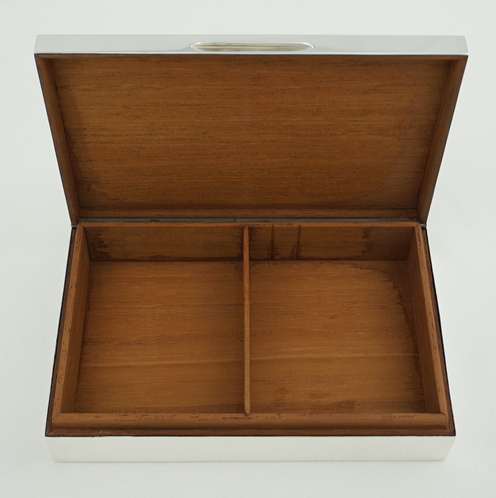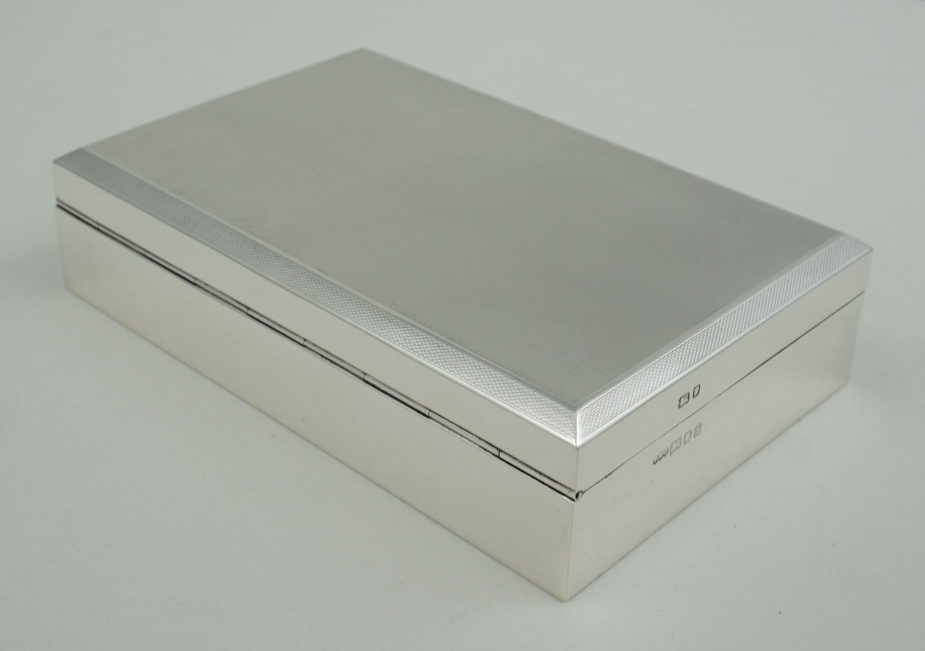 DESCRIPTION | Very good vintage English sterling silver cigarette box with engine turned engraved decoration and cedar wood interior. |