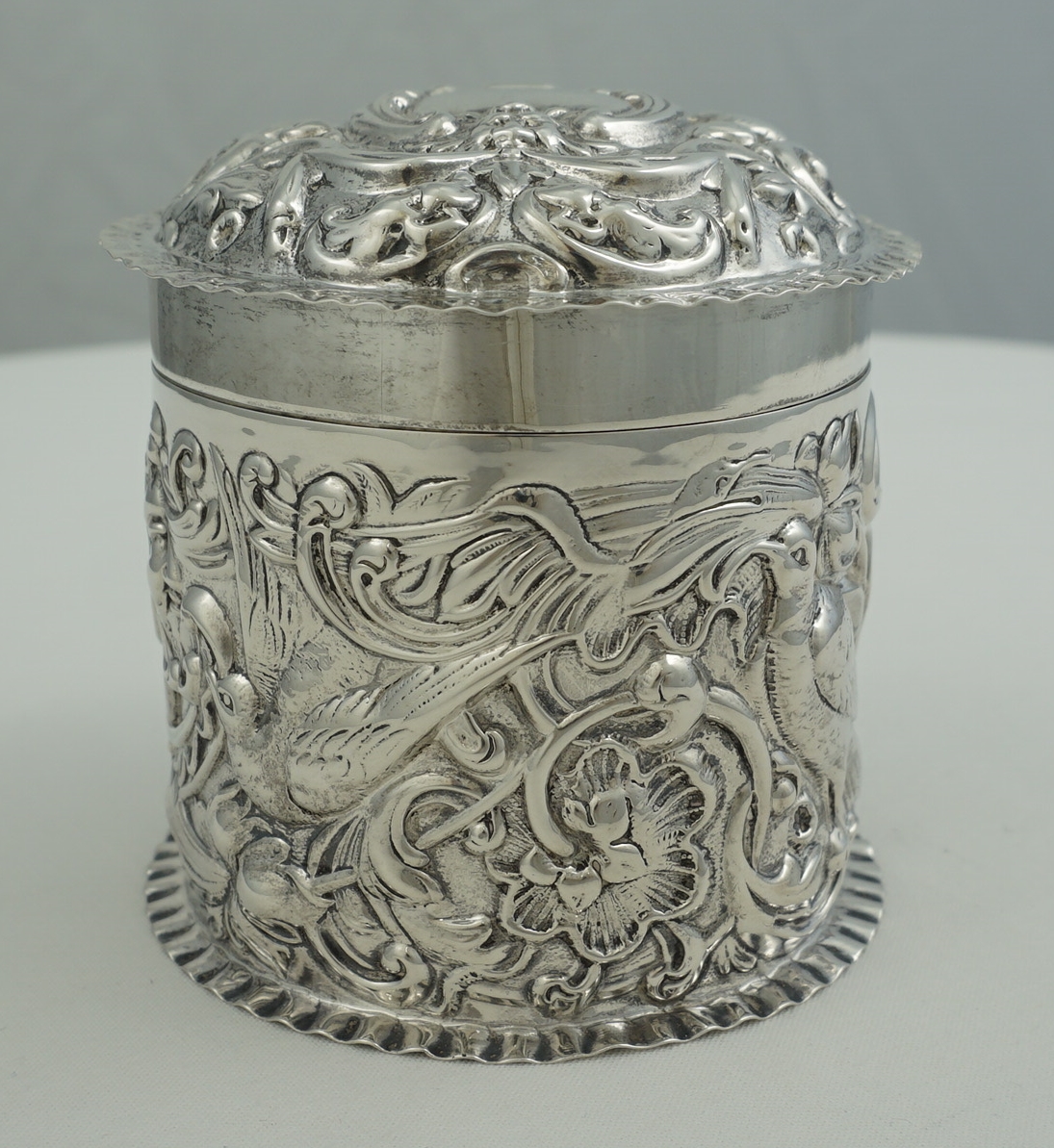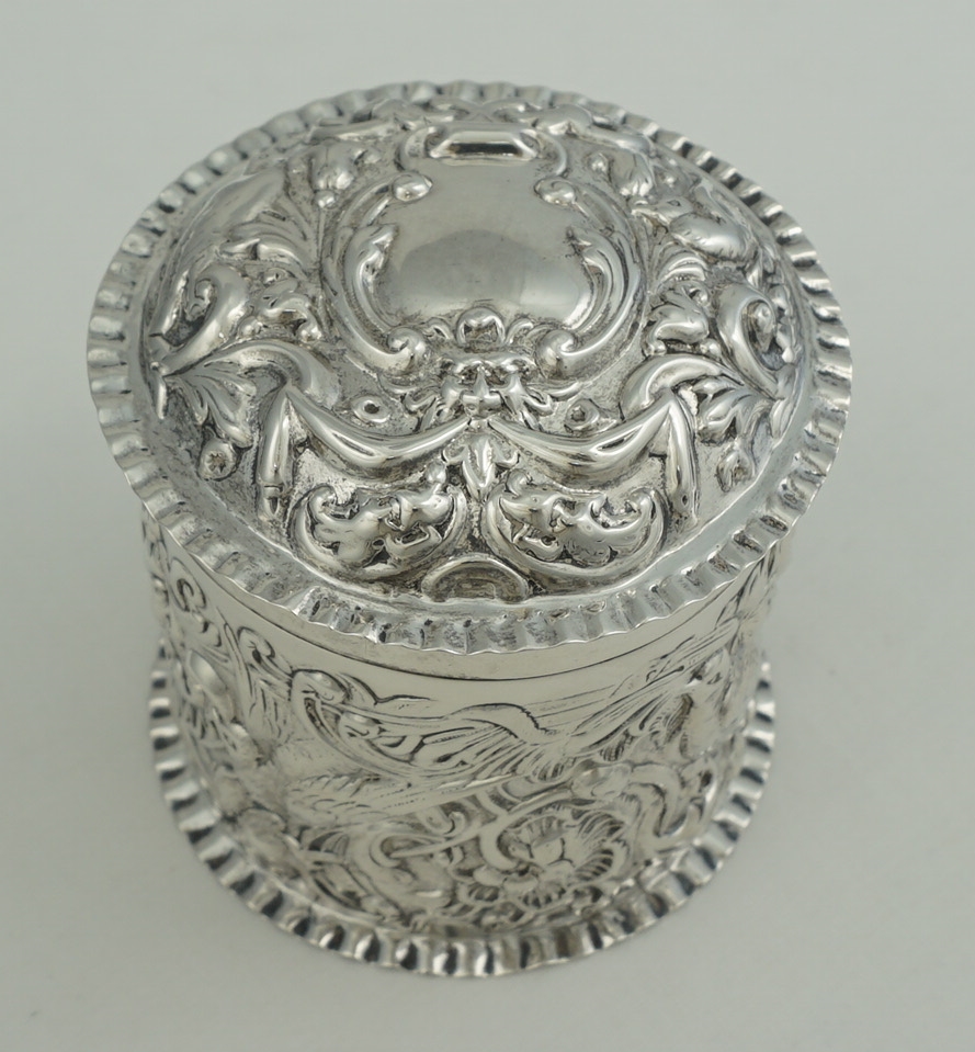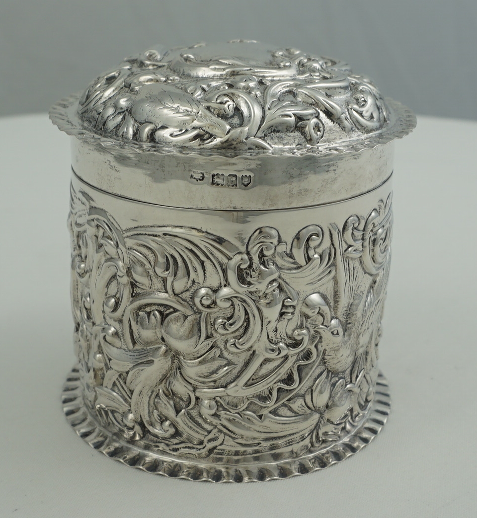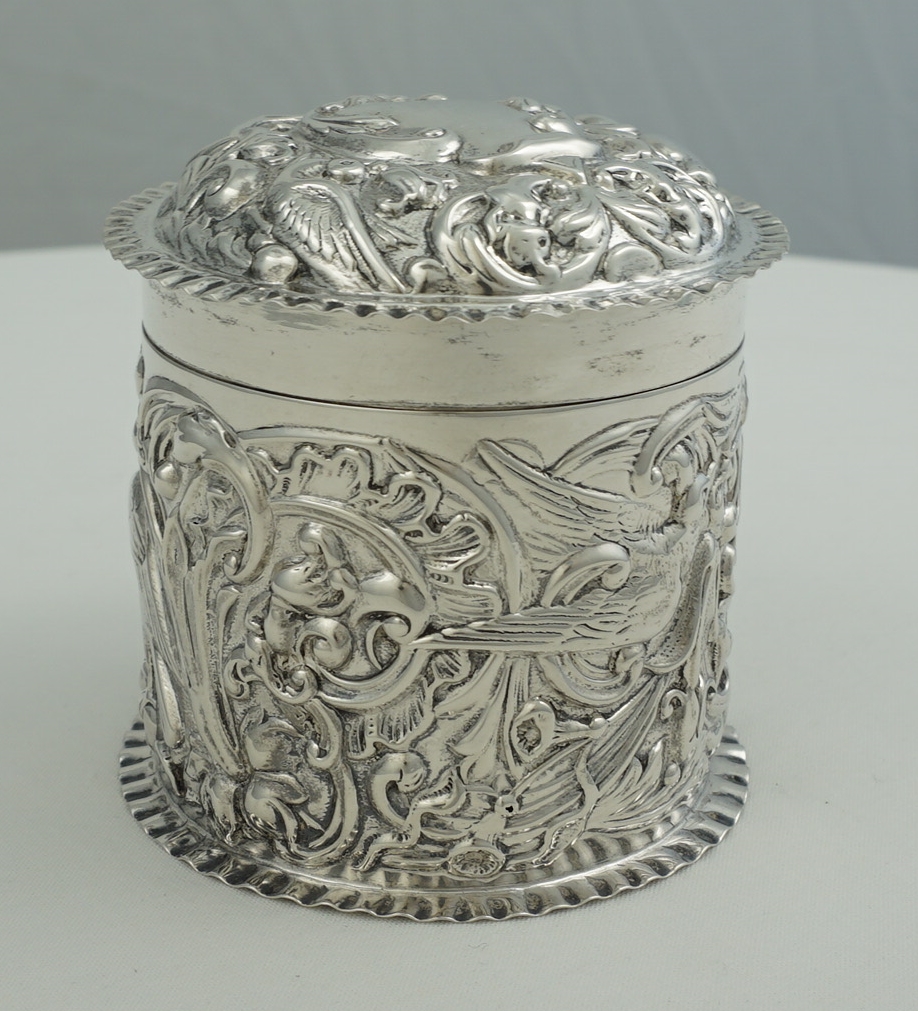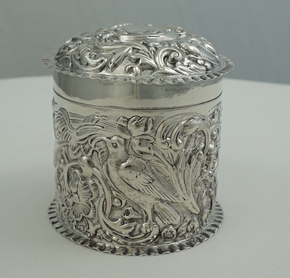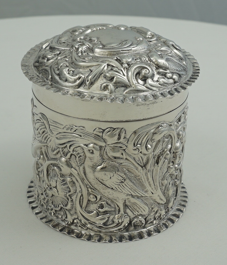 DESCRIPTION | Very good antique English solid sterling silver cylindrical box with pull-off lid and rococo embossed and engraved decoration featuring c-scrolls, shells, birds, harebells and foliage. Would make a nice dressing table container for cotton buds or make-up removal pads or as a box for cigarettes, loose tobacco or herb. |