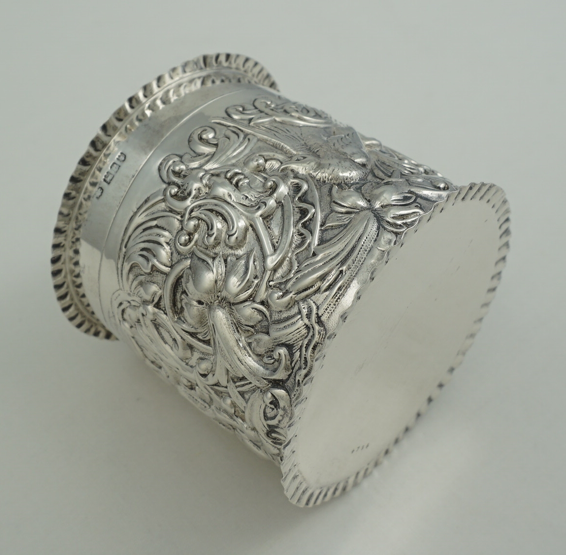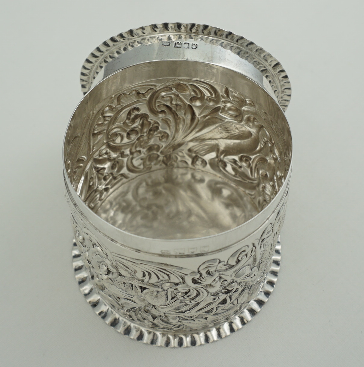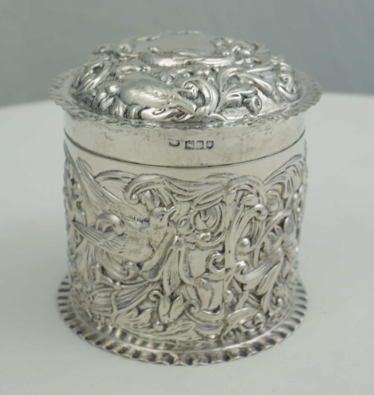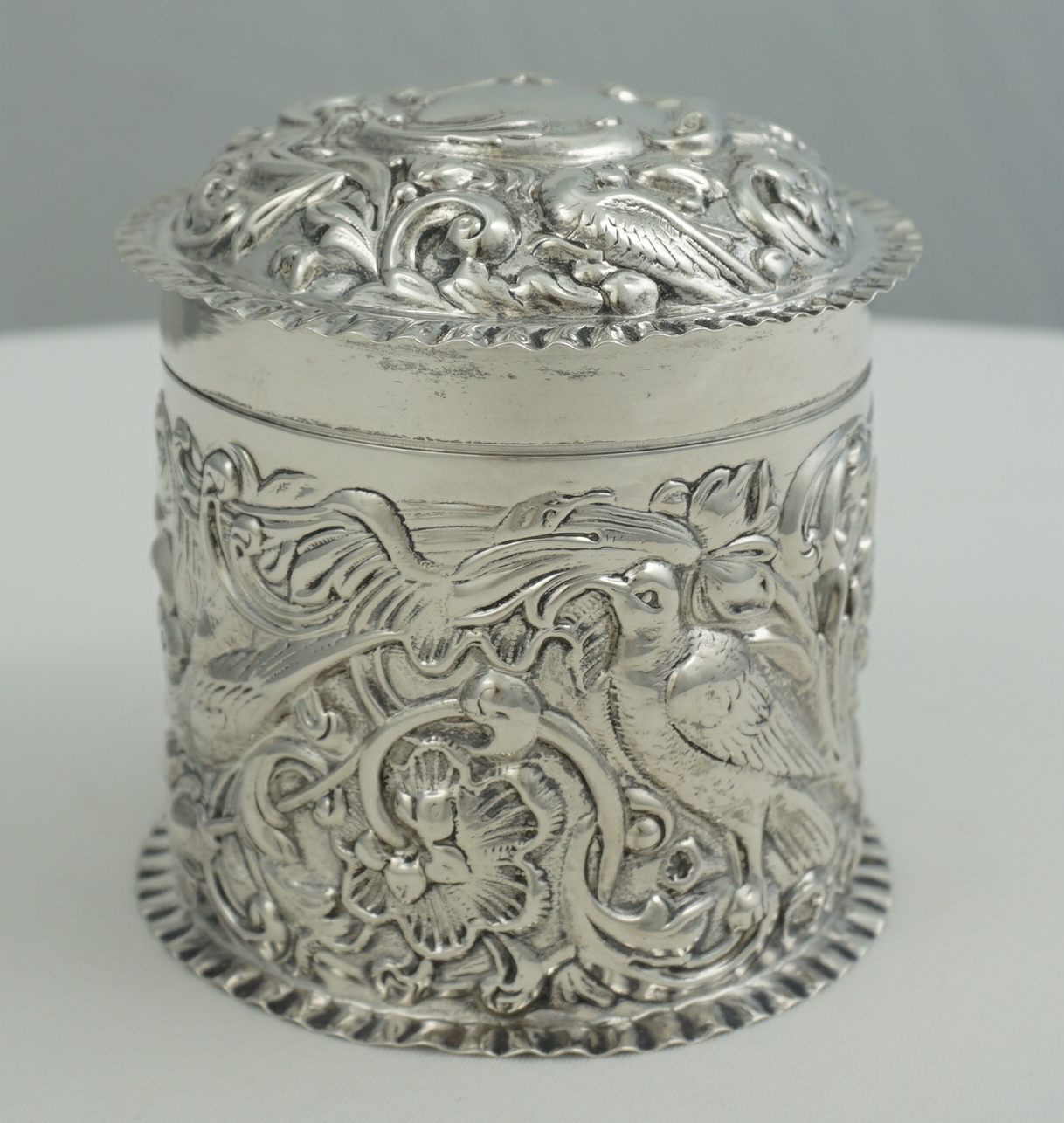 DESCRIPTION | Very good antique English solid sterling silver cylindrical box with pull-off lid and rococo embossed and engraved decoration featuring c-scrolls, shells, birds, harebells and foliage. Would make a nice dressing table container for cotton buds or make-up removal pads or as a box for cigarettes, loose tobacco or herb. |