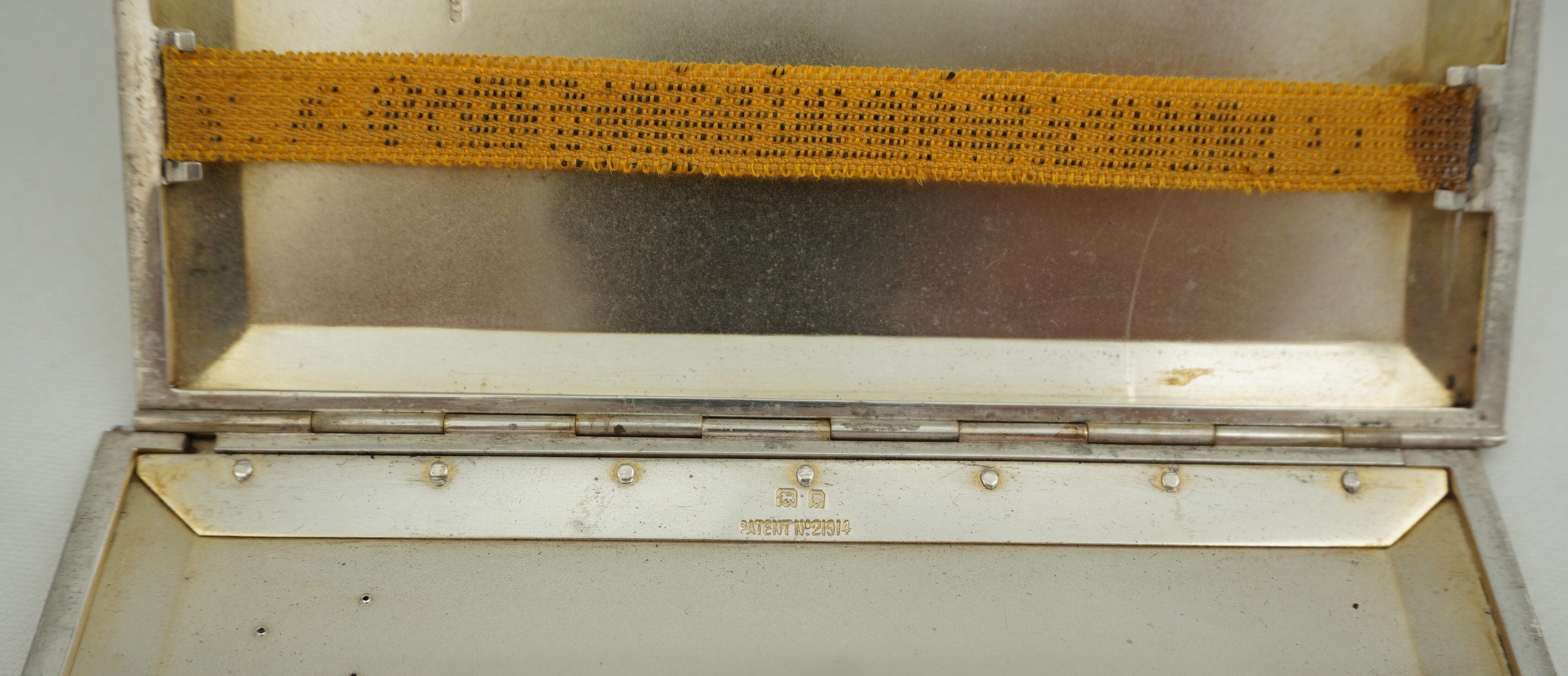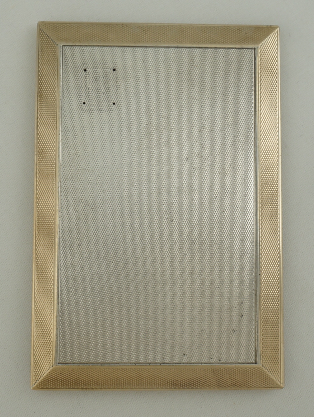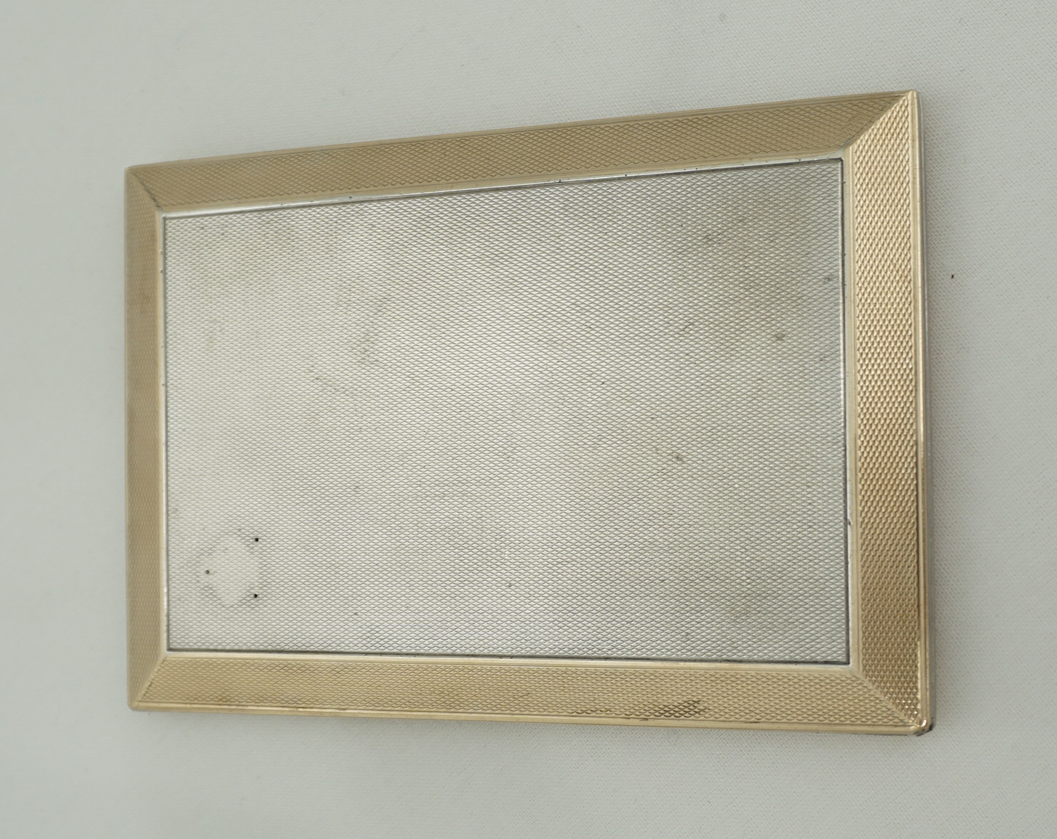 DESCRIPTION | High quality large antique English solid sterling silver slide action cigarette case with engine turned engraved decoration and a matt gilded interior. The gold to the outside is not simply plated but is an applied sheet of measurable thickness, my guess about 0.5mm. Three pinholes to one side and four to the other indicate that some form of personalisation has been removed. I have not polished those areas so that it is obvious where they are. An opportunity to have your own personalisation applied. |
