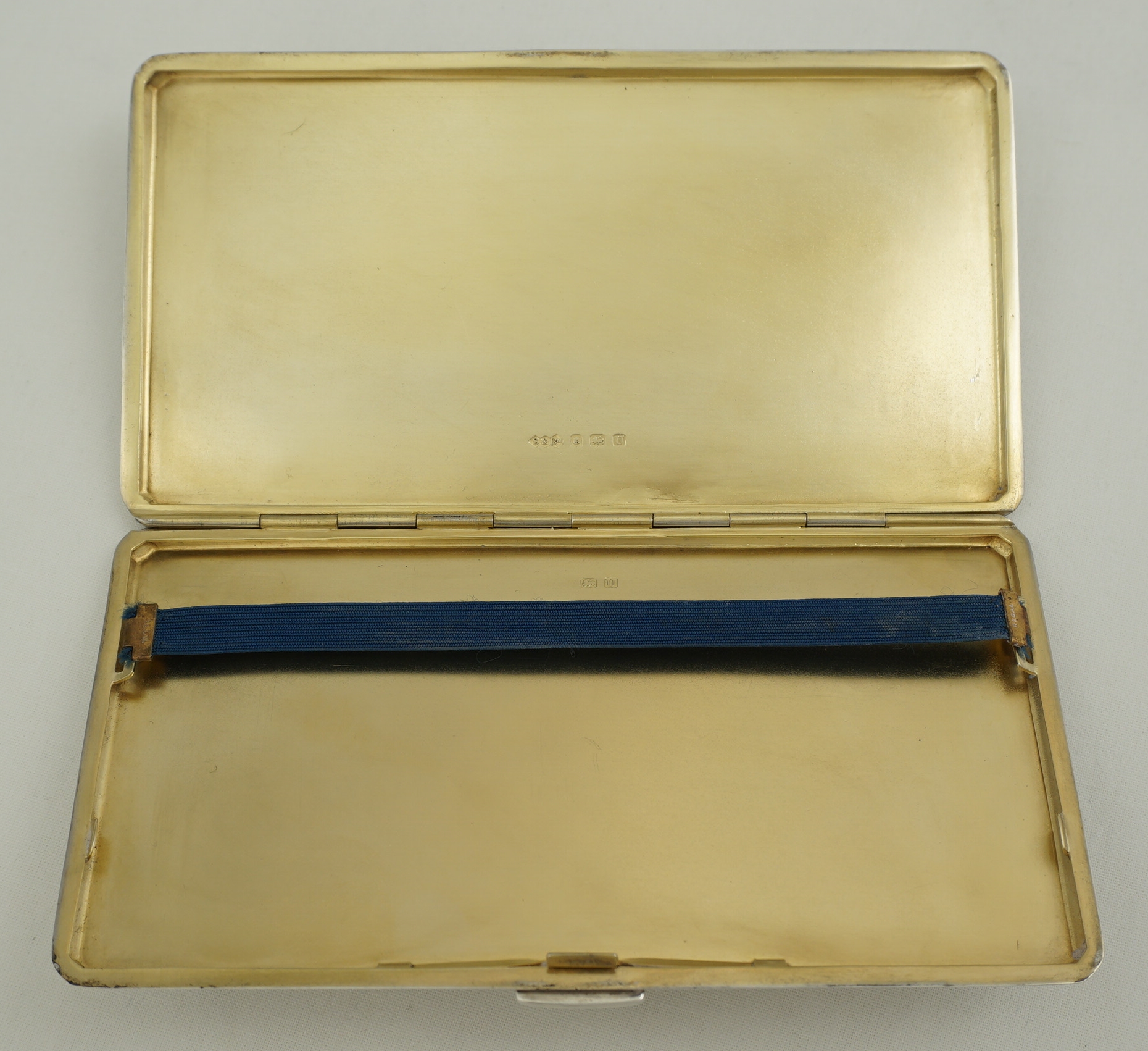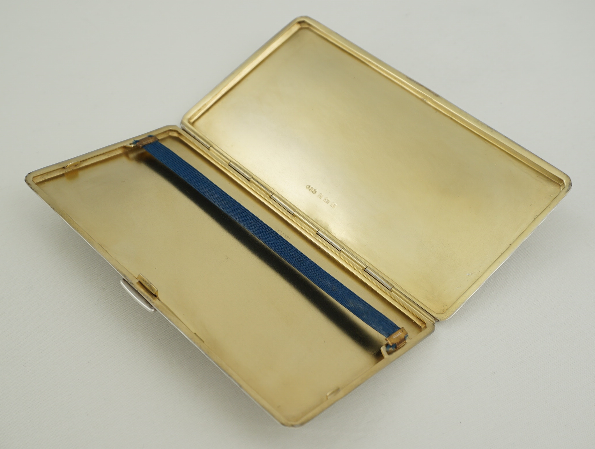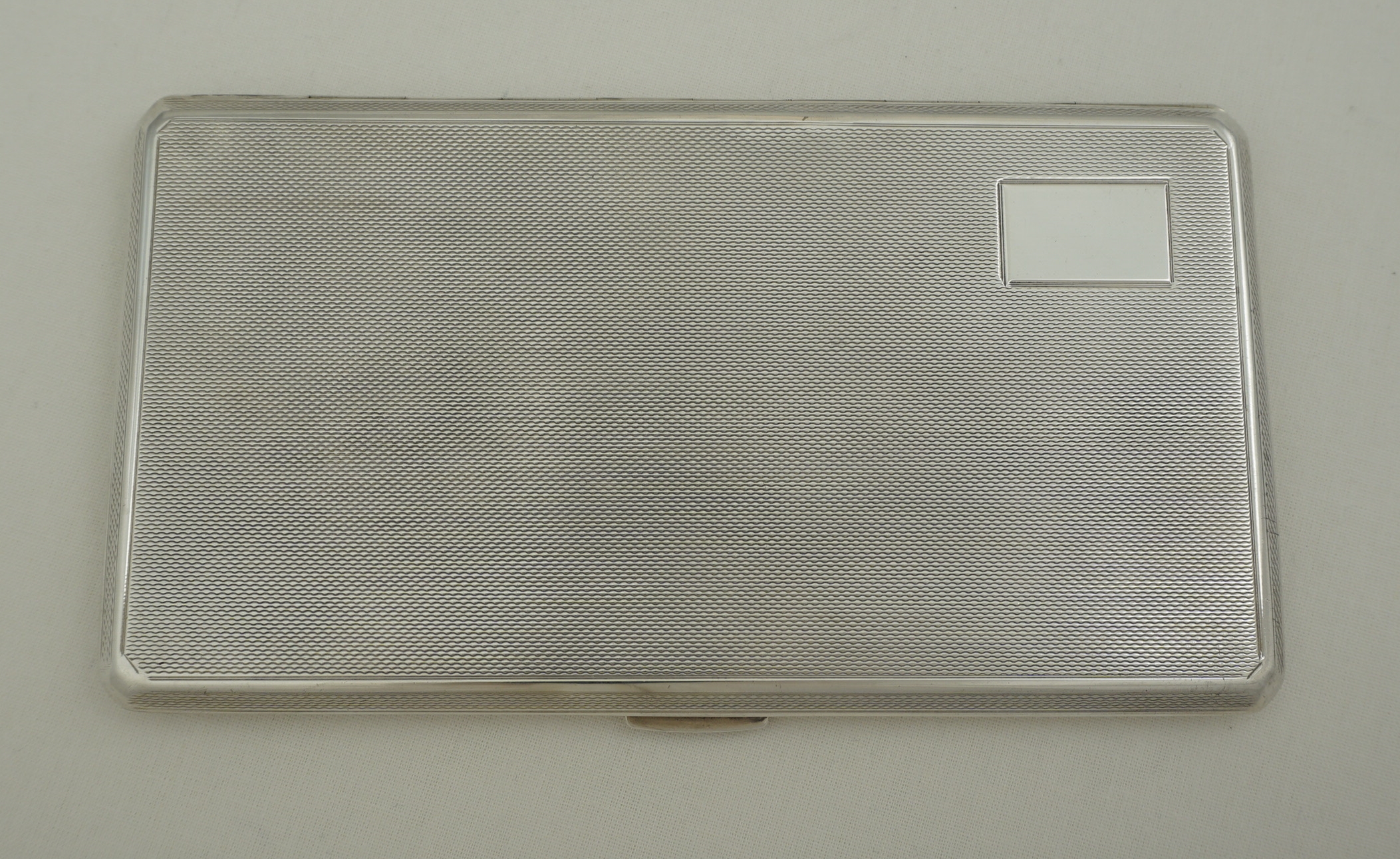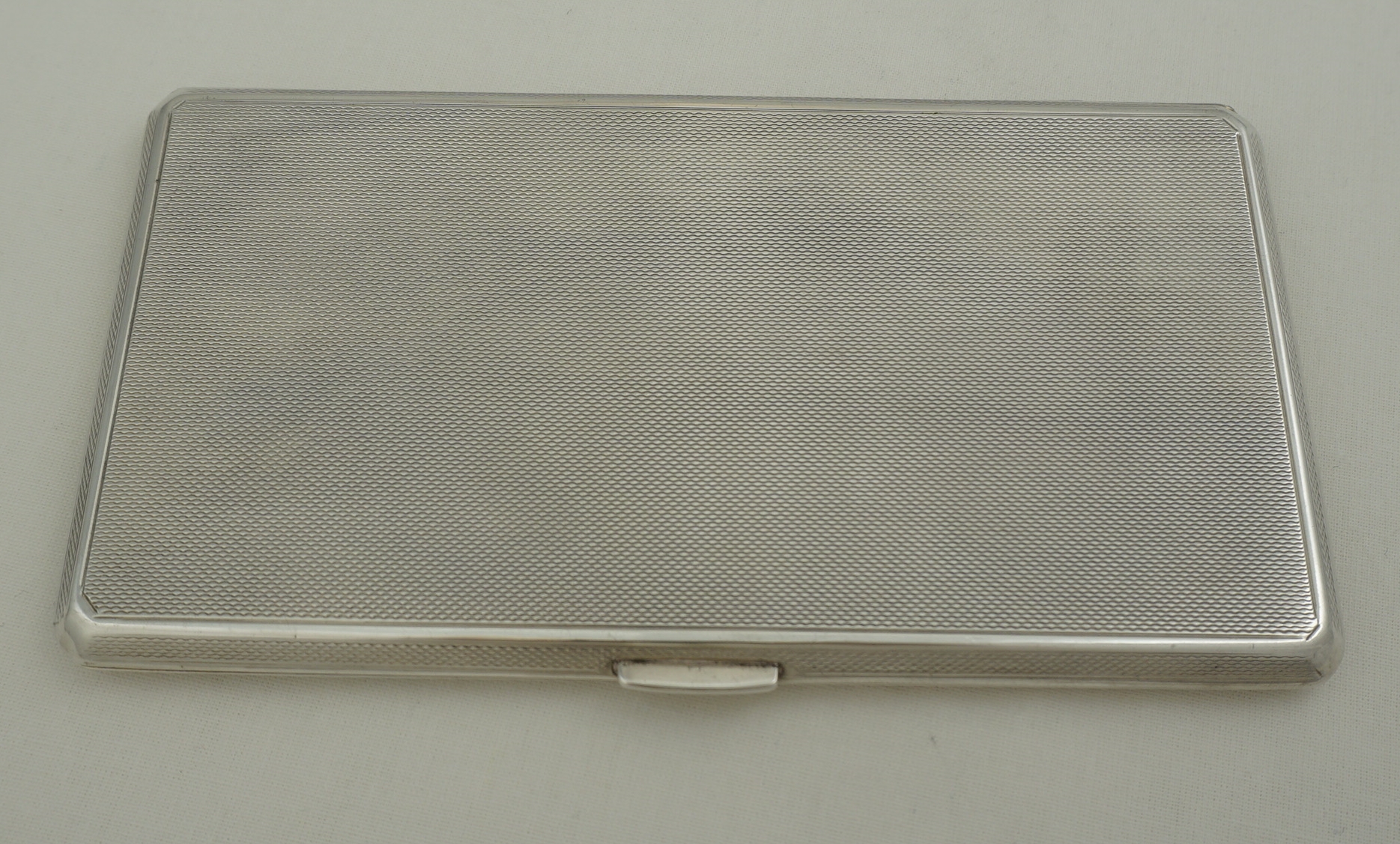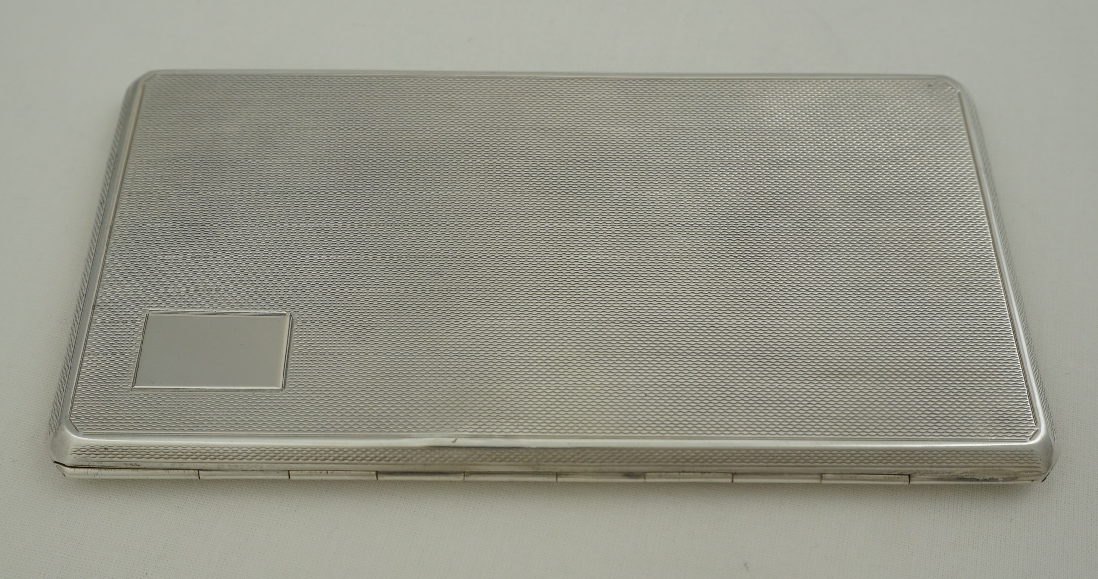 DESCRIPTION | Large vintage English solid sterling silver cigarette case with a gilded interior and engine turned engraved decoration. The blank rectangular cartouche has never been engraved. |