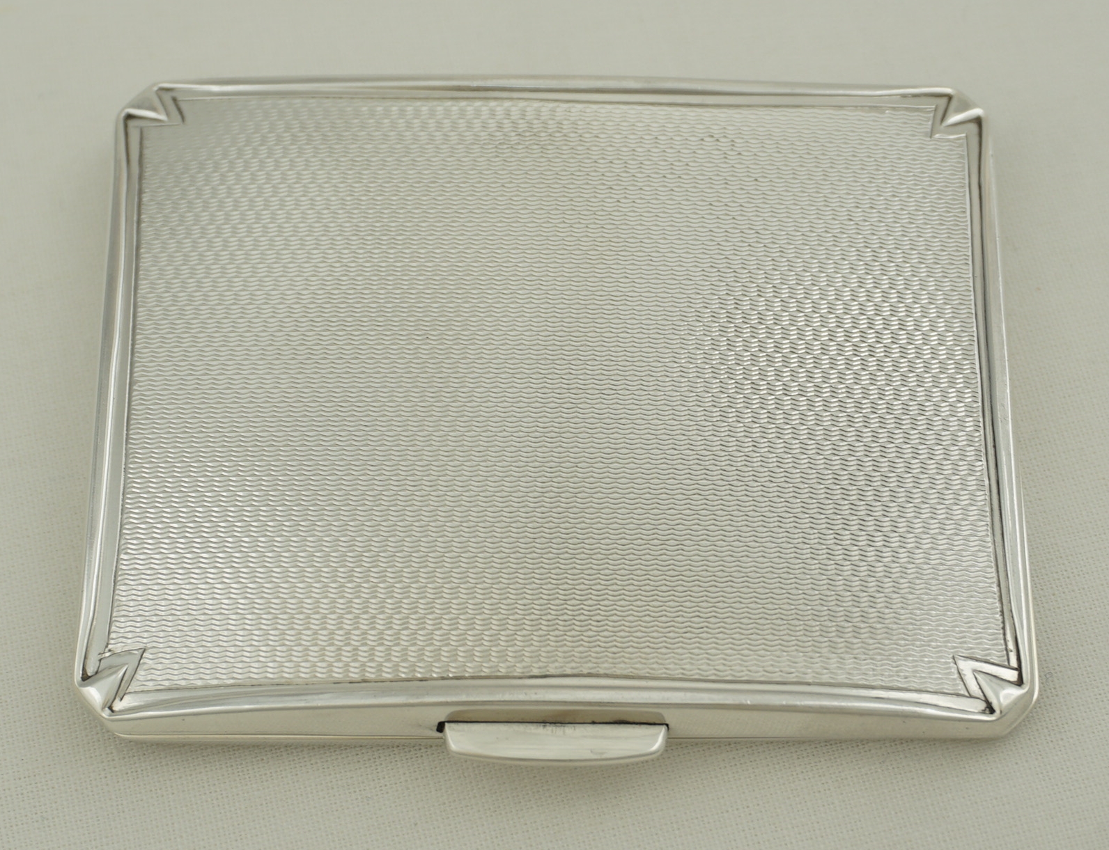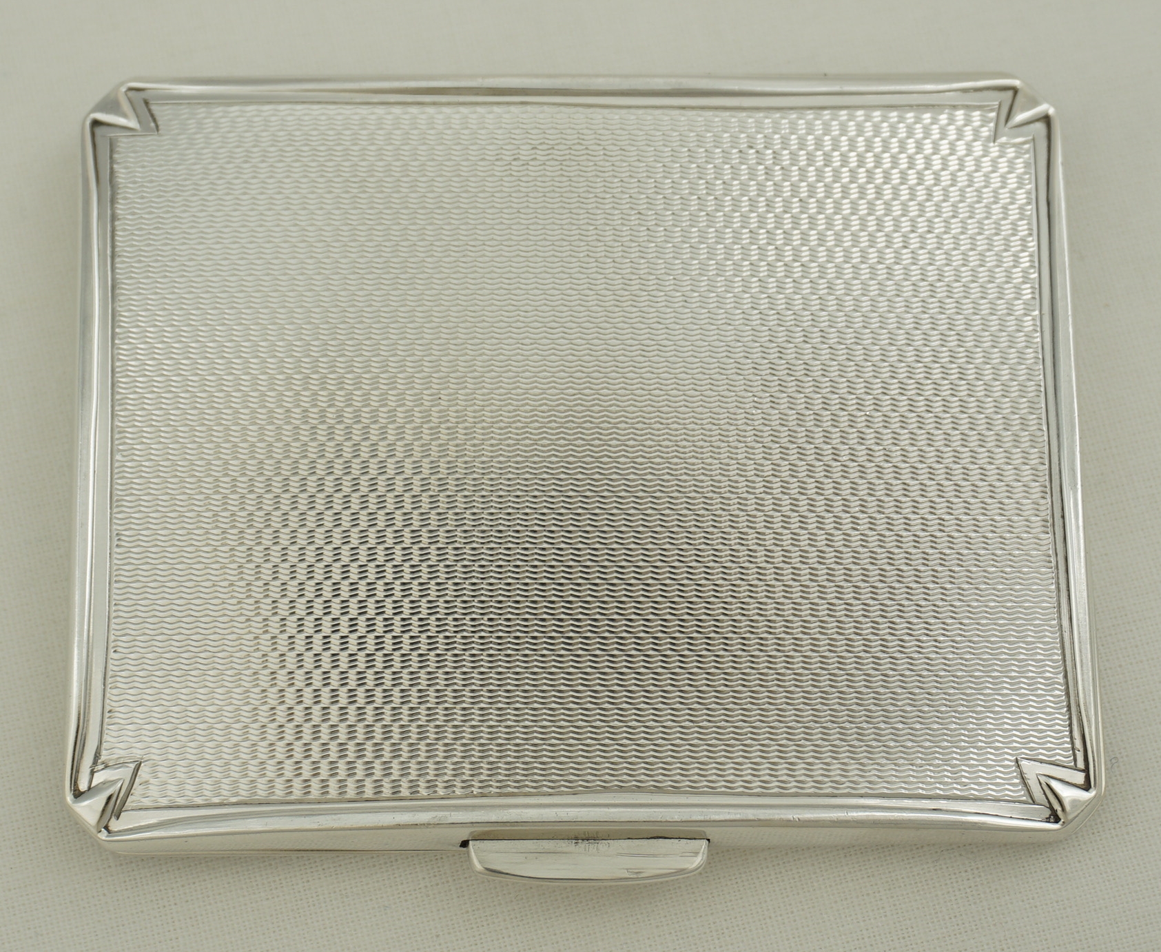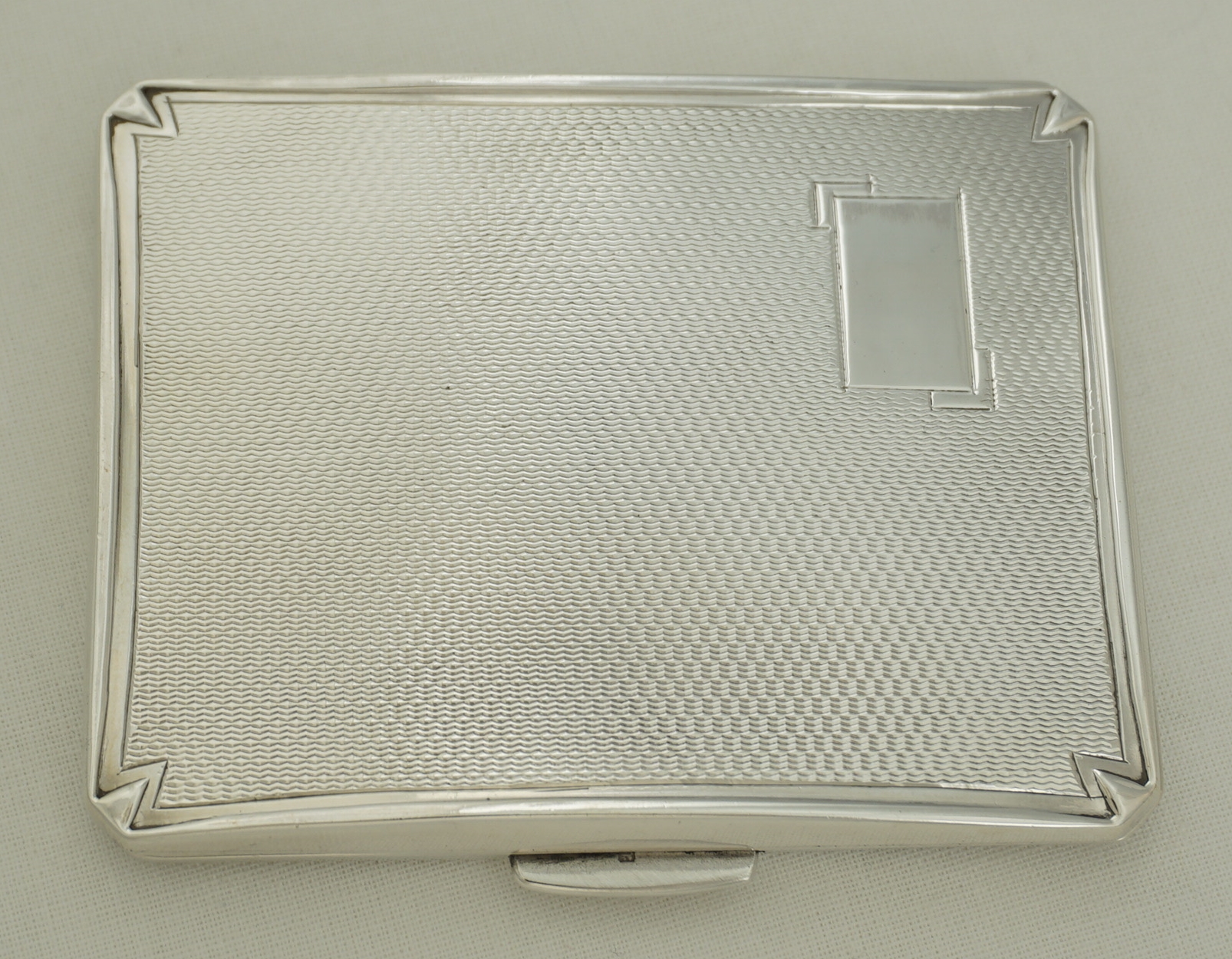 DESCRIPTION | Excellent vintage Art Deco English solid sterling silver cigarette case with canted corners, blank cartouche, engine turned engraved decoration and a matt gilded interior. |