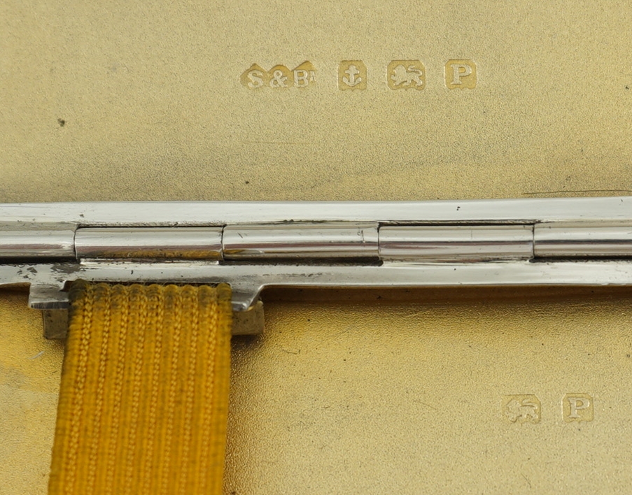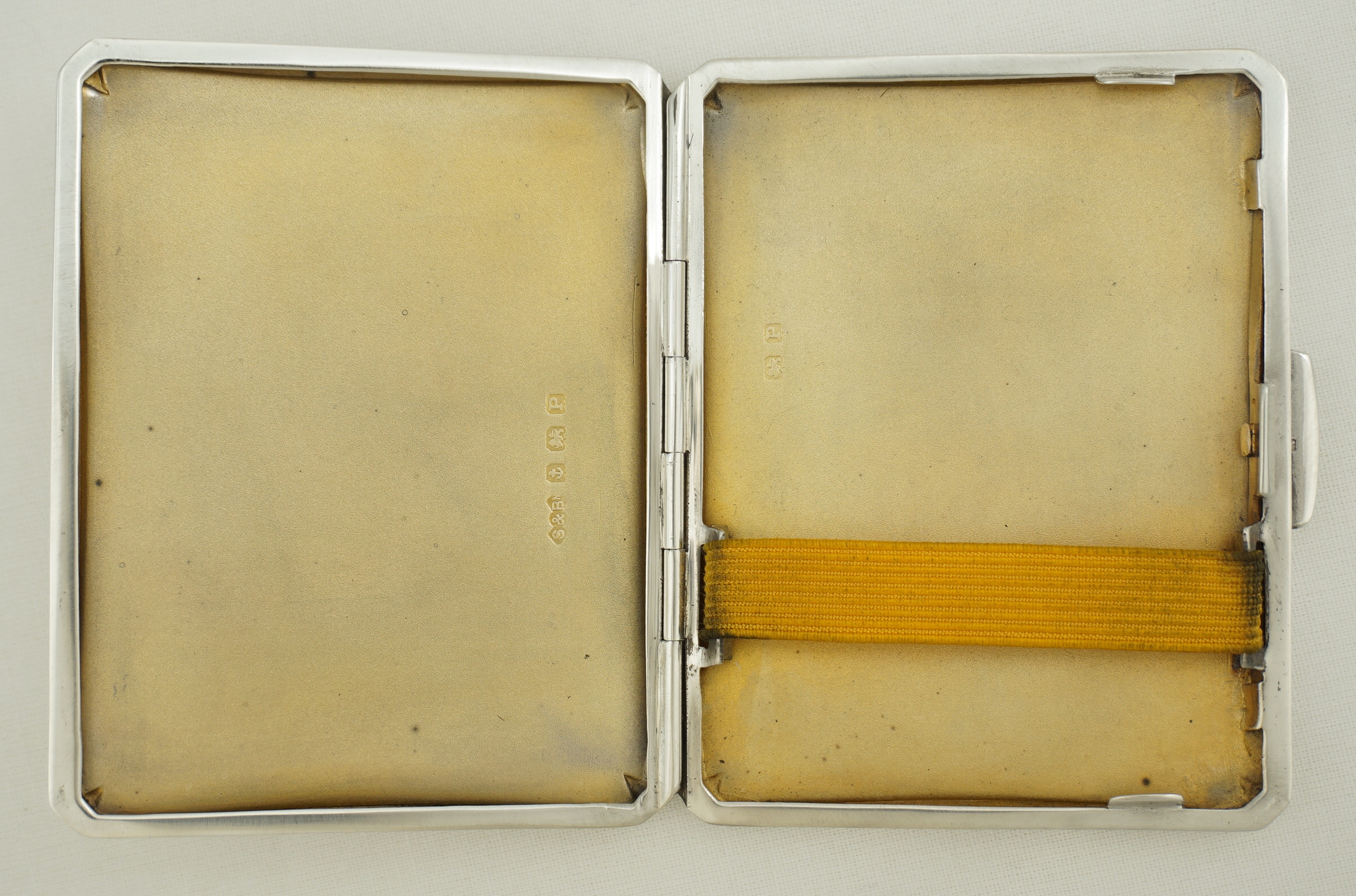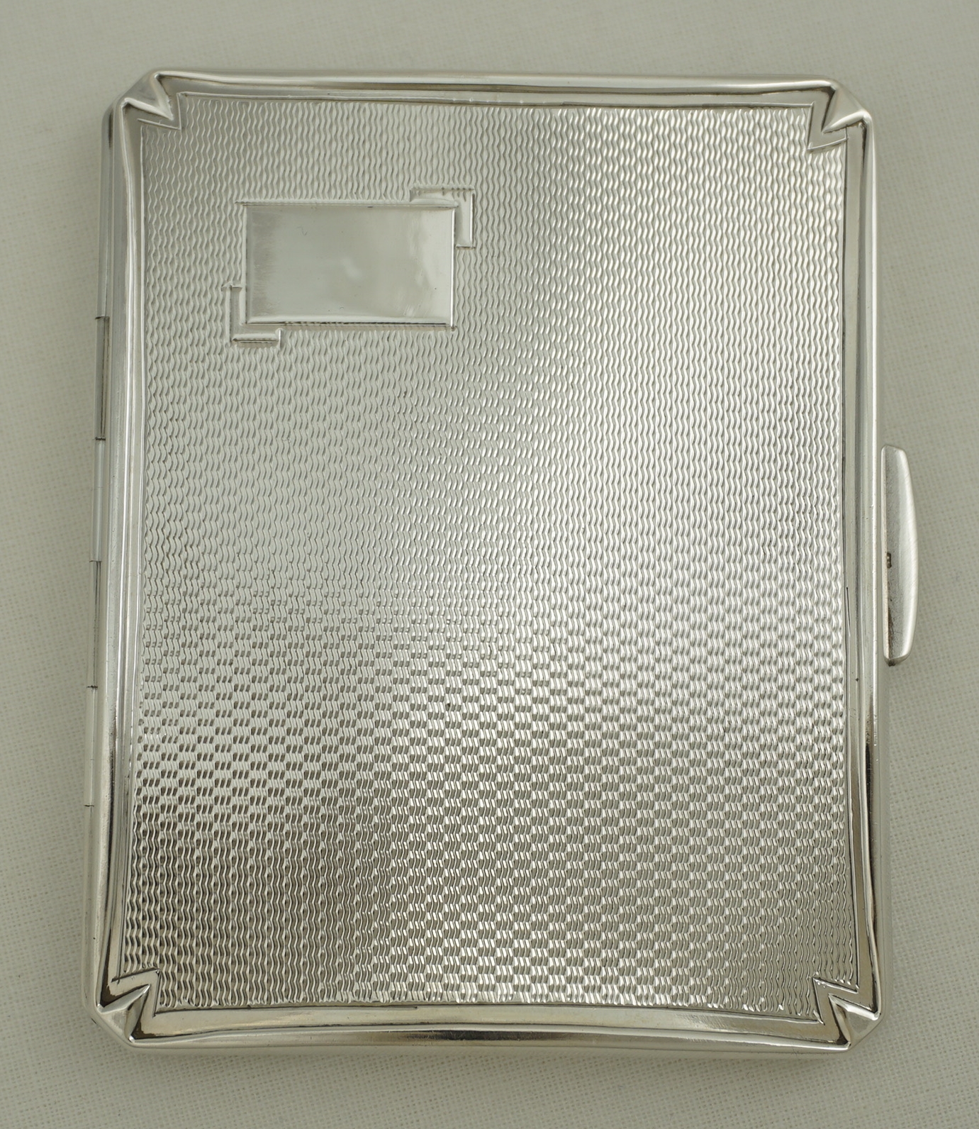 DESCRIPTION | Excellent vintage Art Deco English solid sterling silver cigarette case with canted corners, blank cartouche, engine turned engraved decoration and a matt gilded interior. |