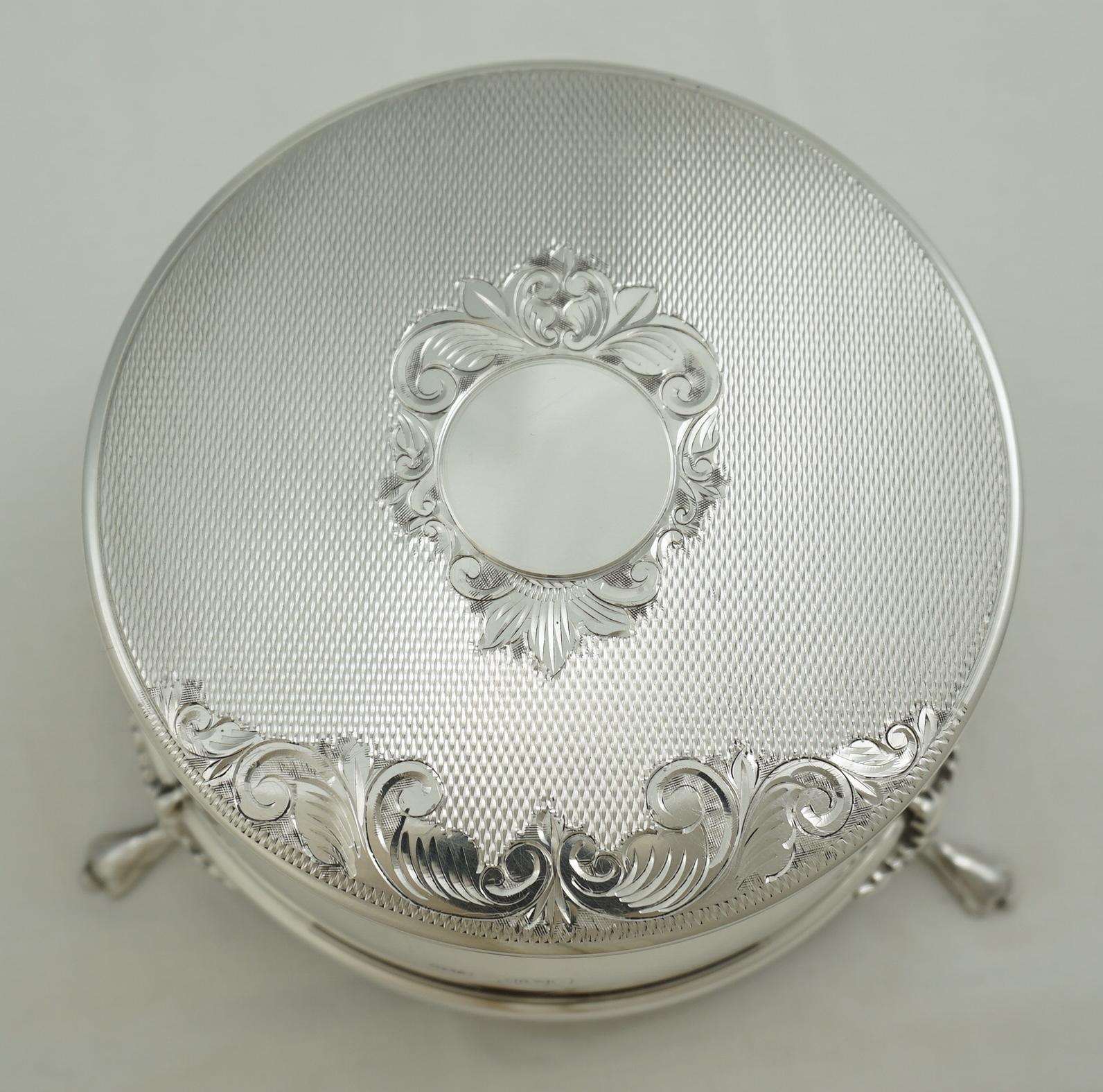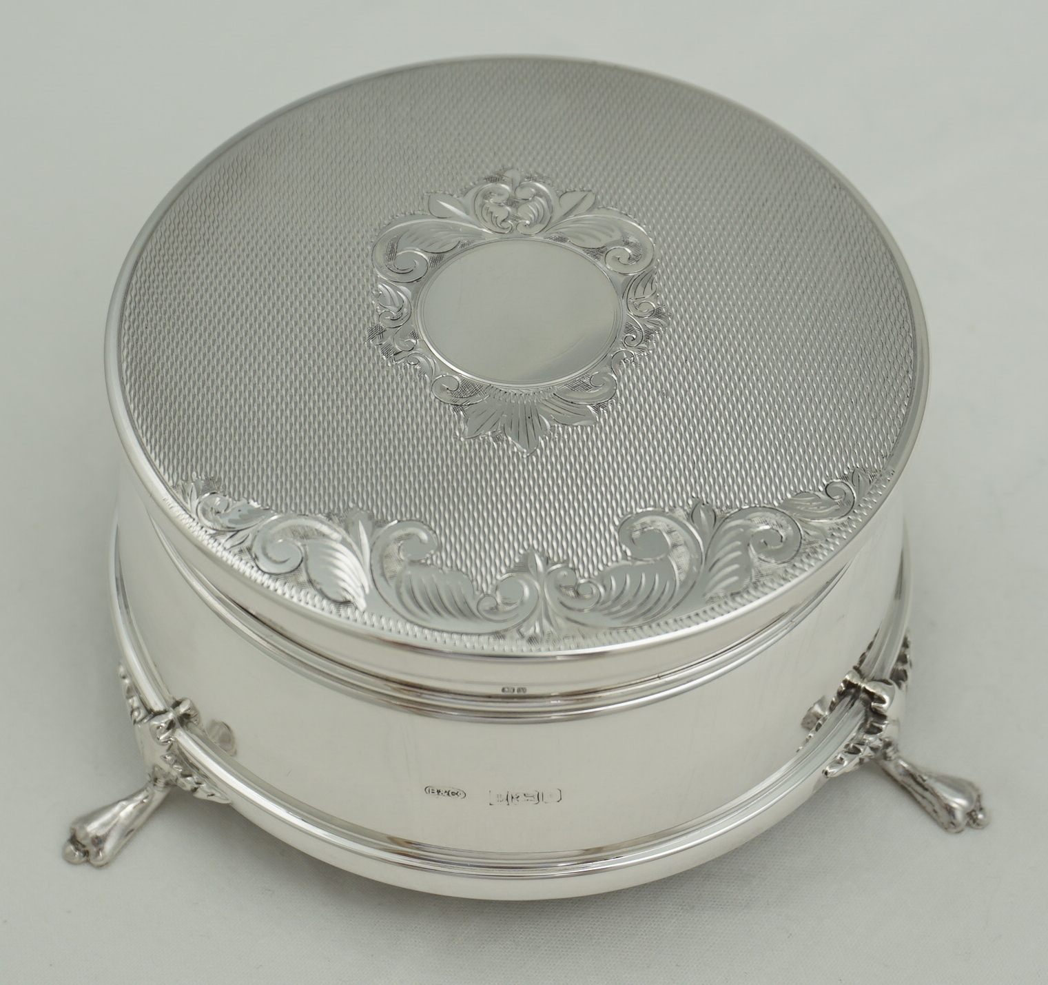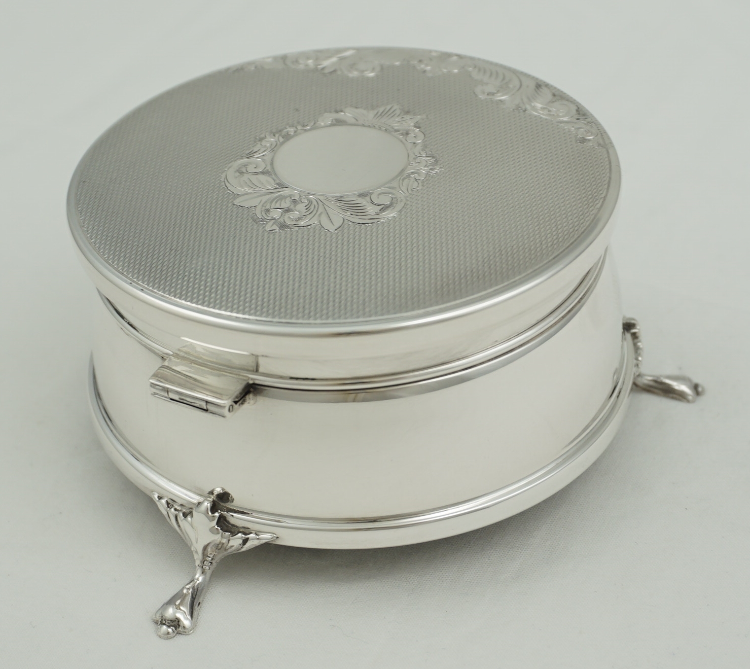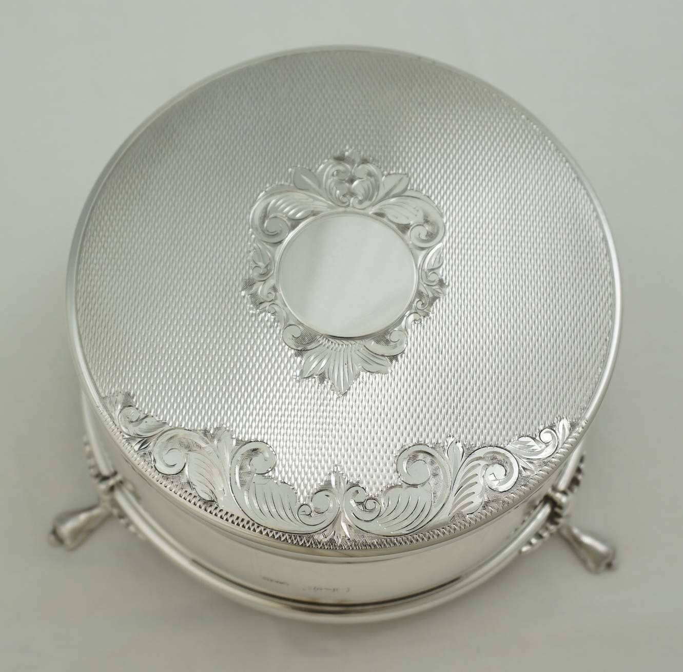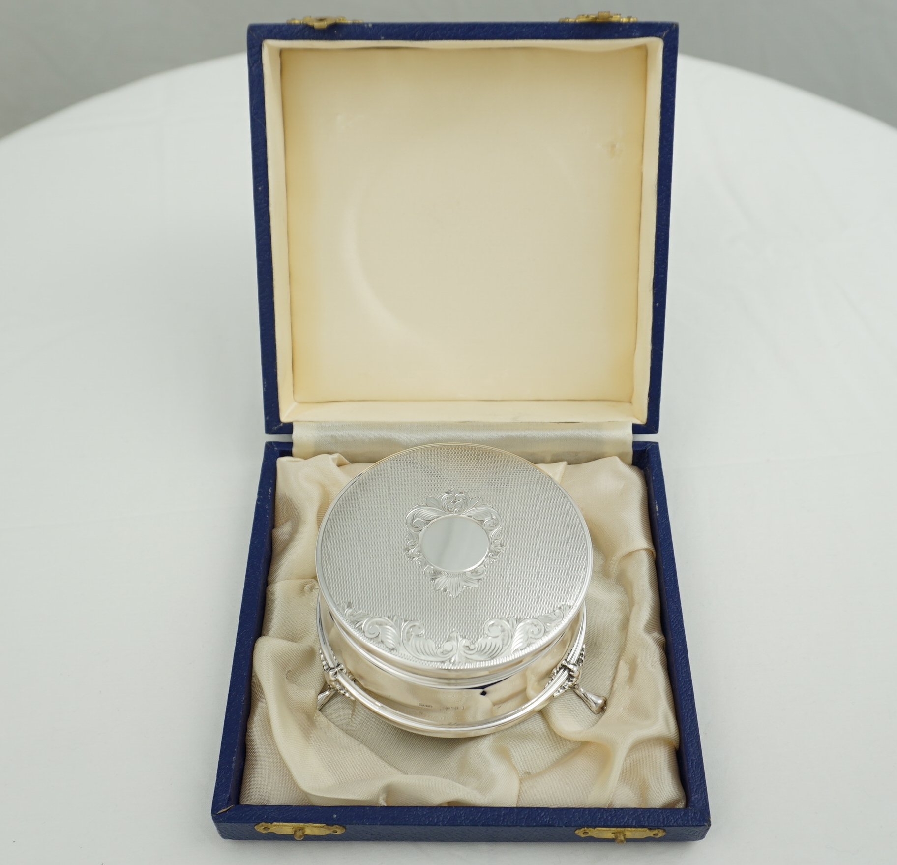 DESCRIPTION | Very good vintage English solid sterling silver trinket box with engine turned engraved decoration and a purple velvet lined interior. Contained within the original fitted case. |