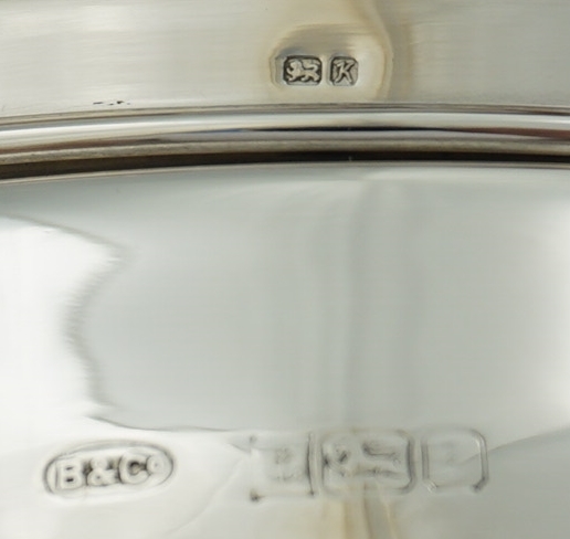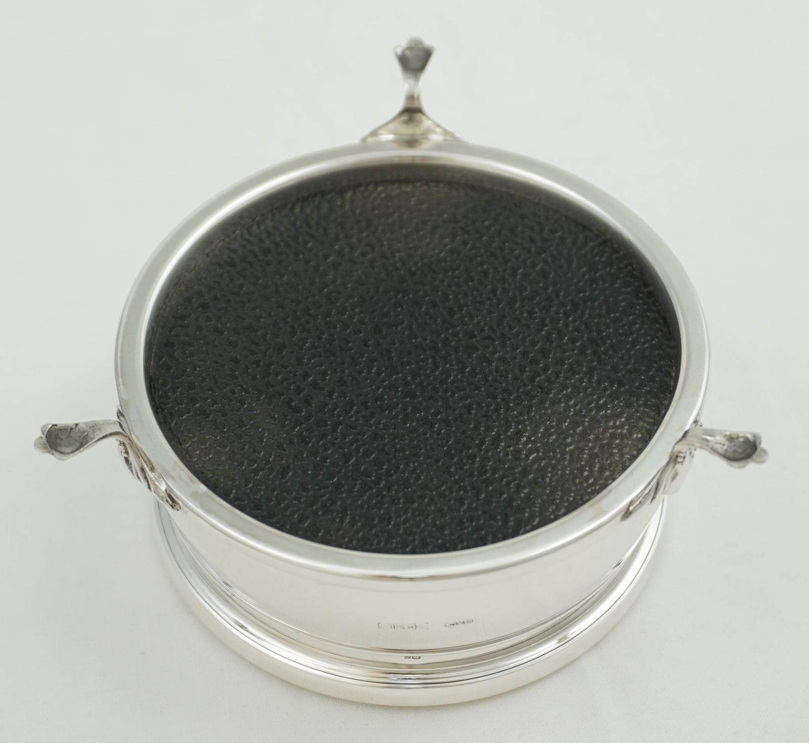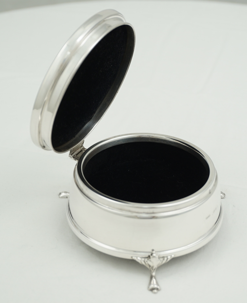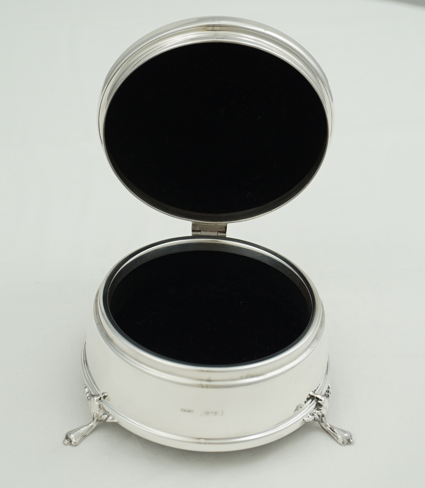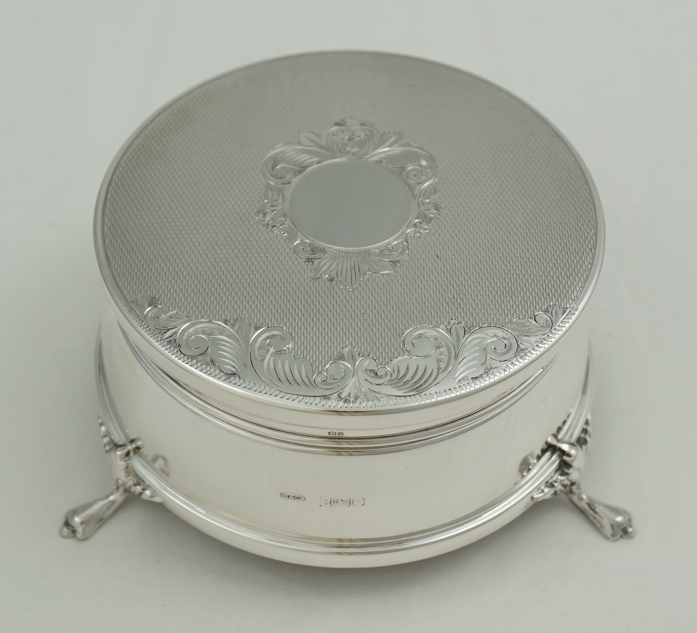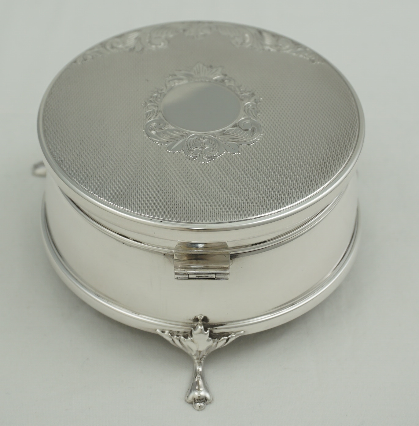 DESCRIPTION | Very good vintage English solid sterling silver trinket box with engine turned engraved decoration and a purple velvet lined interior. Contained within the original fitted case. |