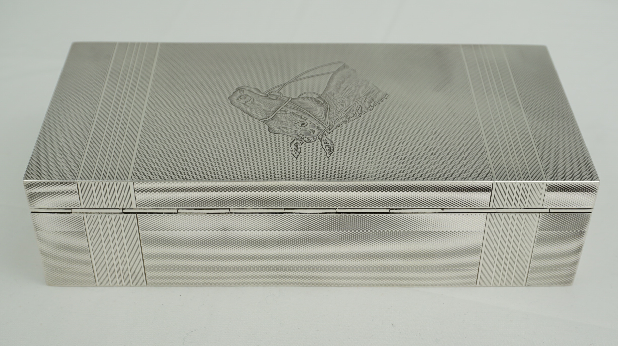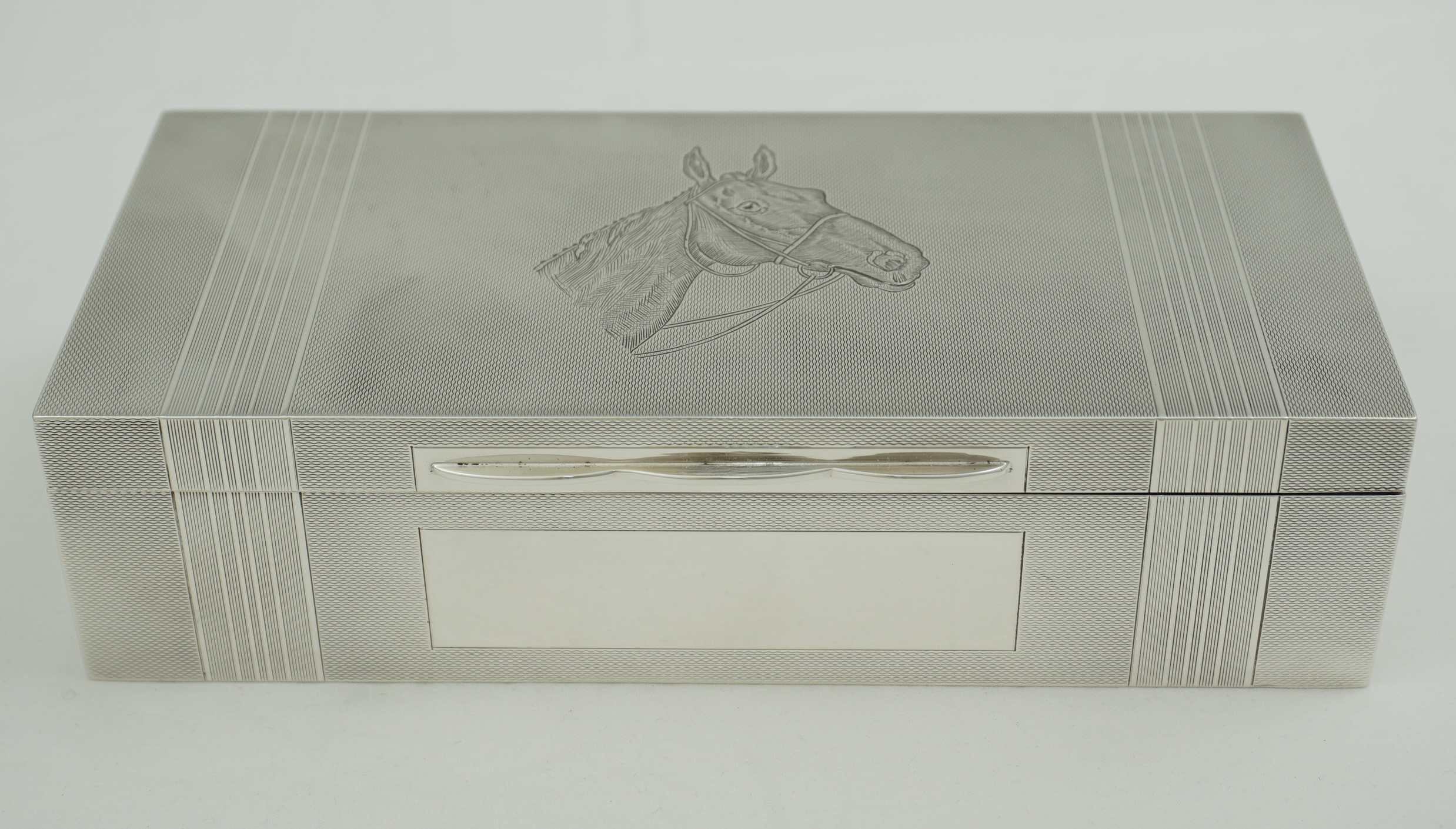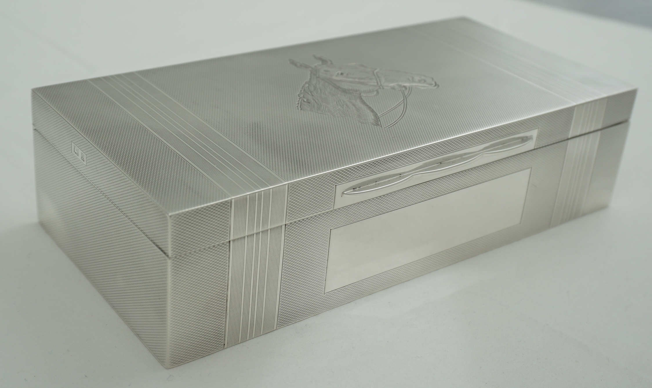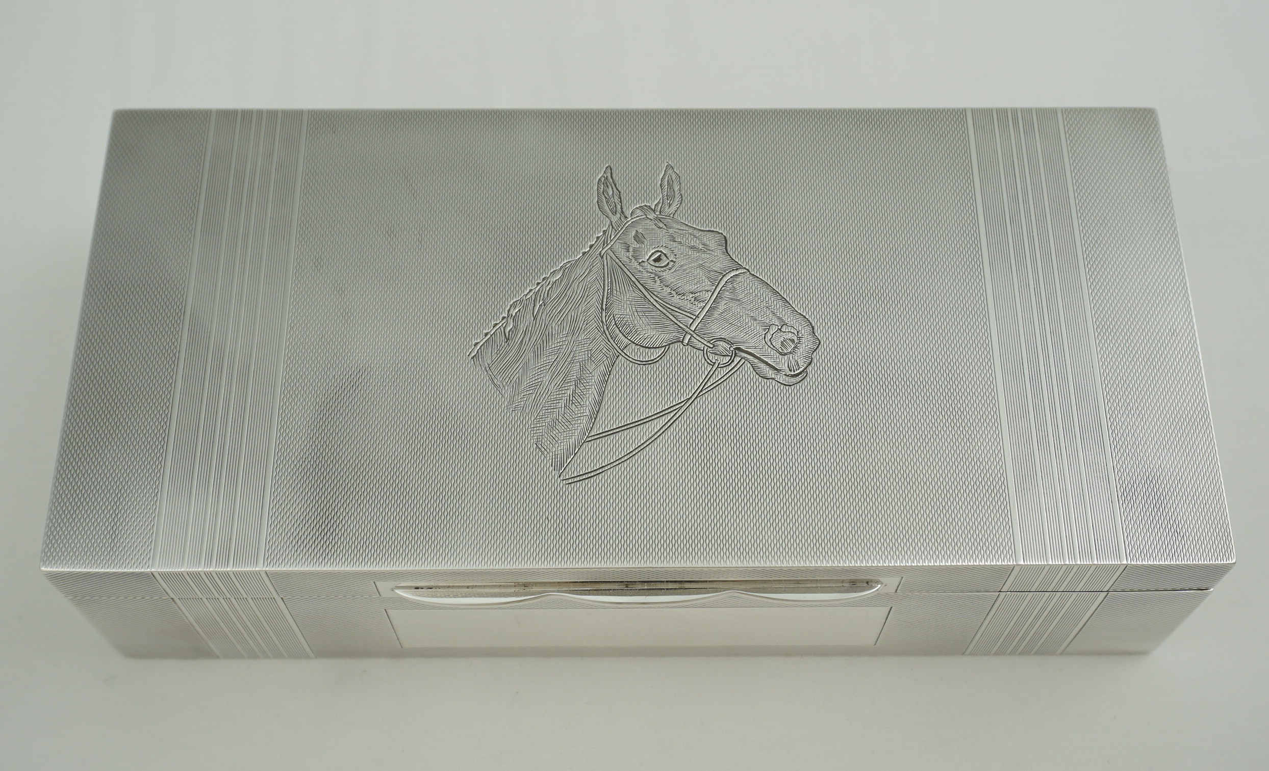 DESCRIPTION | High quality vintage English solid sterling silver cigarette box with engine turned engraved decoration, engraved horse portrait to the lid, blank rectangular cartouche and fully wood lined interior. |