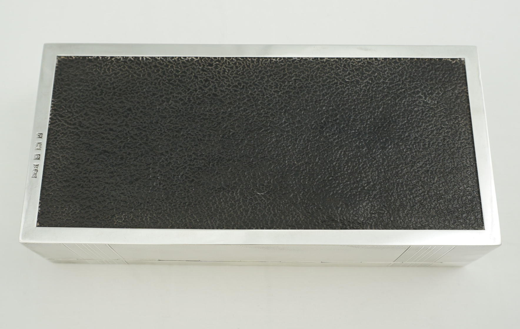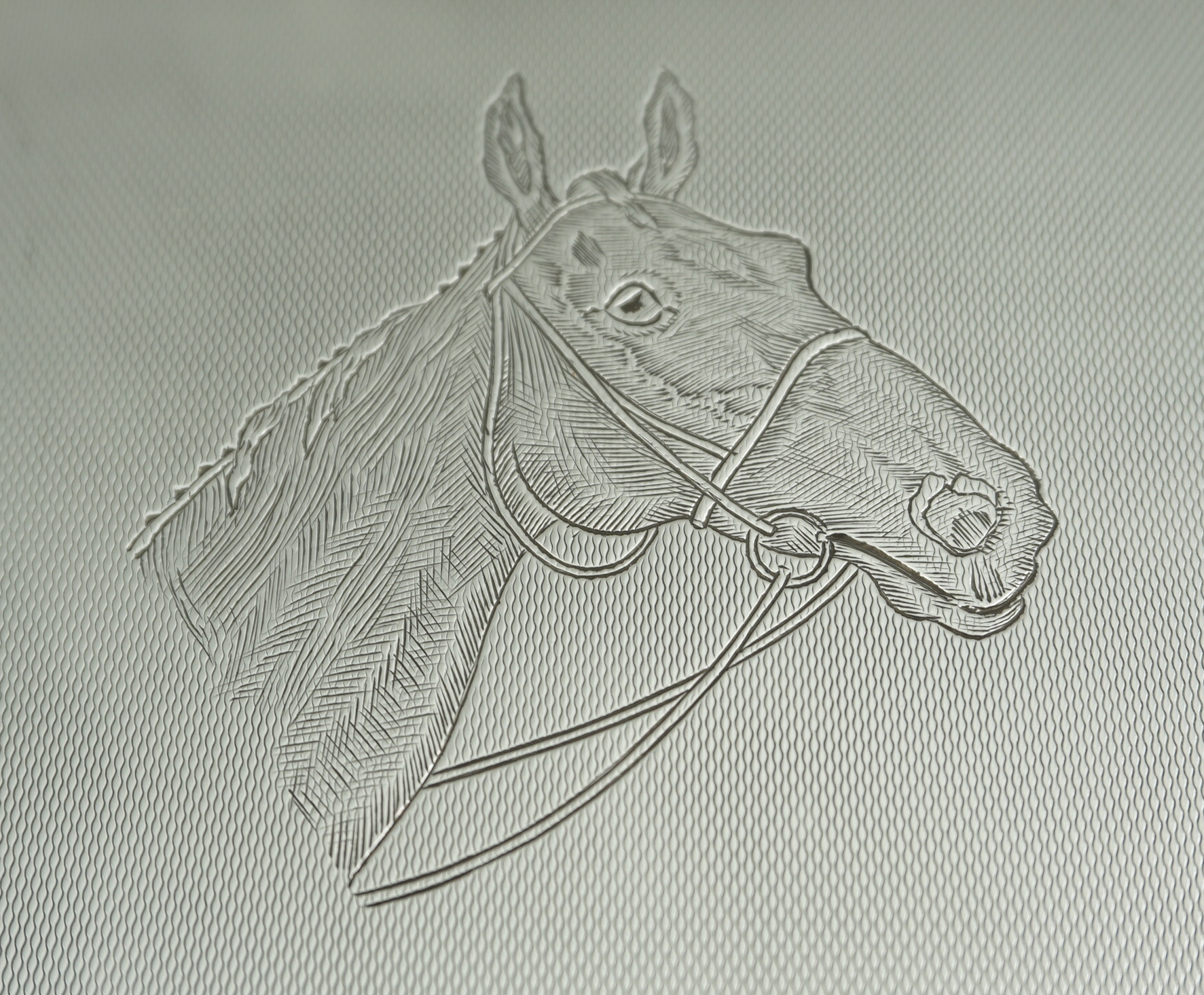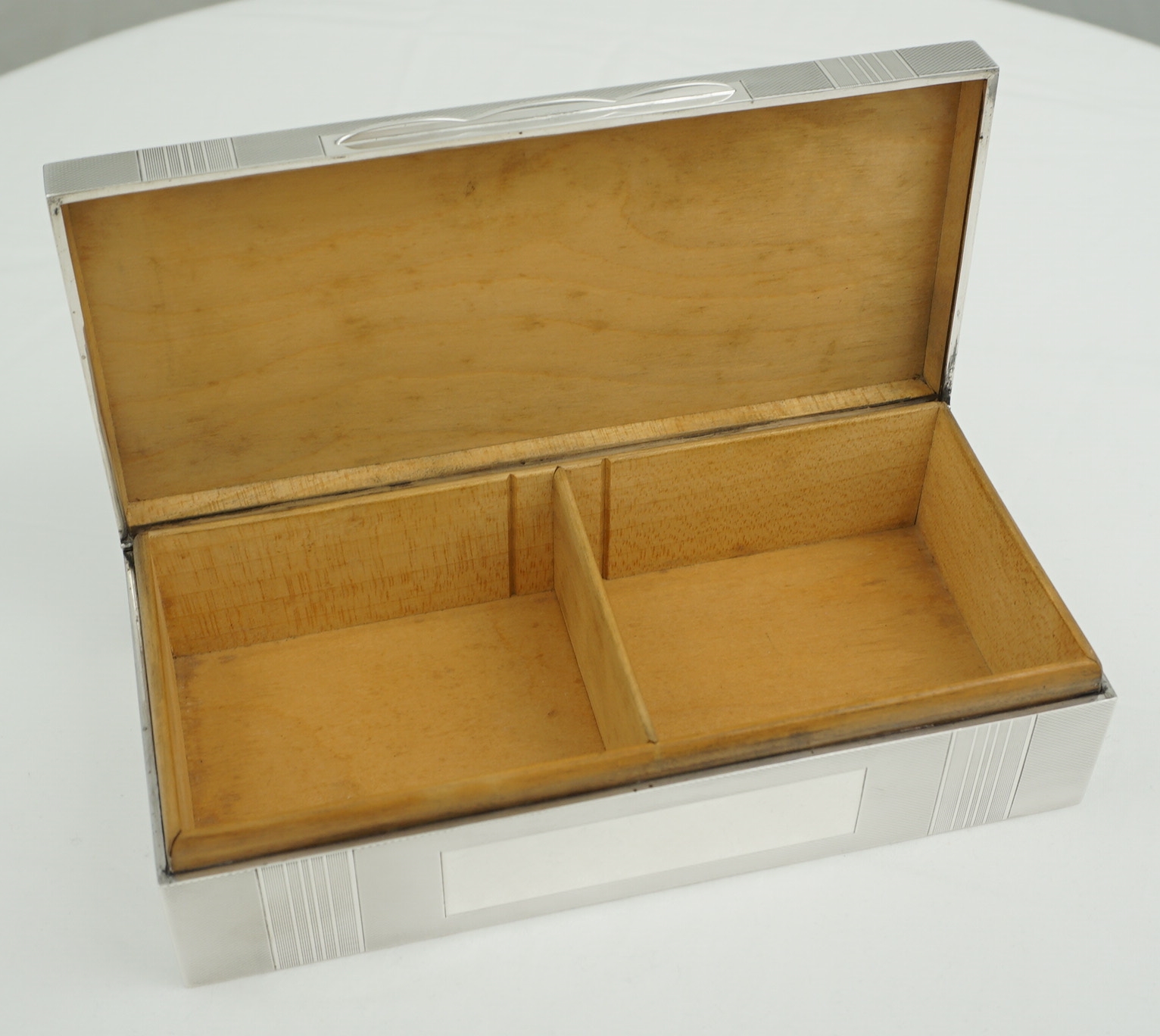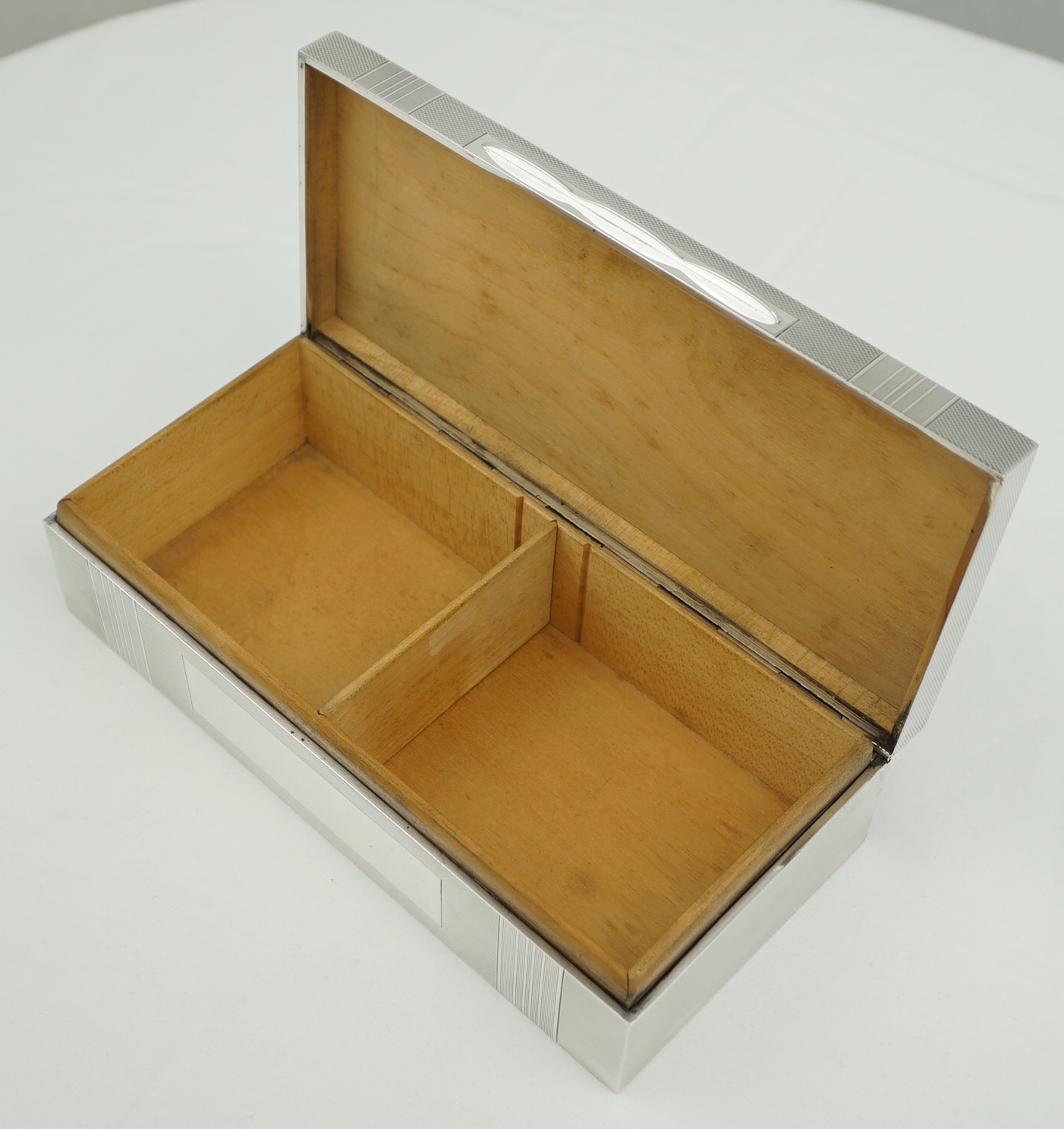 DESCRIPTION | High quality vintage English solid sterling silver cigarette box with engine turned engraved decoration, engraved horse portrait to the lid, blank rectangular cartouche and fully wood lined interior. |
