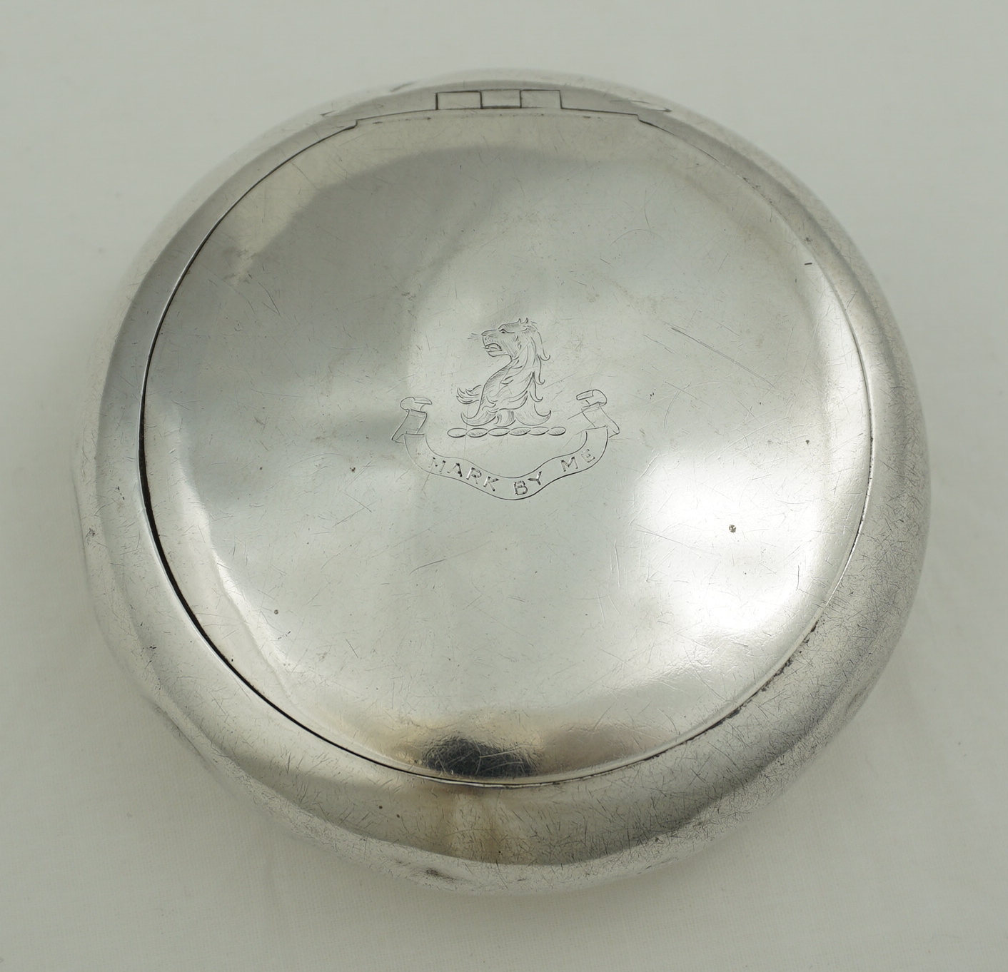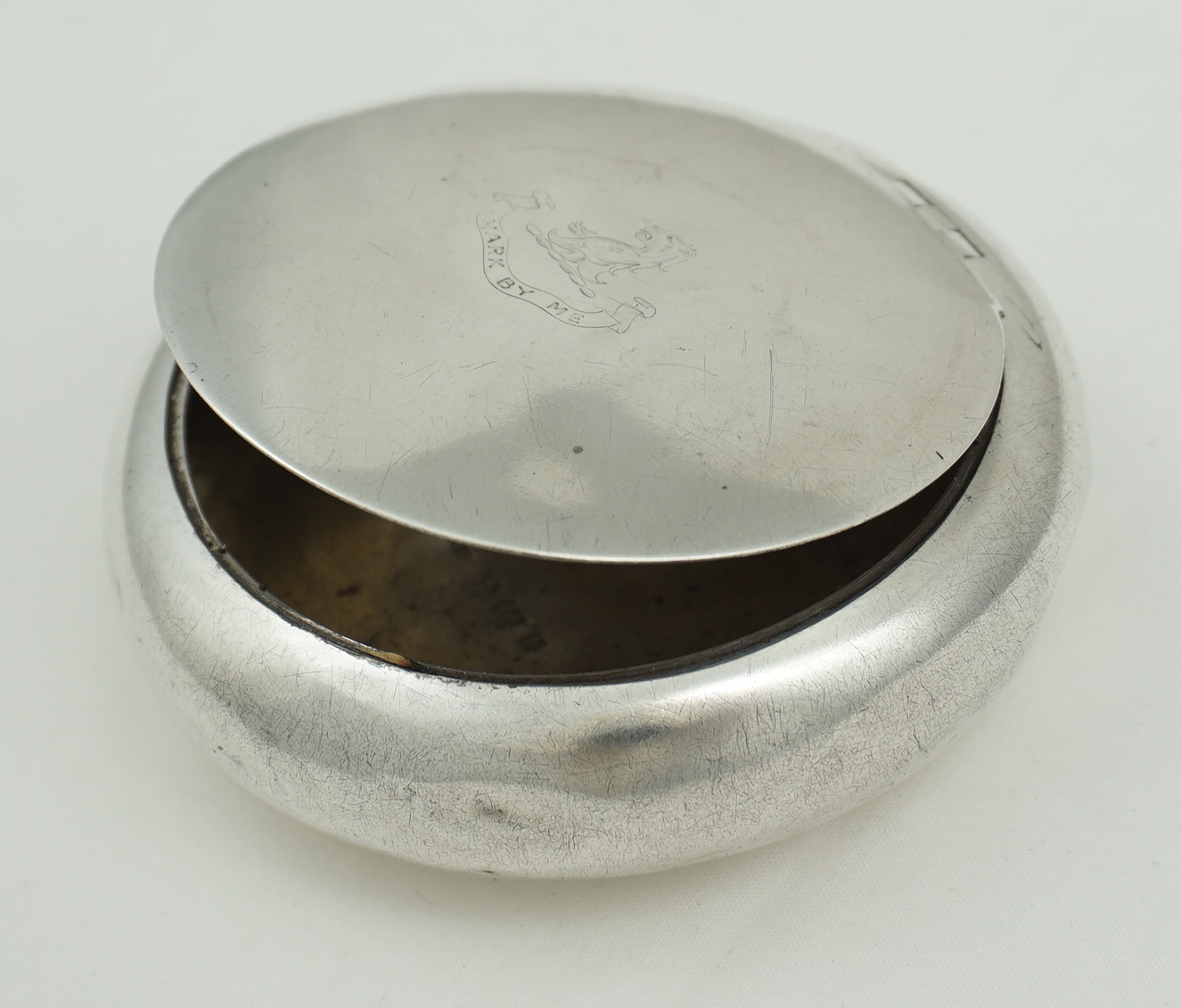 DESCRIPTION | Edwardian English solid sterling silver squeeze action tobacco box with concealed hinge, matt gilded interior and crest above motto engraved lid. You hold in one hand, squeeze the sides, the lid pops open and you fill your pipe bowl with your other hand. The spring action is about right now but I expect that when new it was stronger, hence the bumps. The lid would have opened with gusto and the box leapt out of your hand. |
