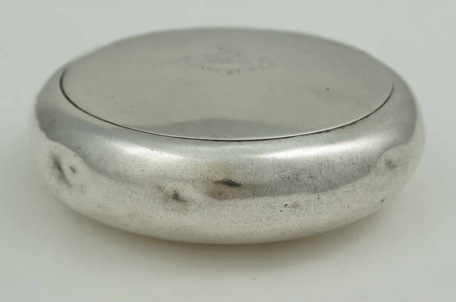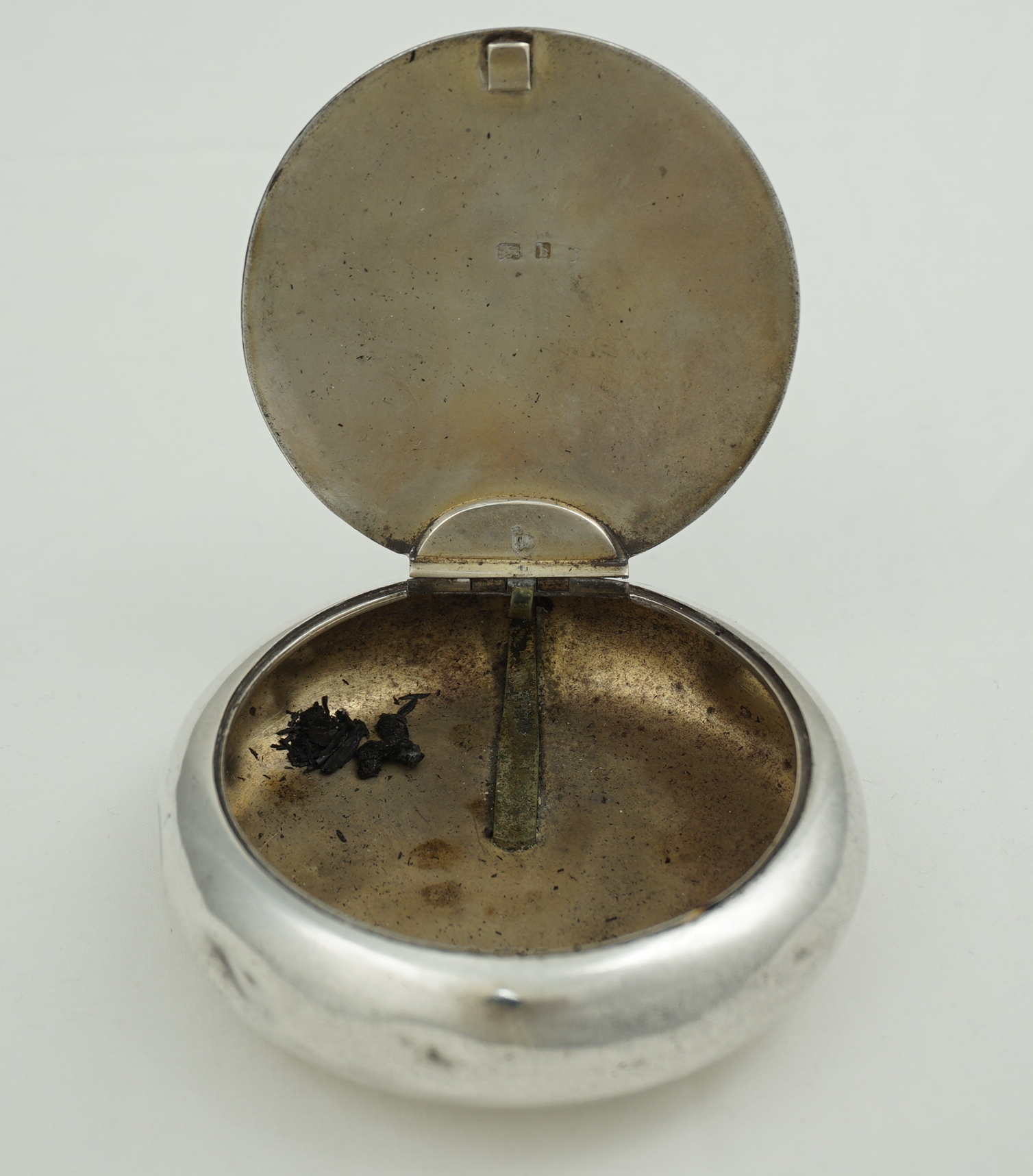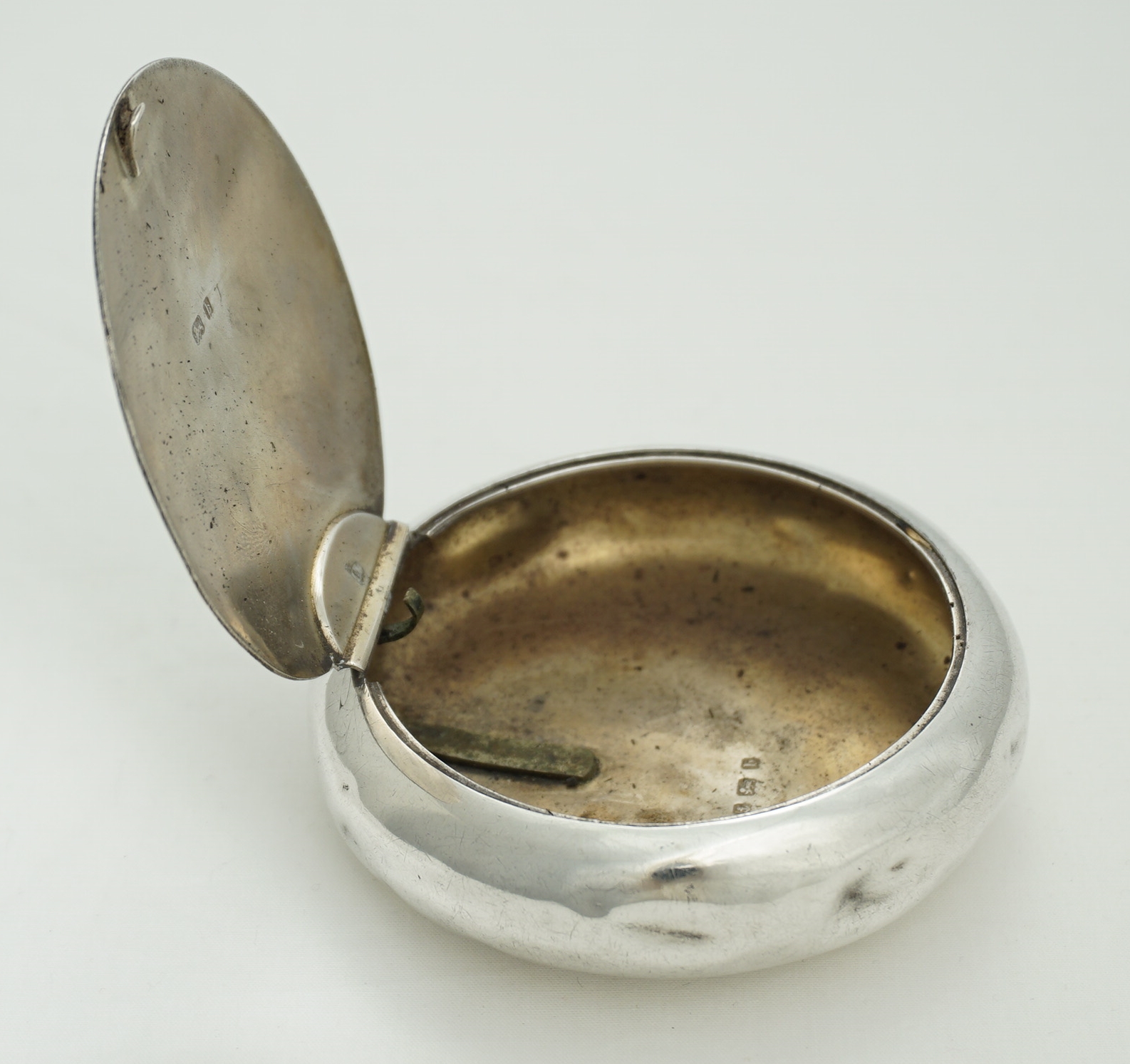 CONDITION | good, thick silver, rubbing to the engraving, surface marks and bumps, so many bumps in fact that even the bumps have bumps and yet all works fine. My silversmith could remove all bumps and polish but if you plan to use this box for the original purpose then I advise leaving all as is because these items are notoriously droppable. Inside is one hundred years of tobacco residue that will clean off easily to reveal the gilding but it seems a shame to remove that nostalgia and history so I have left it in place. Smells good too. |