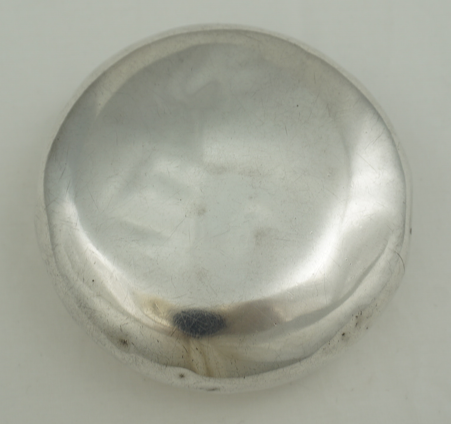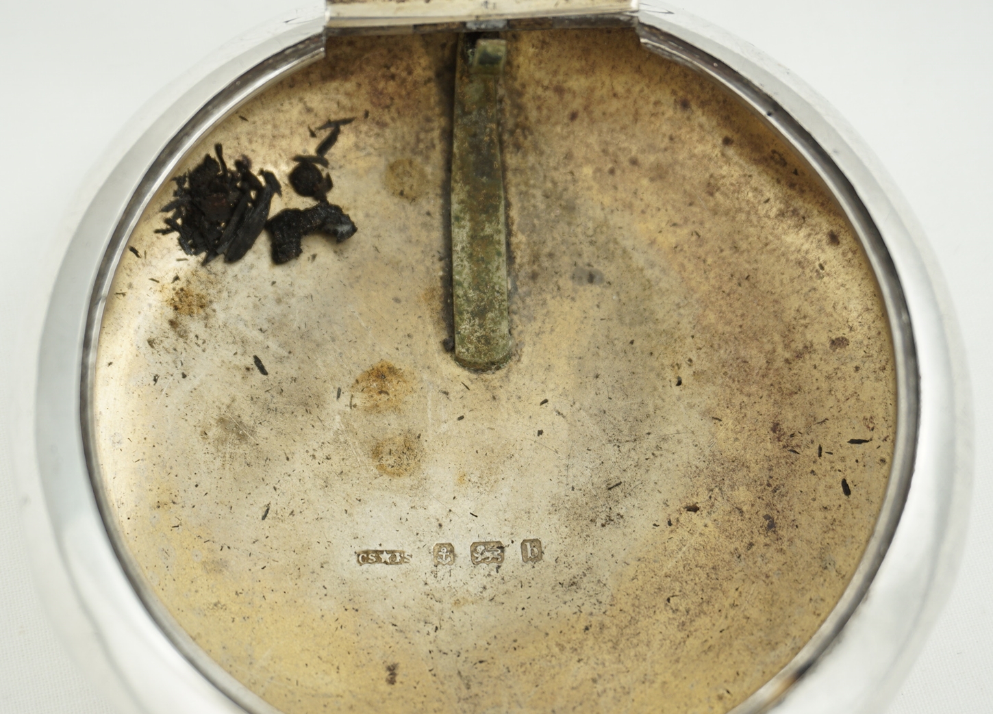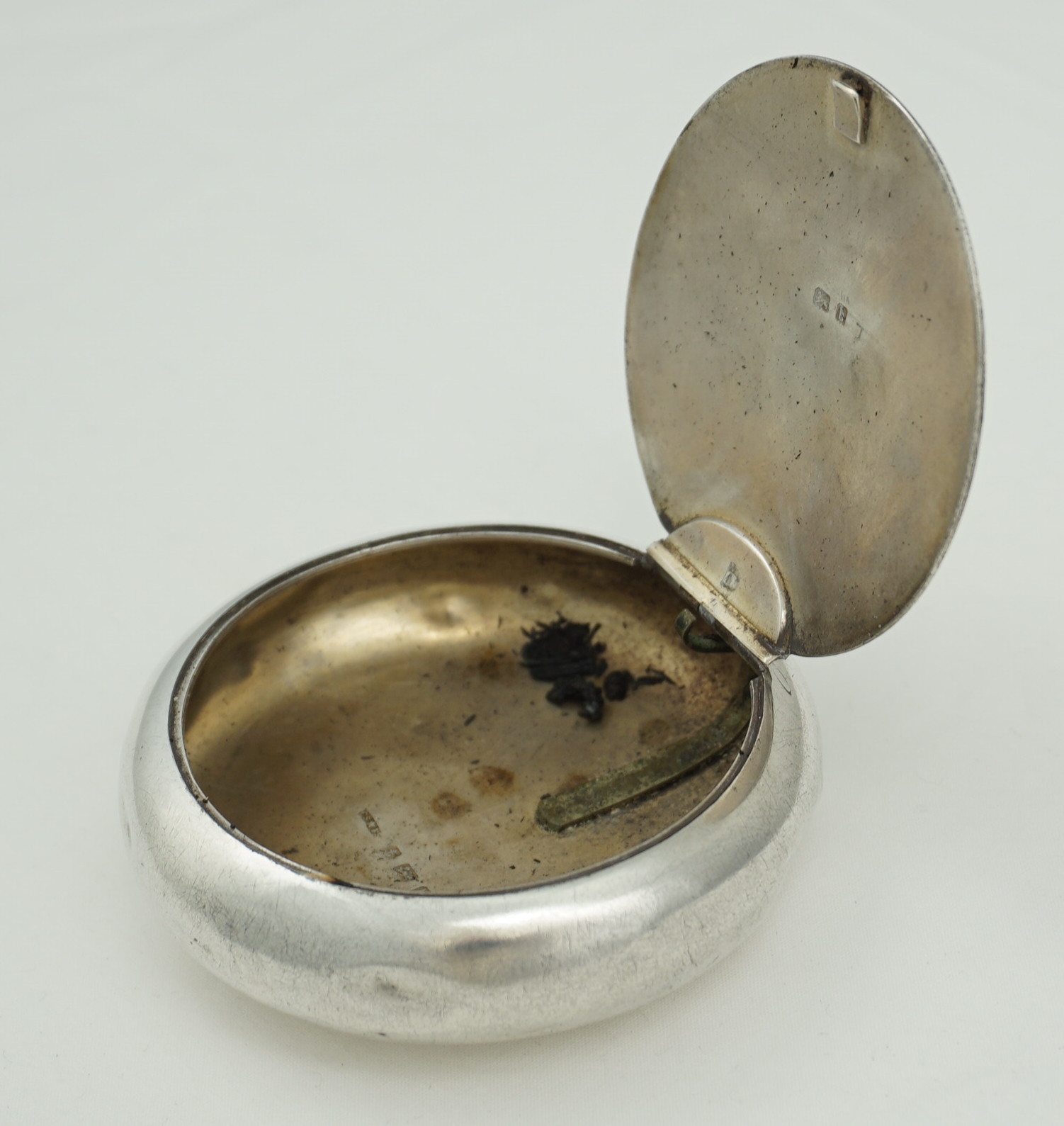 CONDITION | good, thick silver, rubbing to the engraving, surface marks and bumps, so many bumps in fact that even the bumps have bumps and yet all works fine. My silversmith could remove all bumps and polish but if you plan to use this box for the original purpose then I advise leaving all as is because these items are notoriously droppable. Inside is one hundred years of tobacco residue that will clean off easily to reveal the gilding but it seems a shame to remove that nostalgia and history so I have left it in place. Smells good too. |