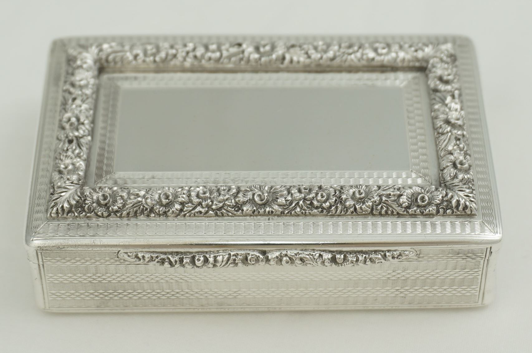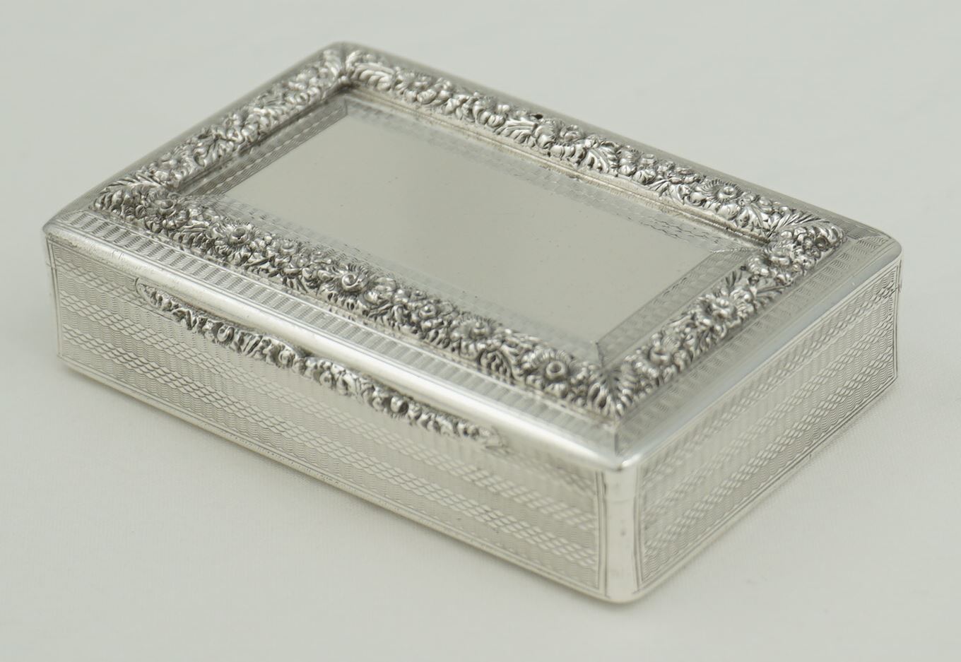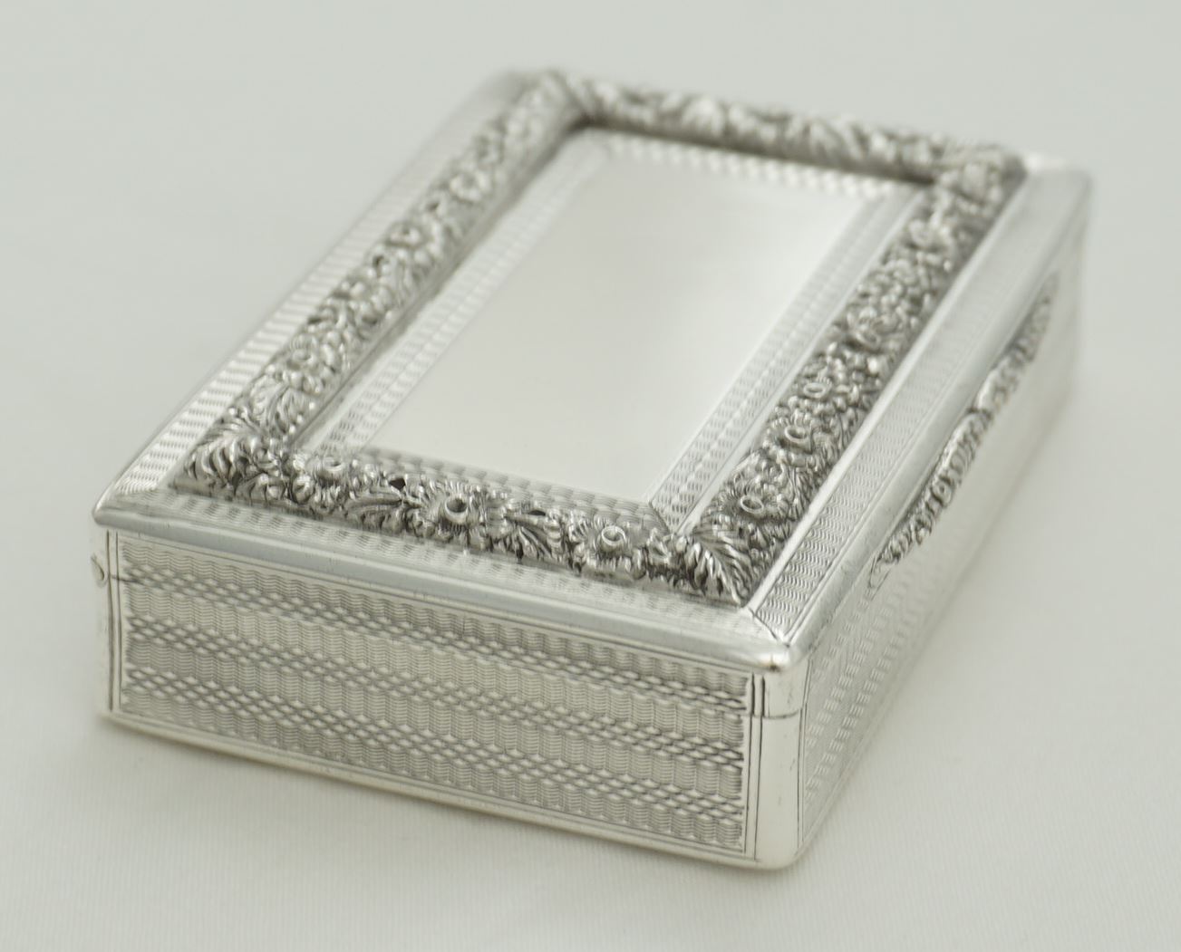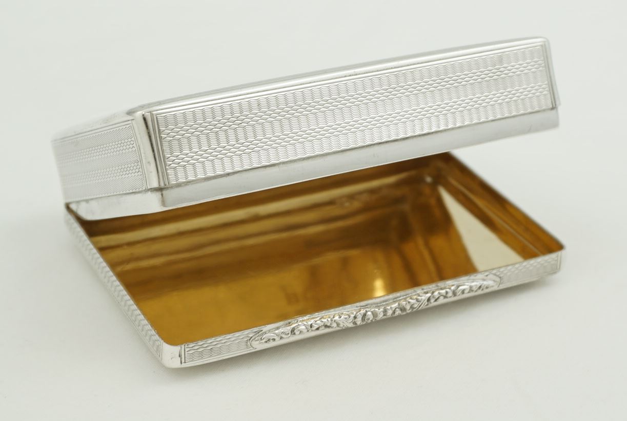 DESCRIPTION | Beautiful and useful vintage English solid sterling silver box with engine turned engraved decoration, mirror finish blank cartouche, piano hinged lid and a fully gilded interior. Probably intended as a snuff box and would now make a useful and discreet pill box. In image six I have pictured the box open and upside down to display the perfect hinge action. |