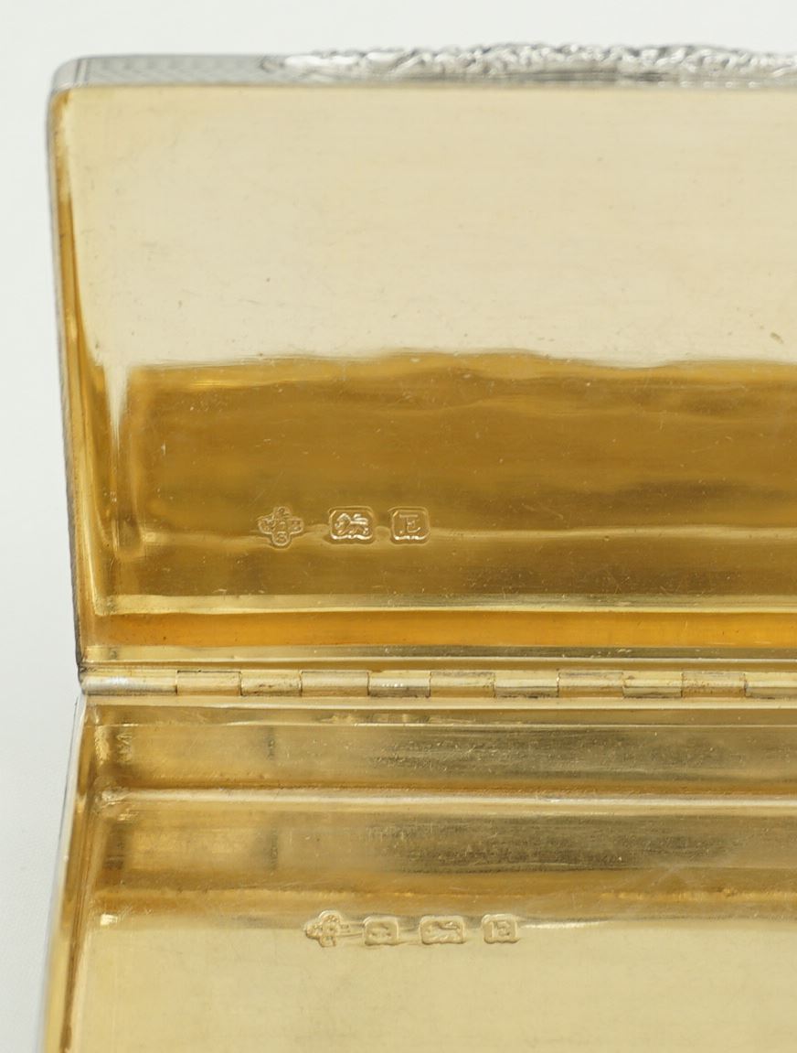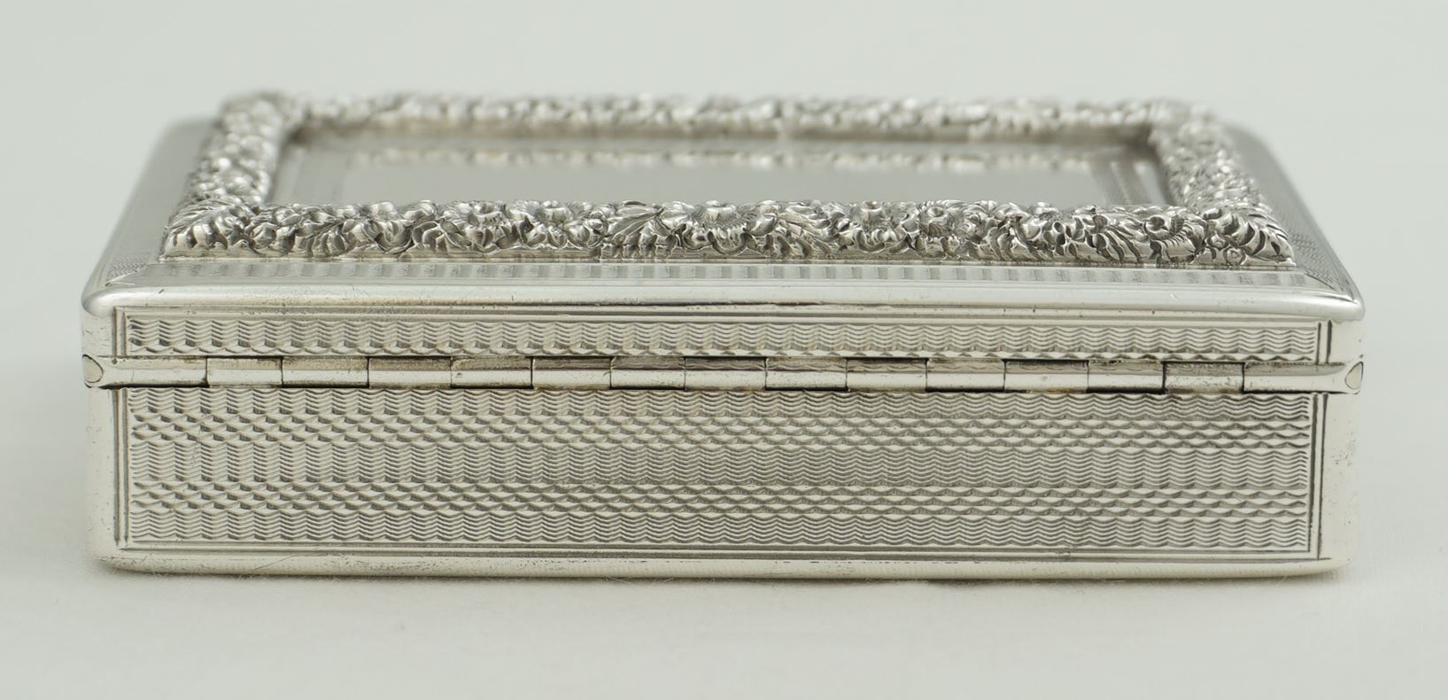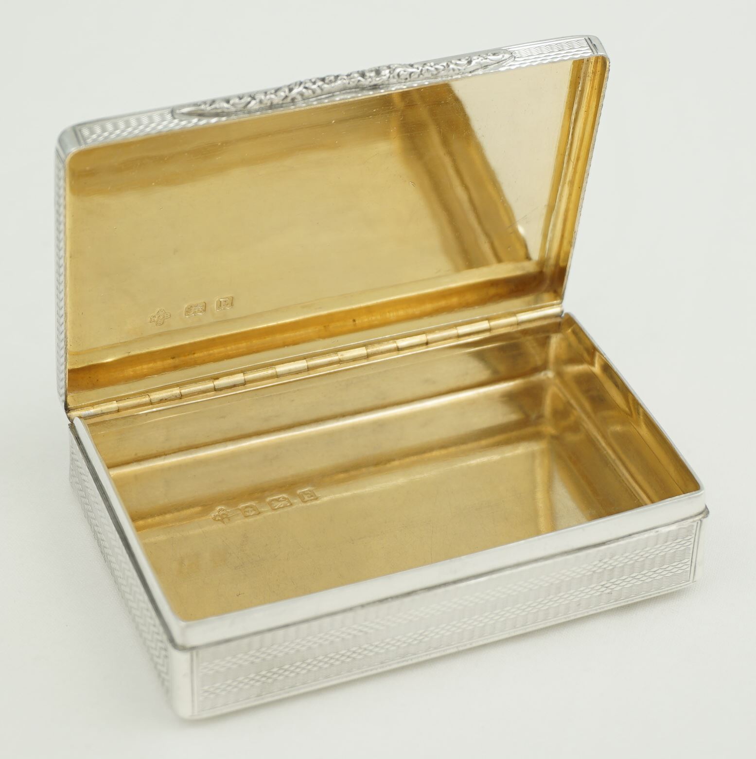 DESCRIPTION | Beautiful and useful vintage English solid sterling silver box with engine turned engraved decoration, mirror finish blank cartouche, piano hinged lid and a fully gilded interior. Probably intended as a snuff box and would now make a useful and discreet pill box. In image six I have pictured the box open and upside down to display the perfect hinge action. |