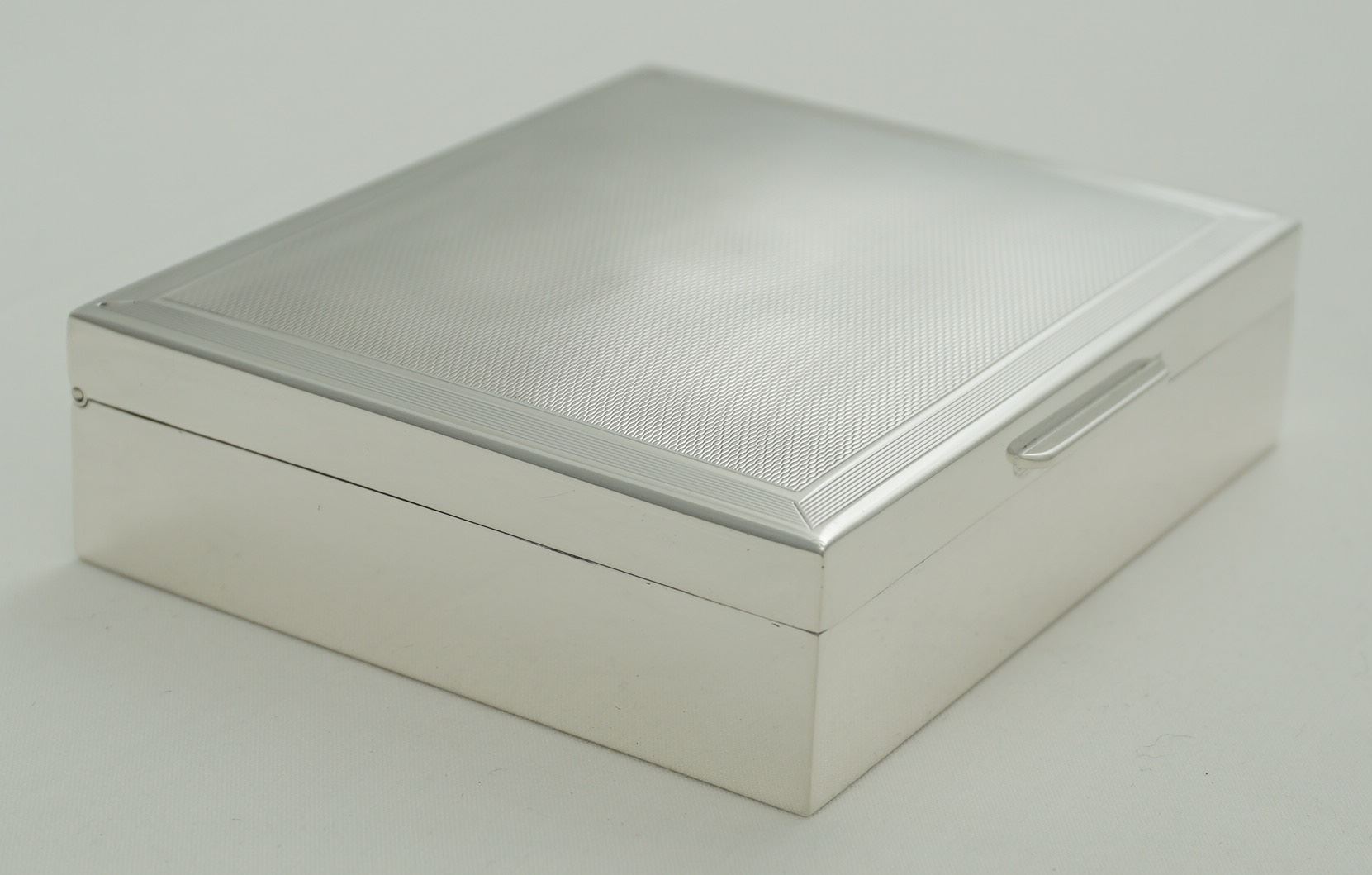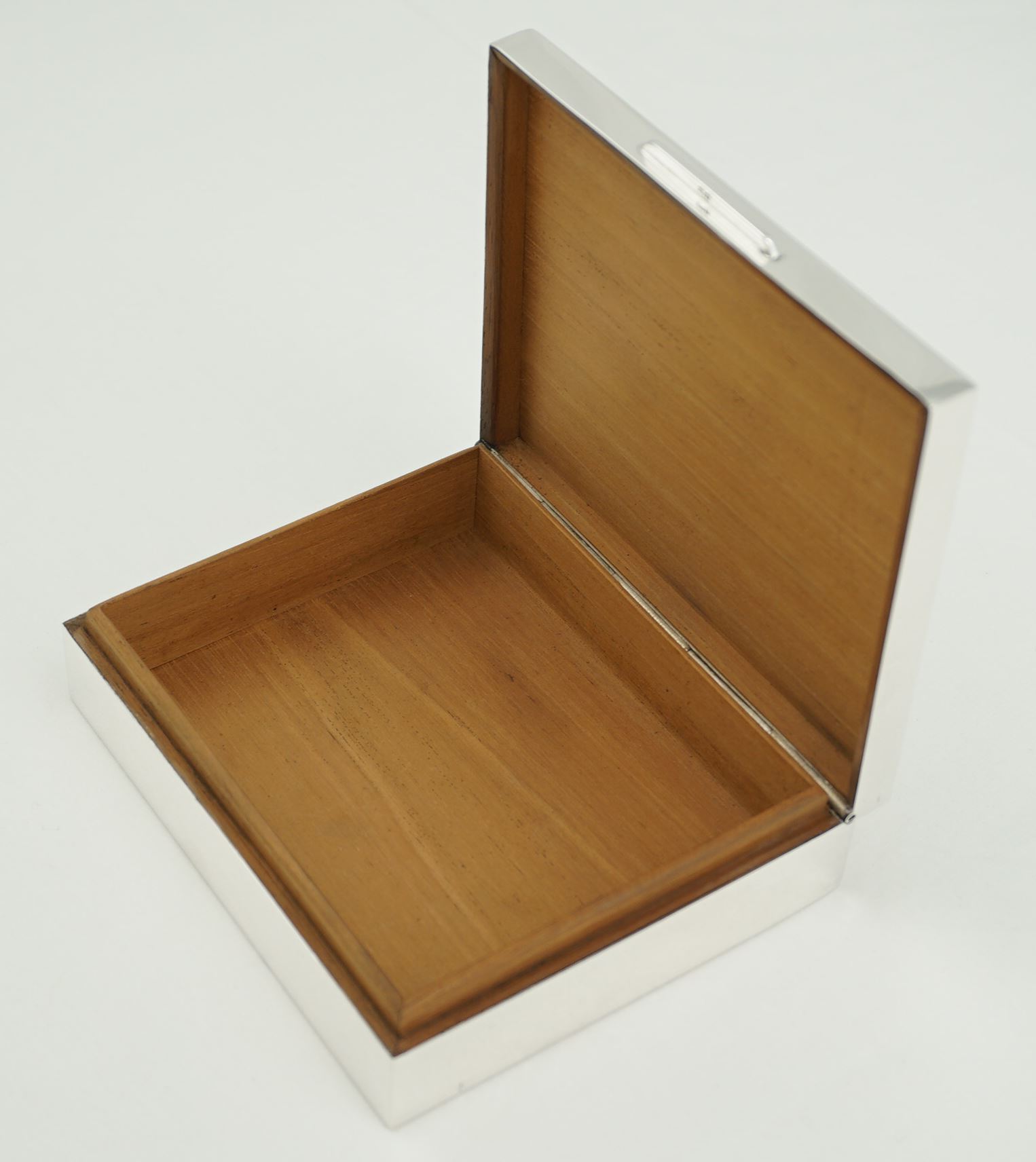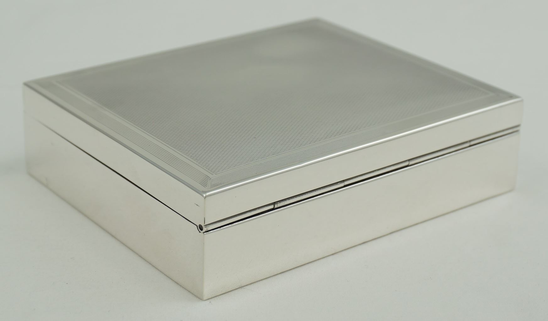 DESCRIPTION | Vintage English solid sterling silver cigarette box with engine turned engraved decoration to the lid and a beautiful fully fitted cedar interior that still smells wonderful. |