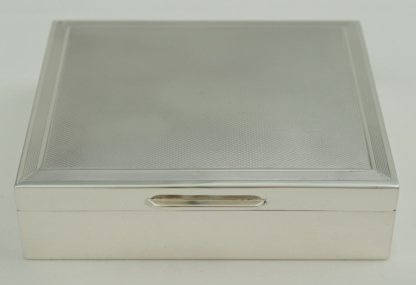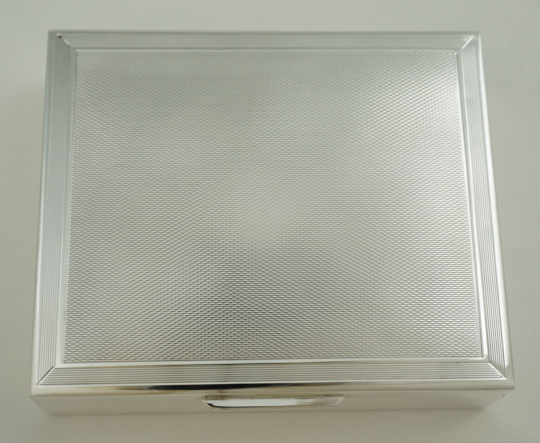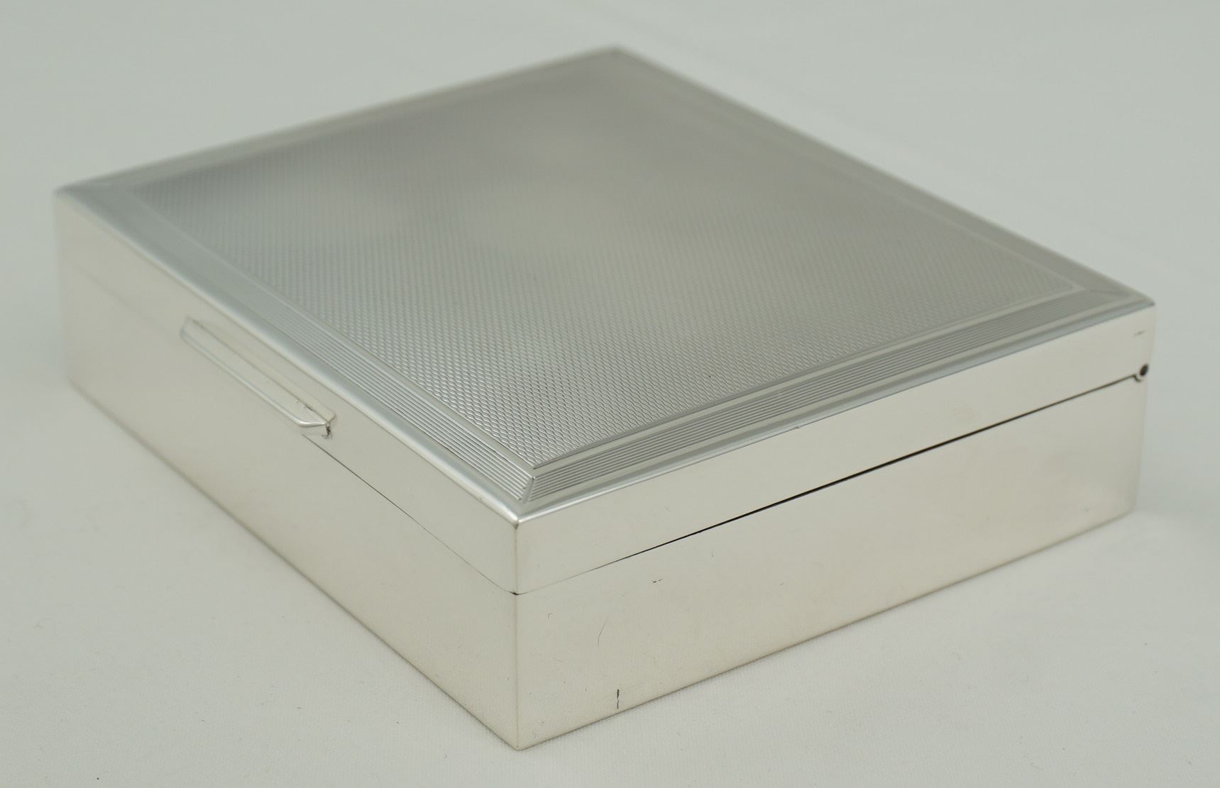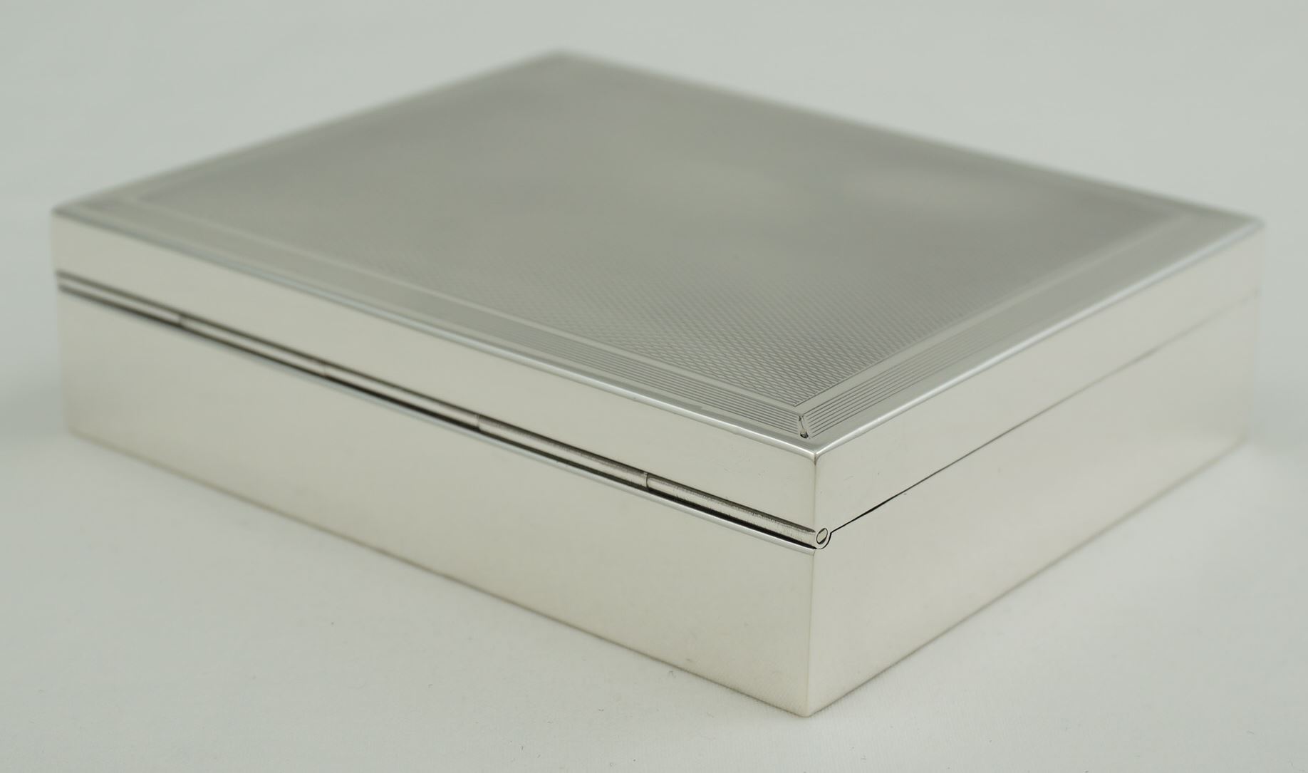 DESCRIPTION | Vintage English solid sterling silver cigarette box with engine turned engraved decoration to the lid and a beautiful fully fitted cedar interior that still smells wonderful. |