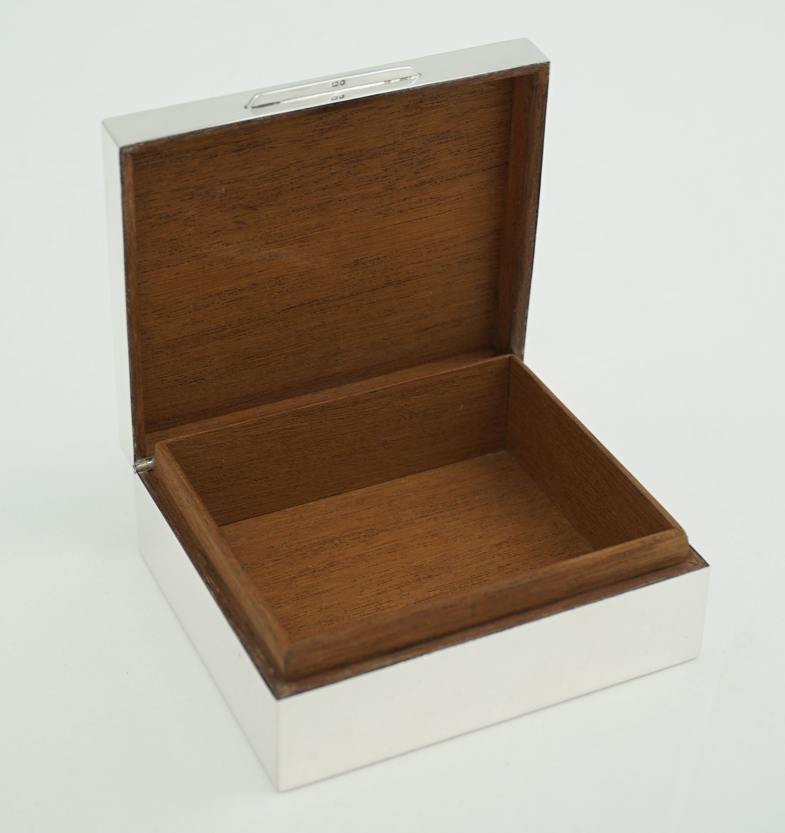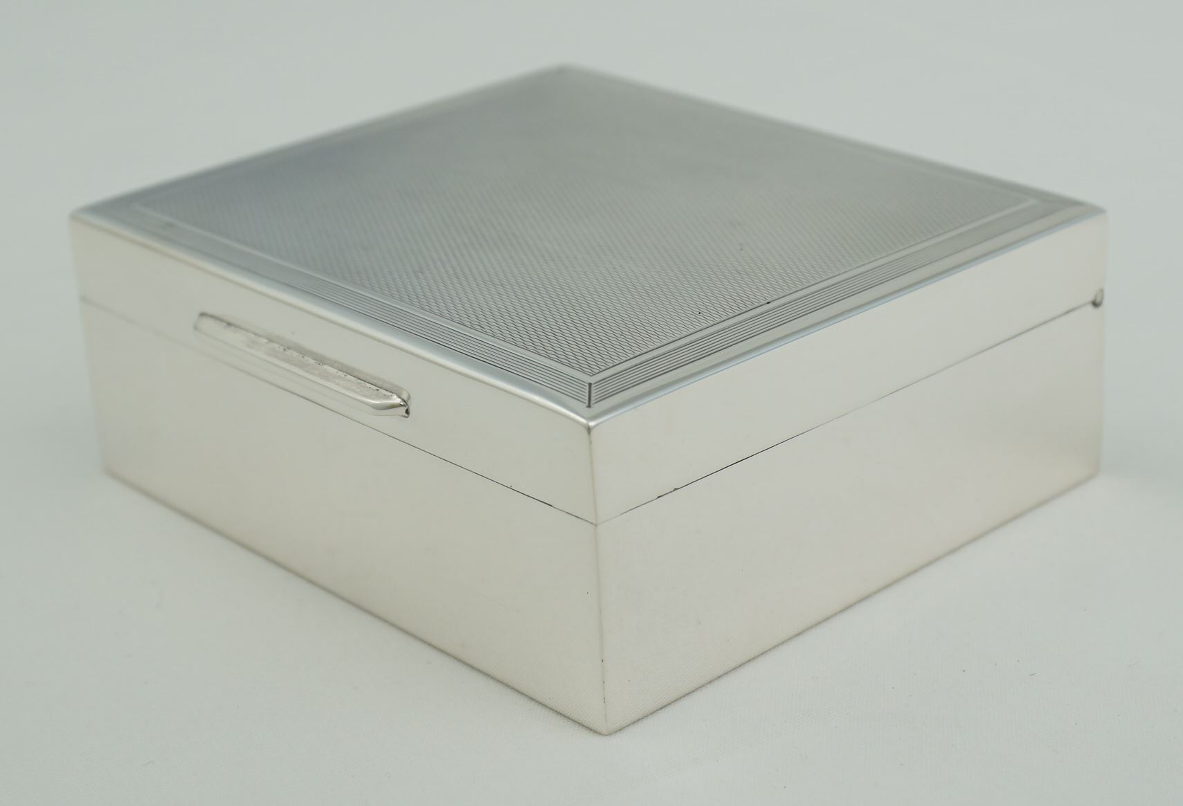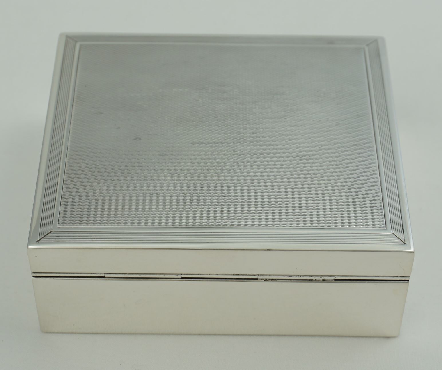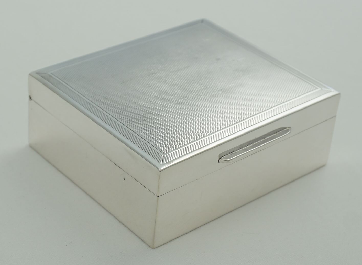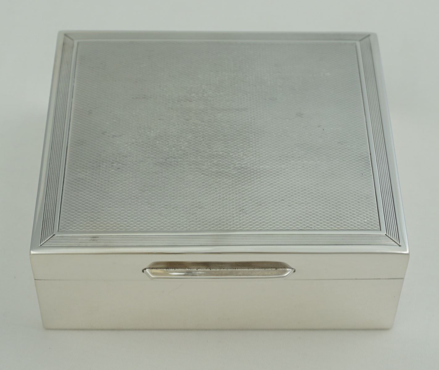 DESCRIPTION | Vintage English solid sterling silver cigarette box with engine turned engraved decoration to the lid and a beautiful fully fitted cedar interior that still smells wonderful. This is a pair to box m9010. |