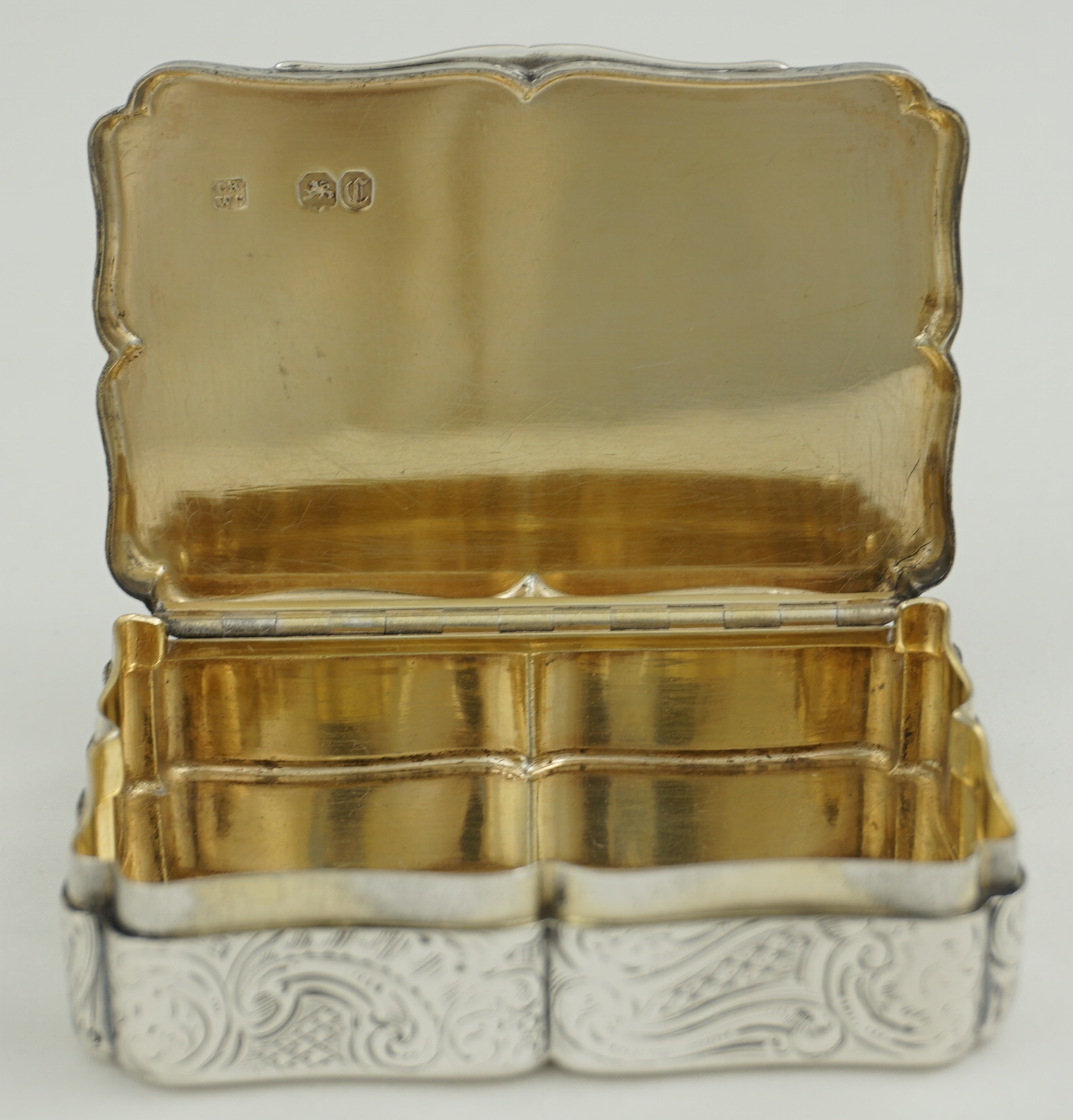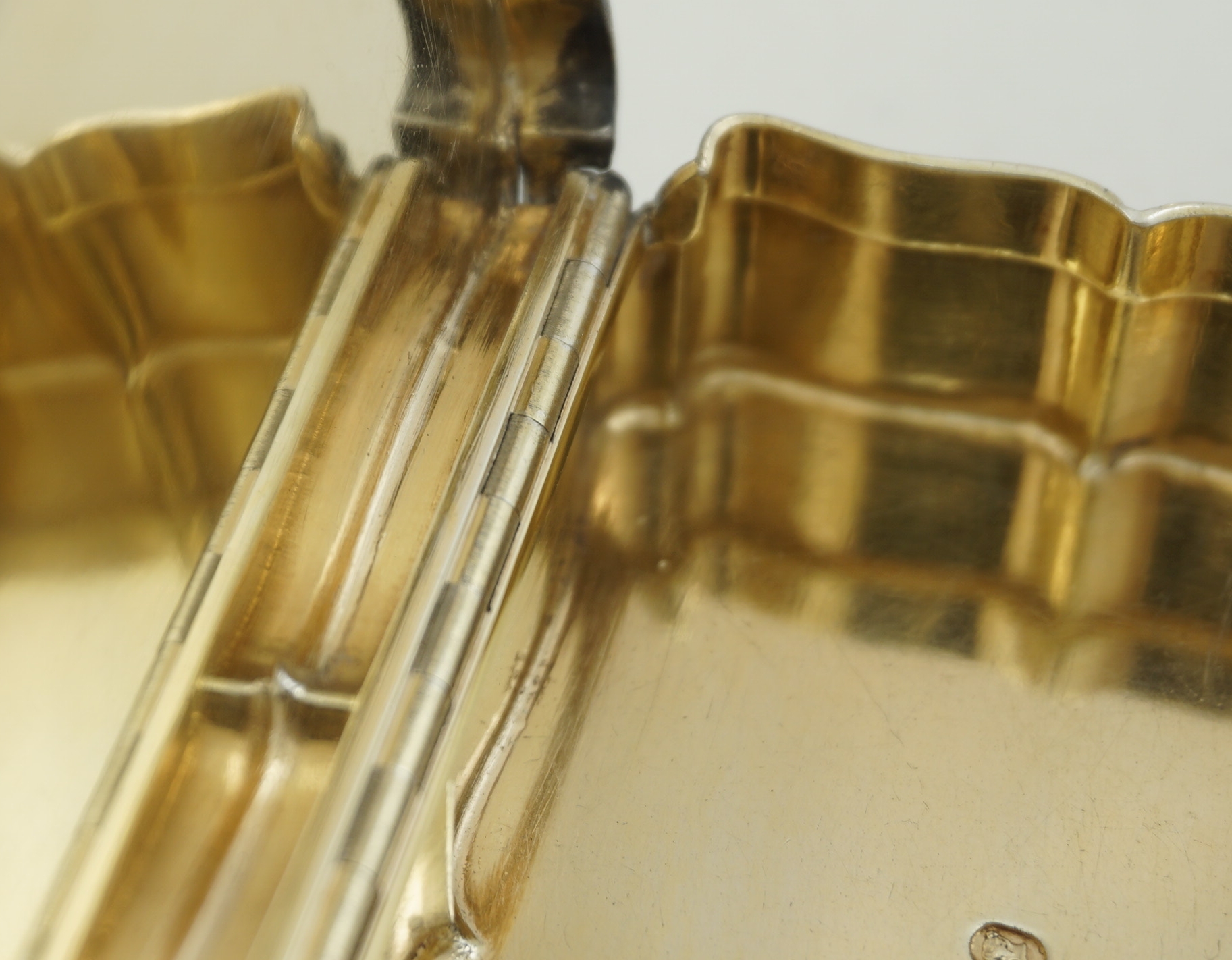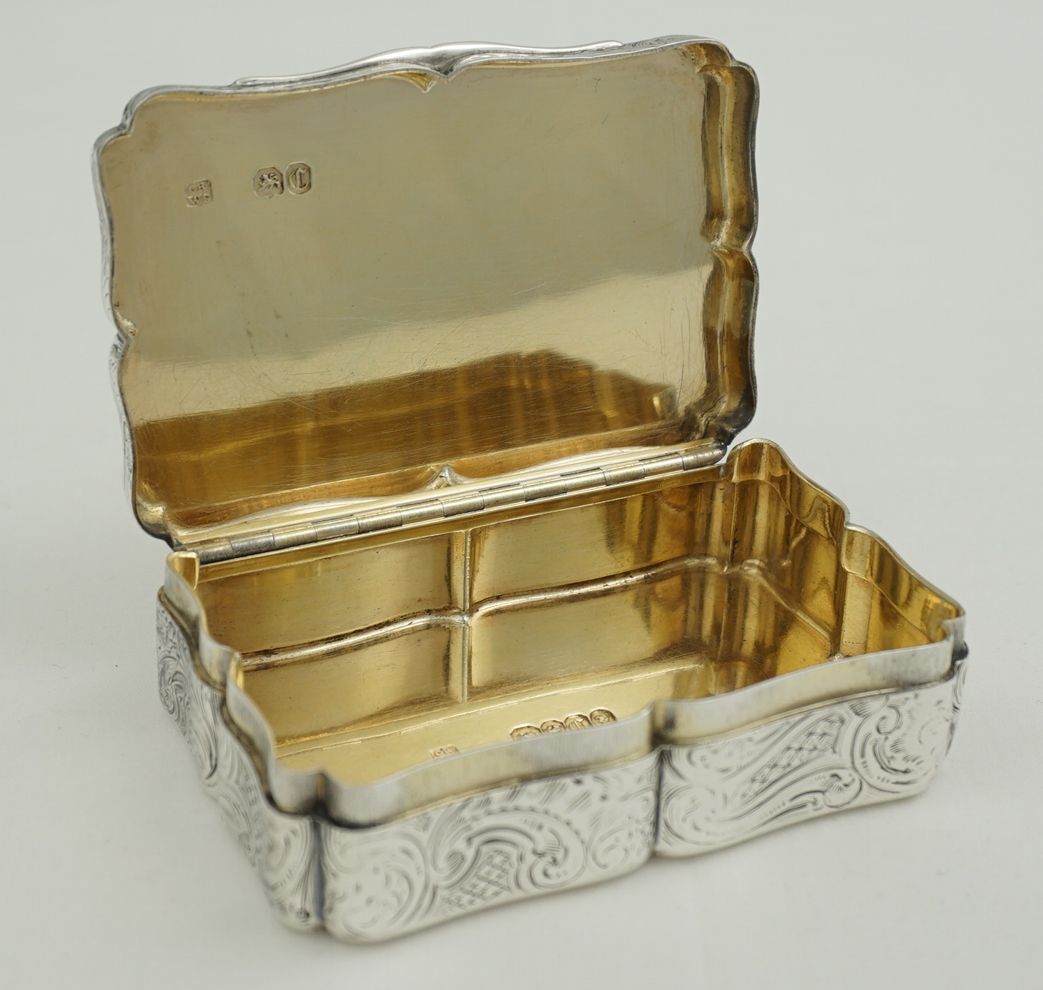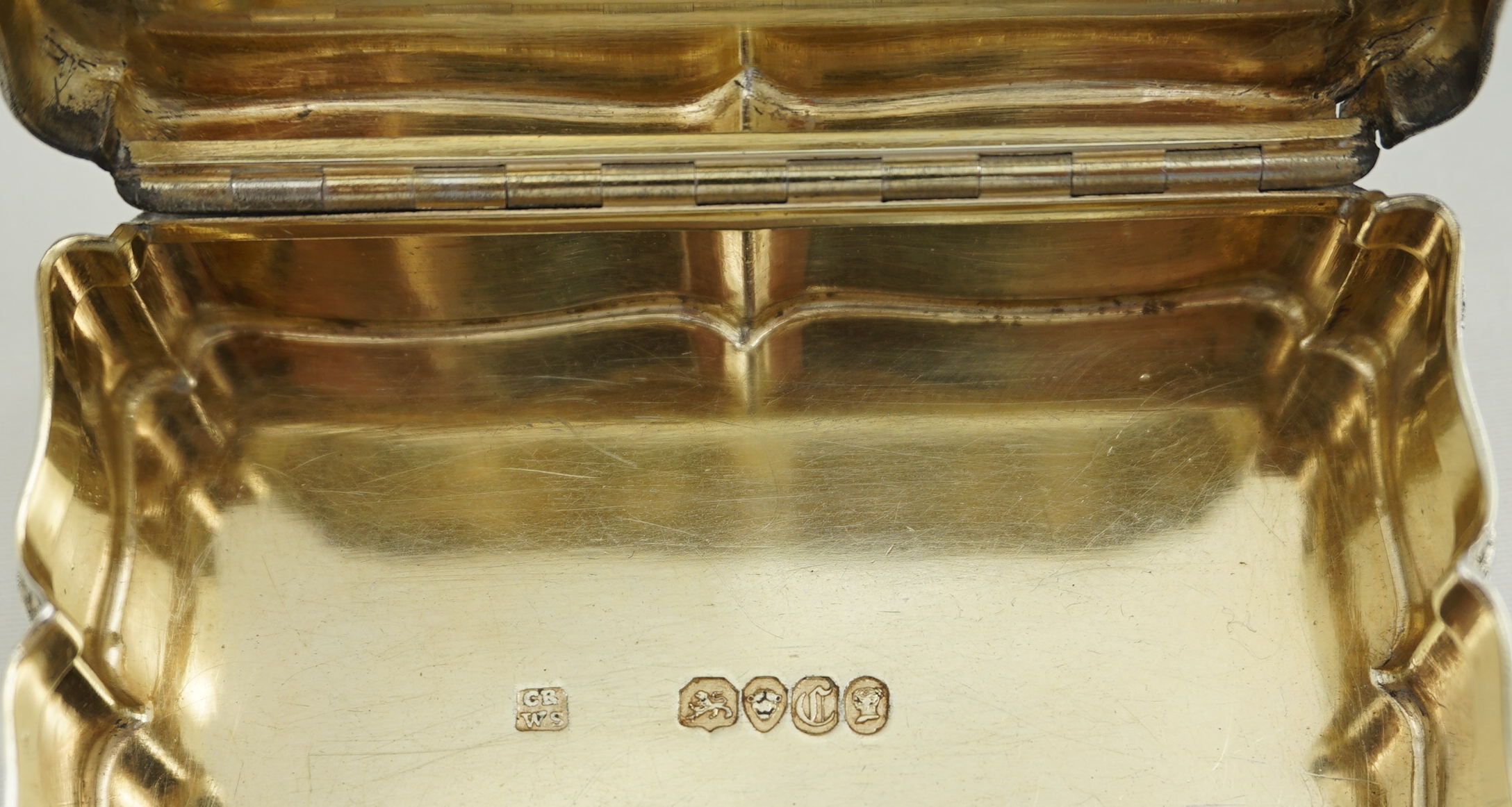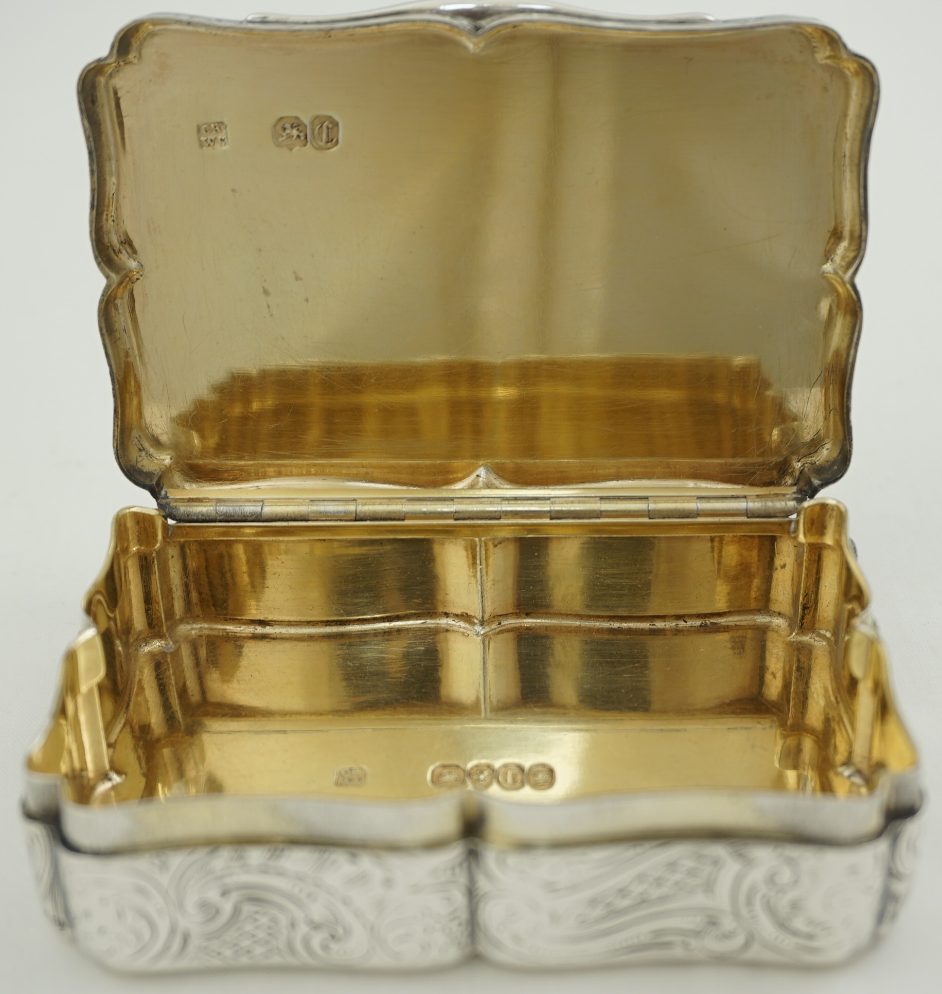 CONDITION | very good, thick silver, heavy box, beautiful internal gilding, tiny, soft bruises to two corners, old and stable small split to rear hinge corner just past the end of the hinge (see images 1, 4, 7, 8, 9, 10) |