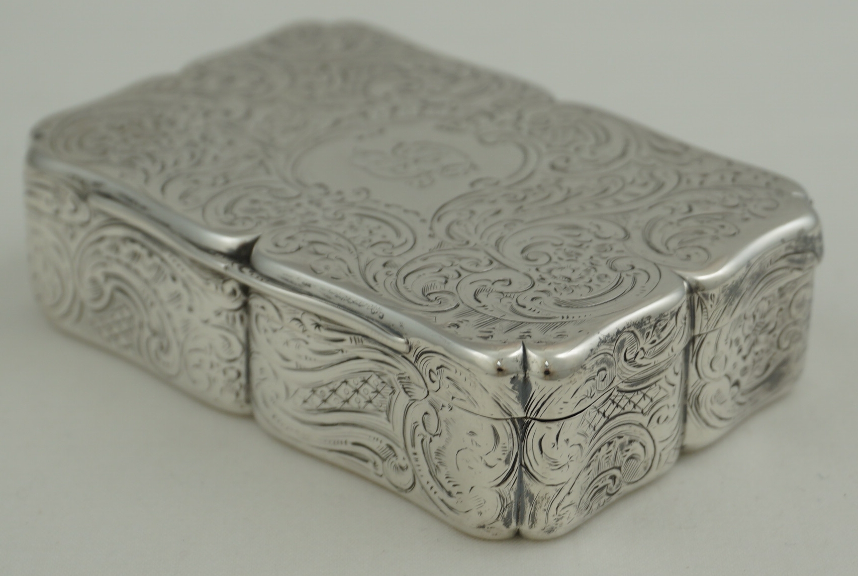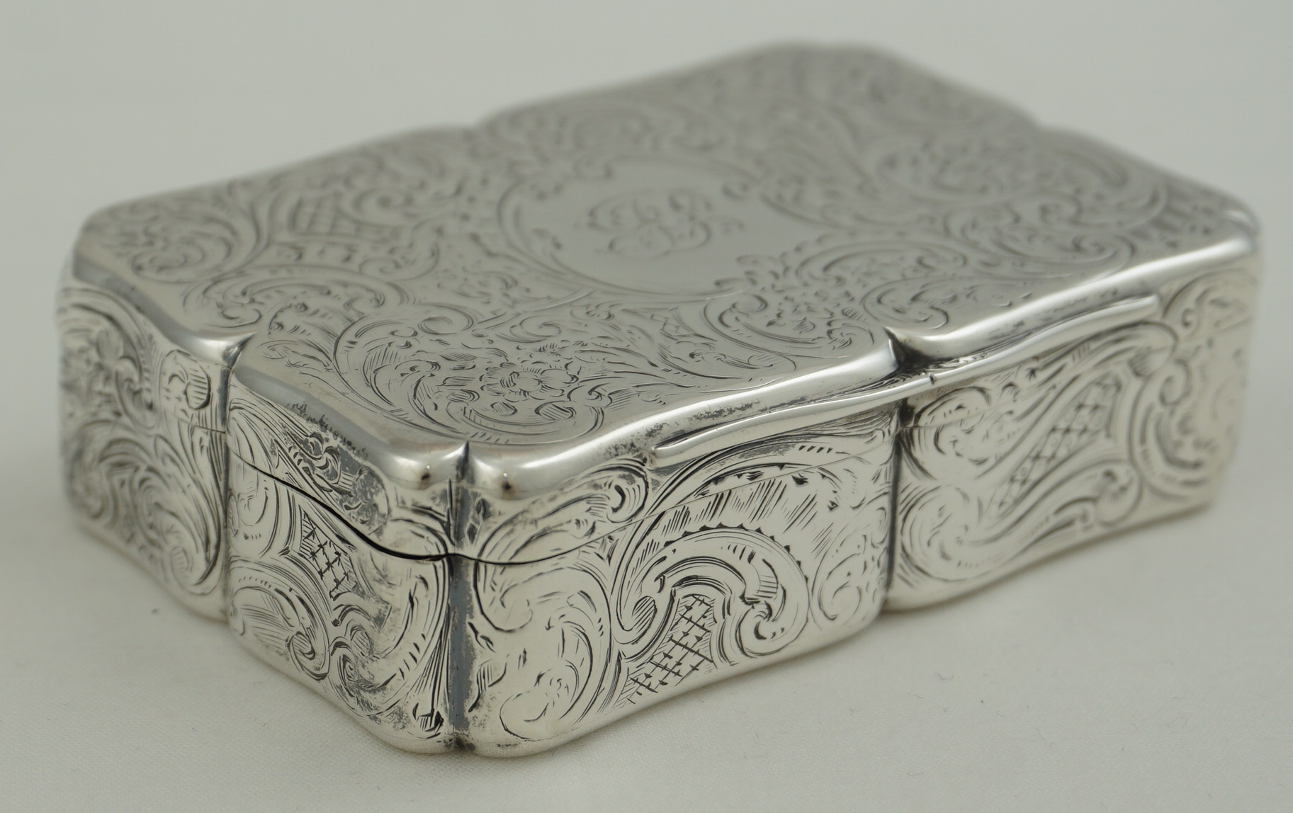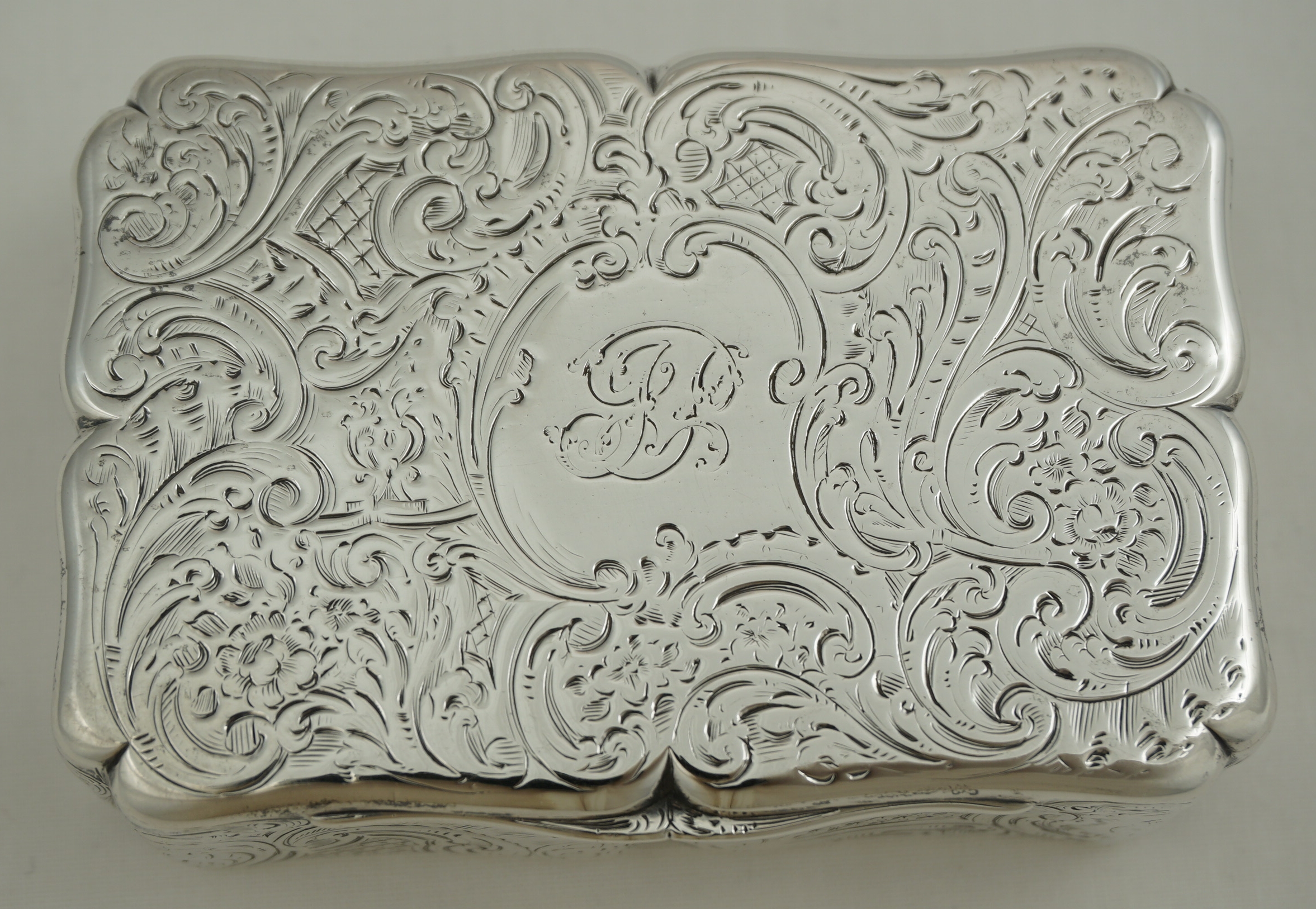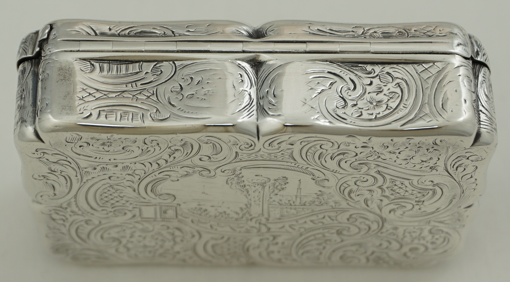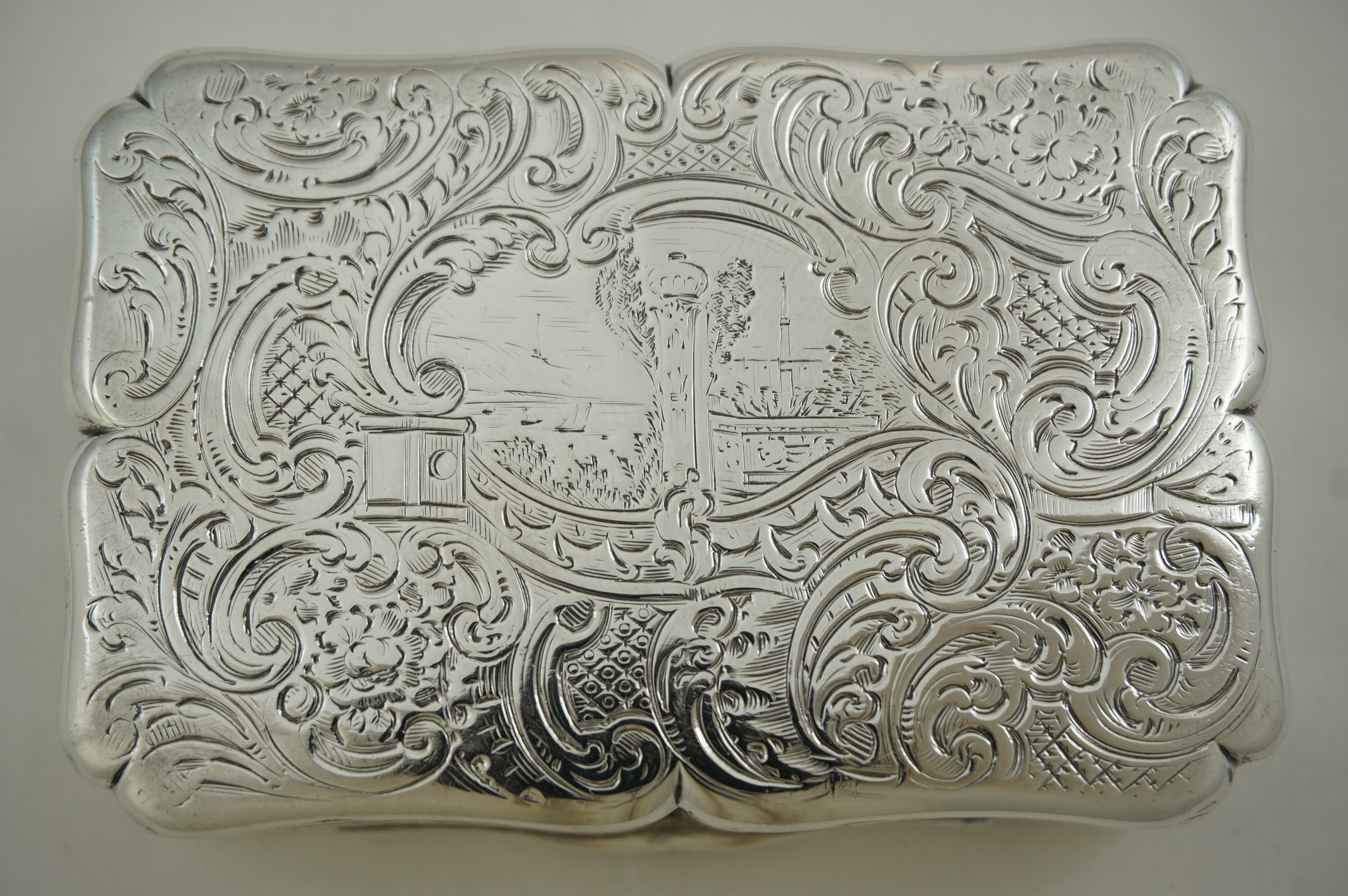 DESCRIPTION | Good and large early Victorian English solid sterling silver snuff box with rococo engraved decoration and a beautifully gilded interior. The cartouche to the lid has the original monogram engraving and to the underside is a landscape featuring a water inlet with sailing vessels, a tall tower with a dome atop and a minaret. I am thinking The Bosphorus from Golden Horn on the European side of Istanbul looking towards the Sea of Marmara. |
