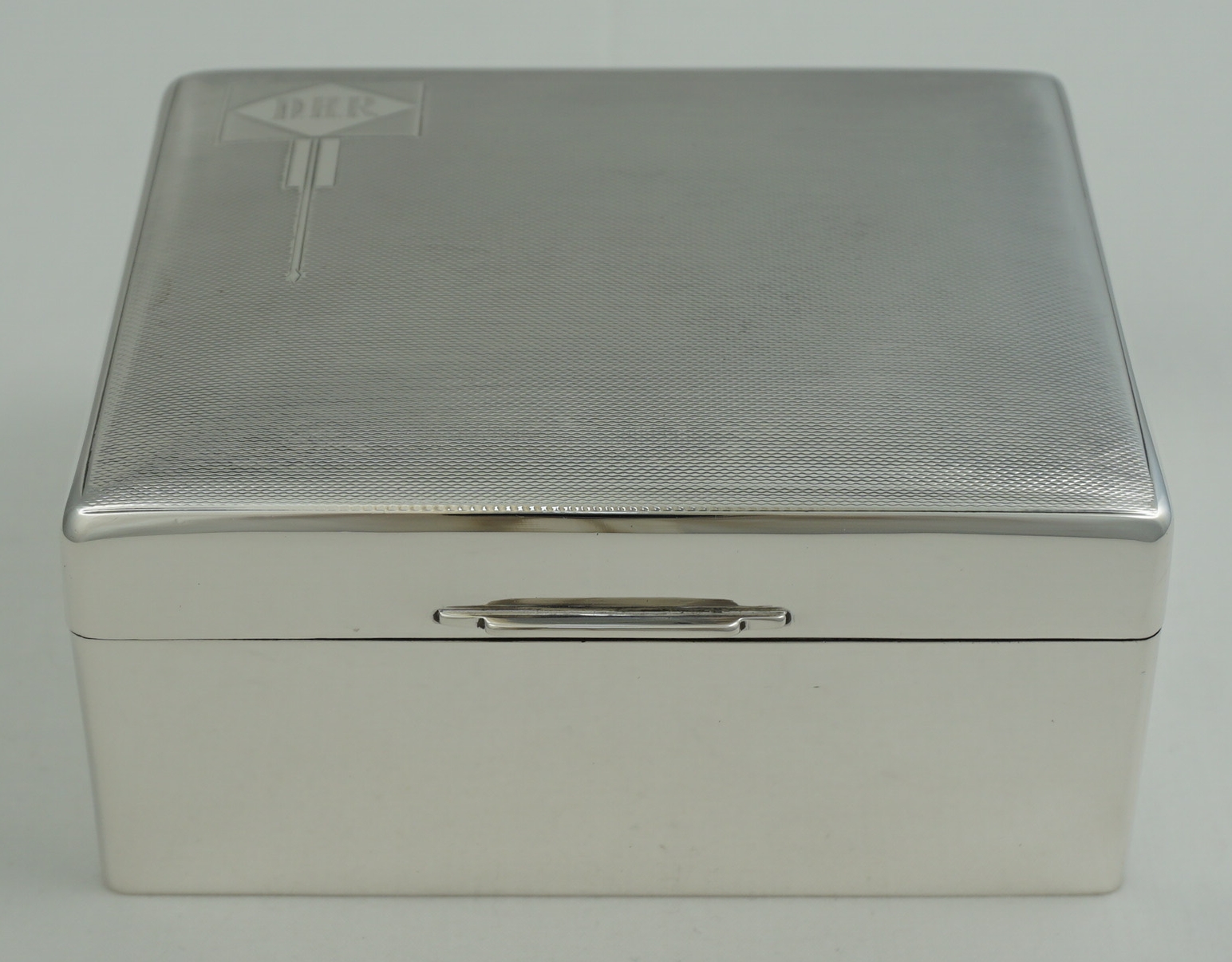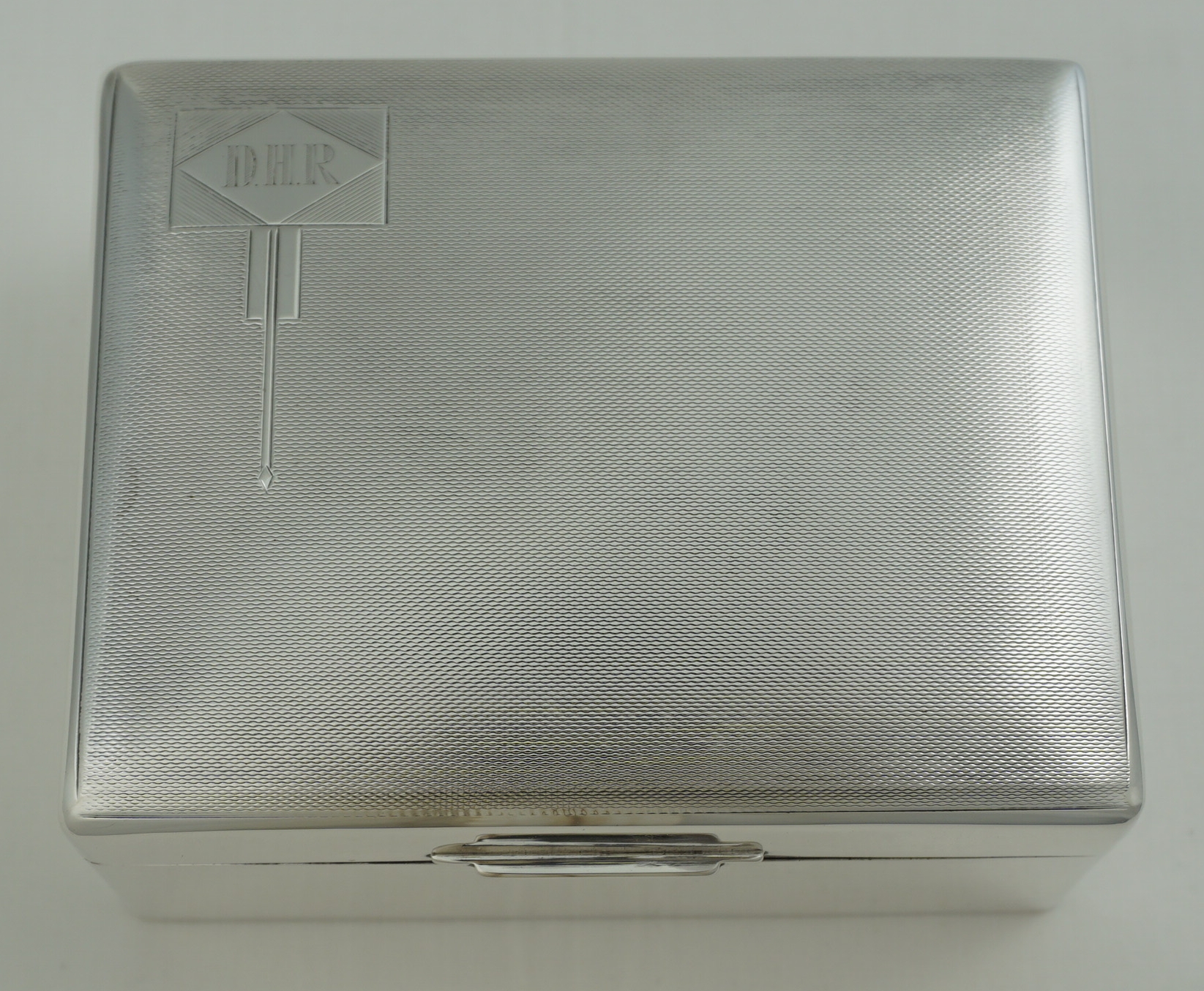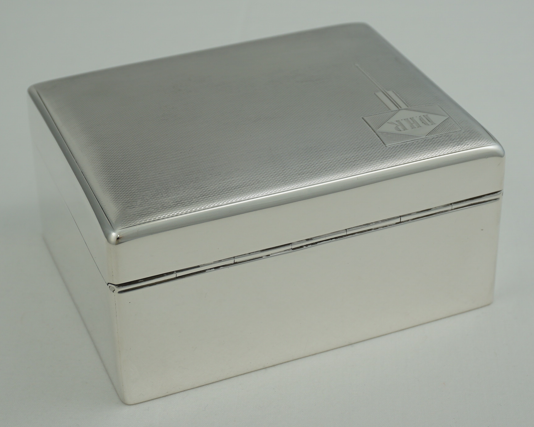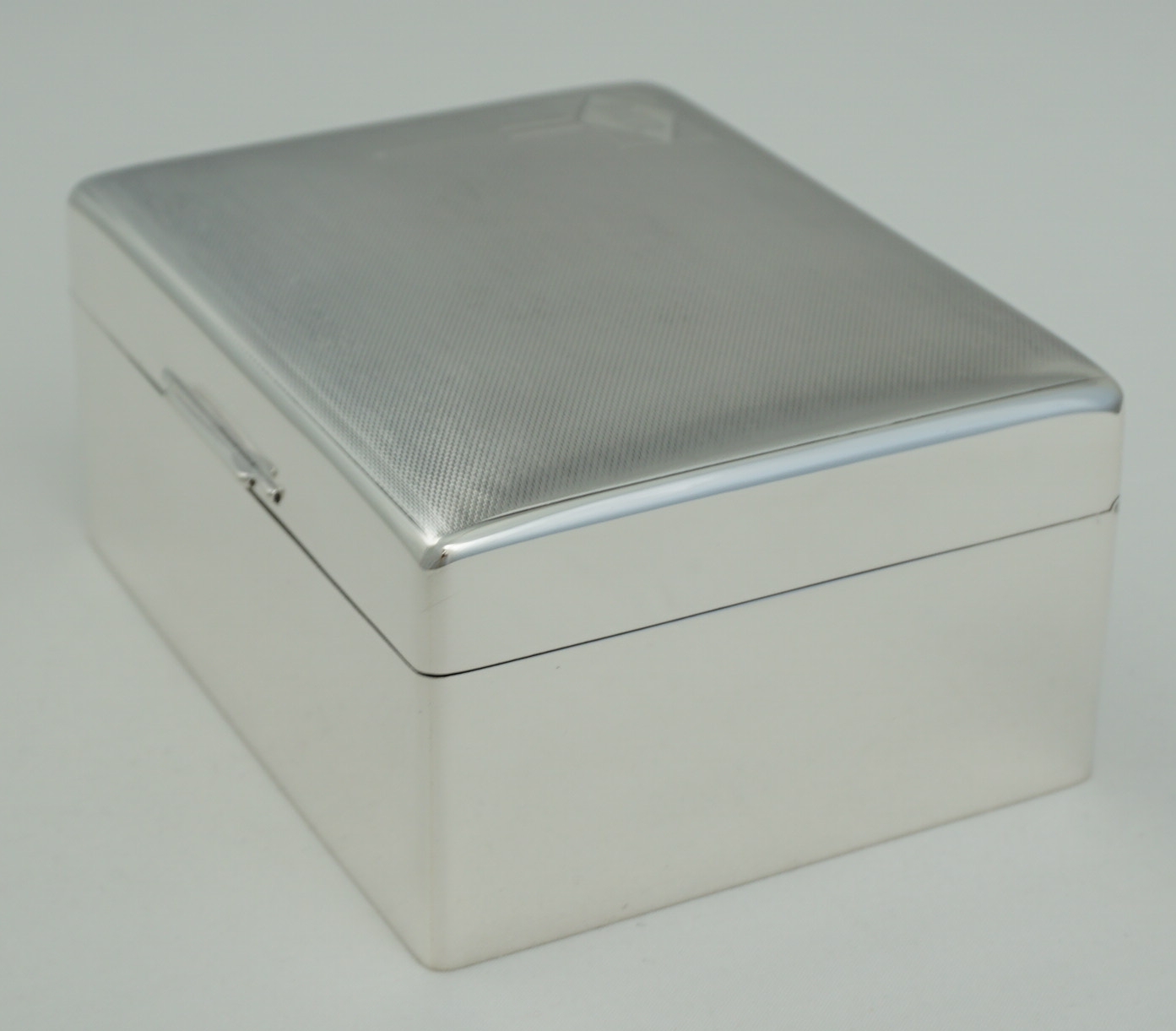 DESCRIPTION | Good vintage English solid sterling silver extra deep cigarette box with engine turned engraved decoration to the lid with initials 'D.H.R', beautifully scented sandalwood interior and unusual dark red Bakelite base. The extra depth makes this a useful storage box for all sorts. |