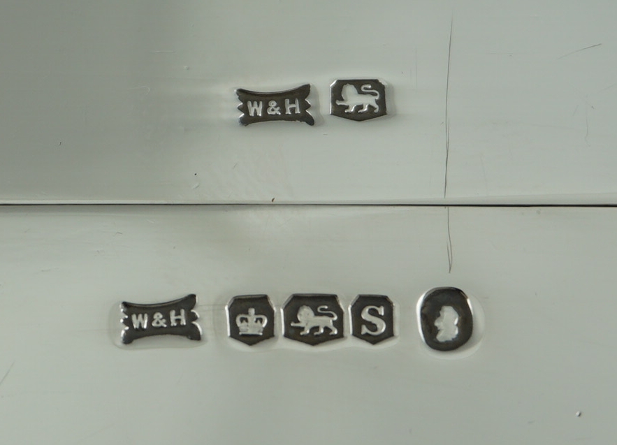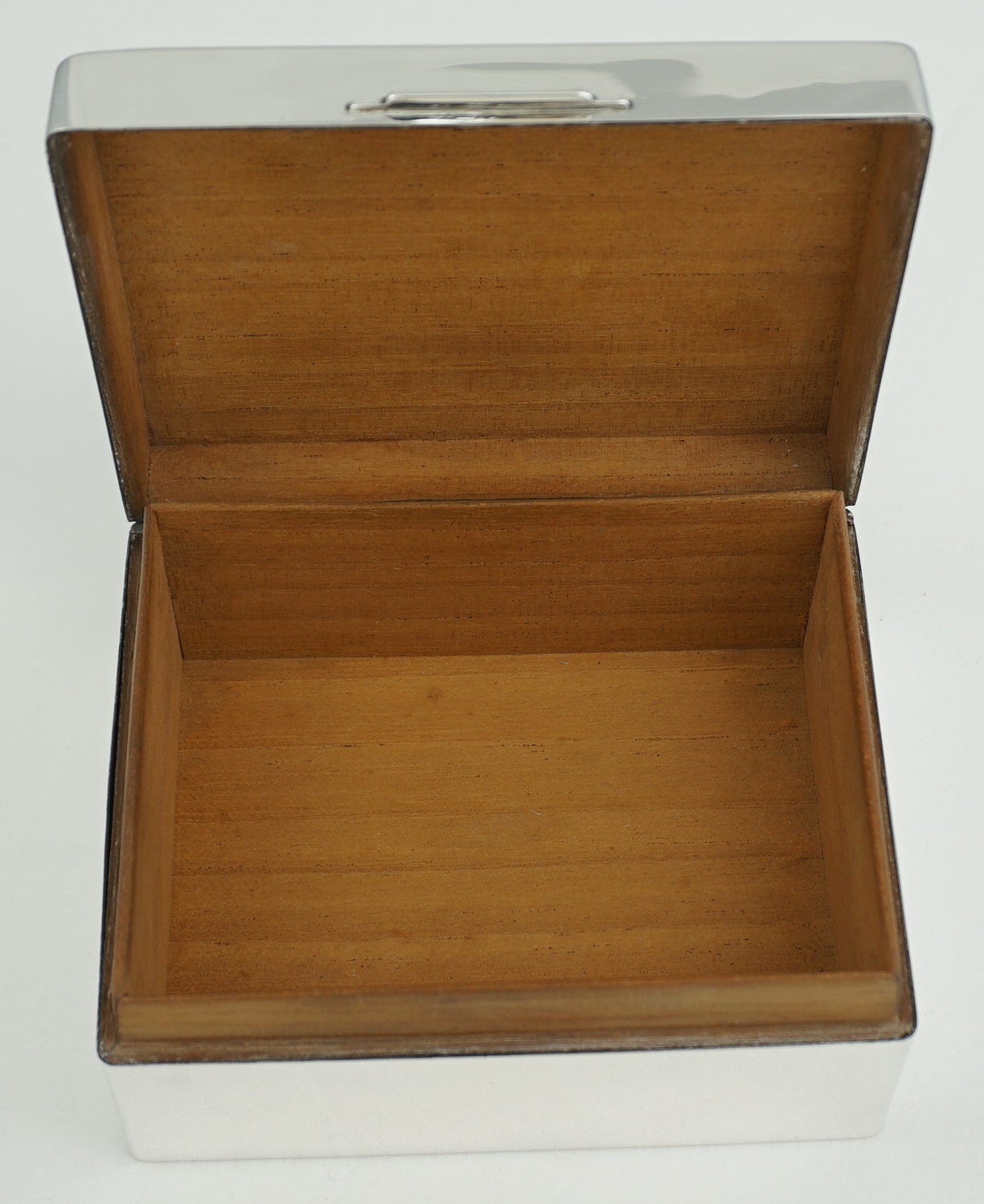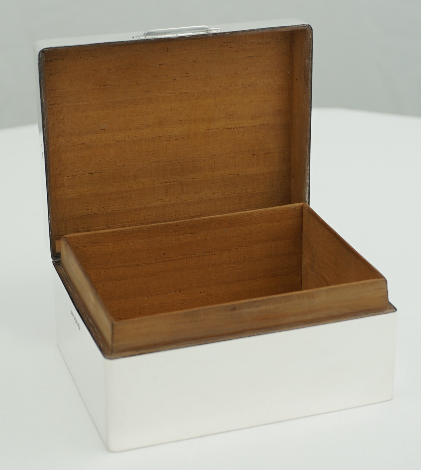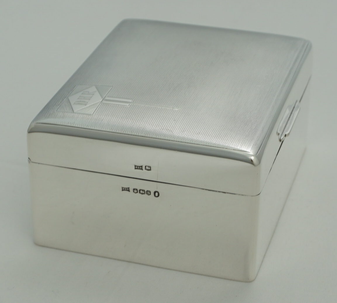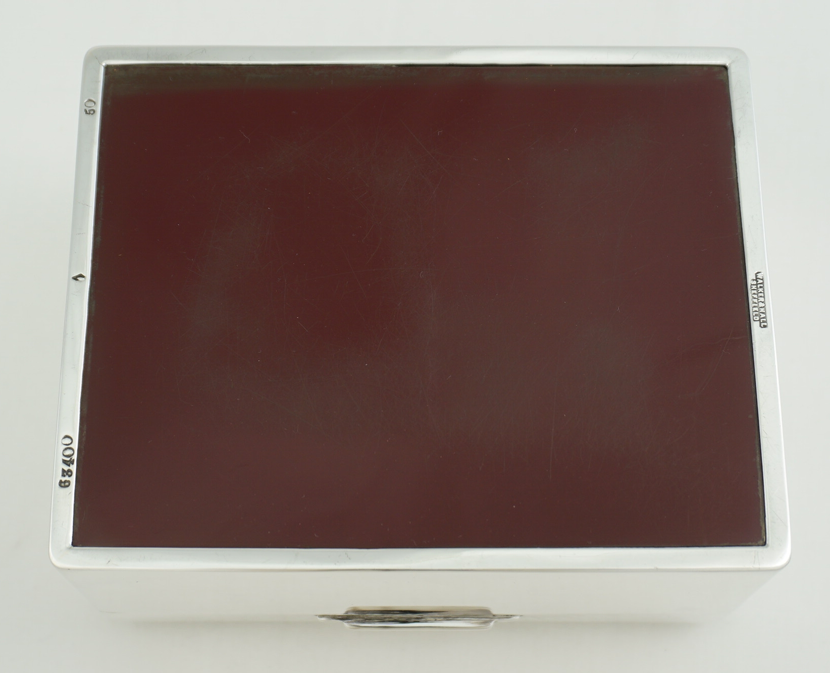 DESCRIPTION | Good vintage English solid sterling silver extra deep cigarette box with engine turned engraved decoration to the lid with initials 'D.H.R', beautifully scented sandalwood interior and unusual dark red Bakelite base. The extra depth makes this a useful storage box for all sorts. |