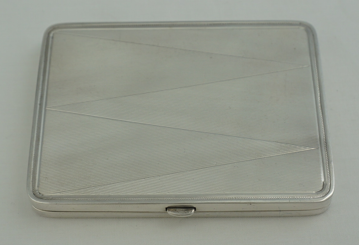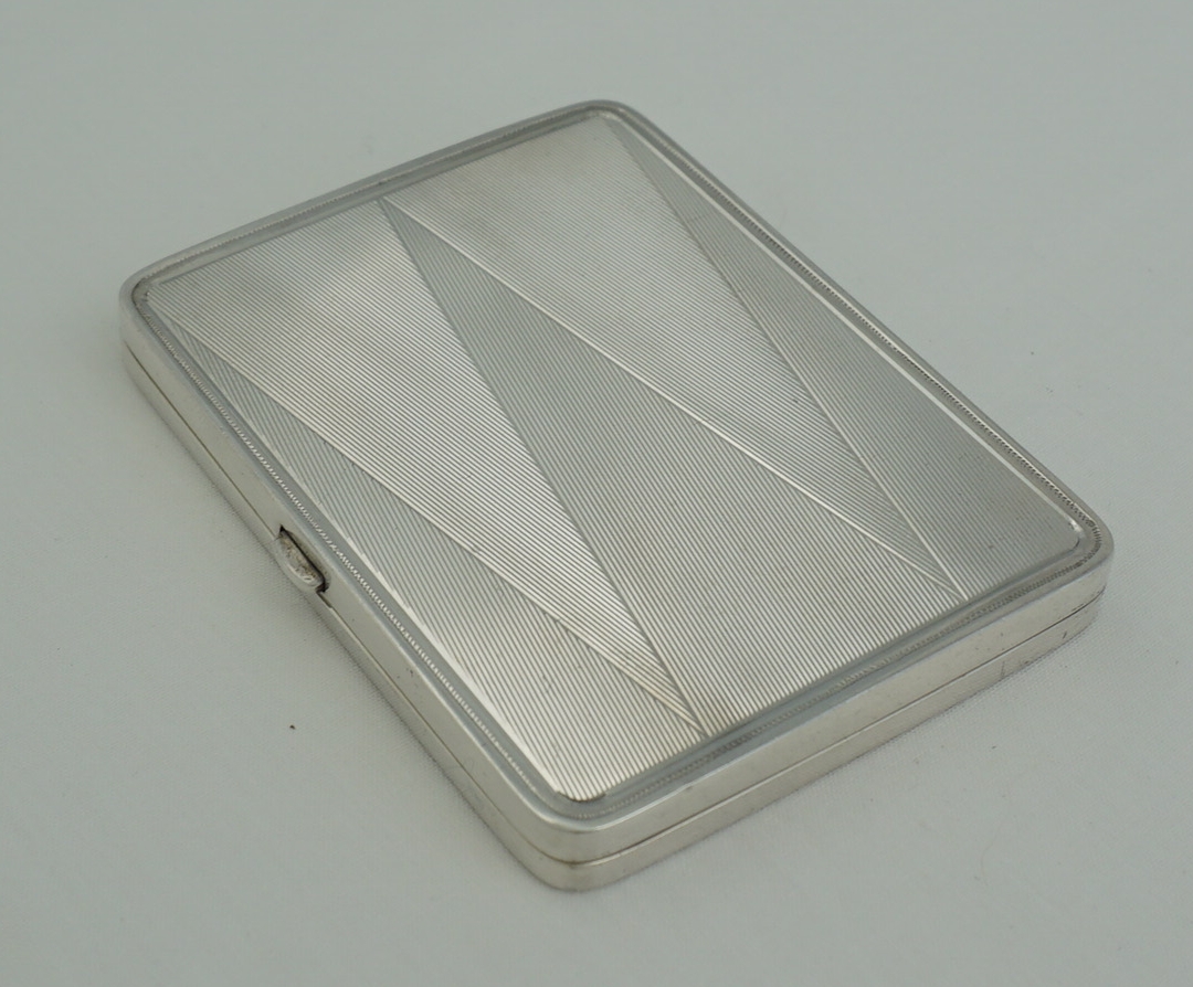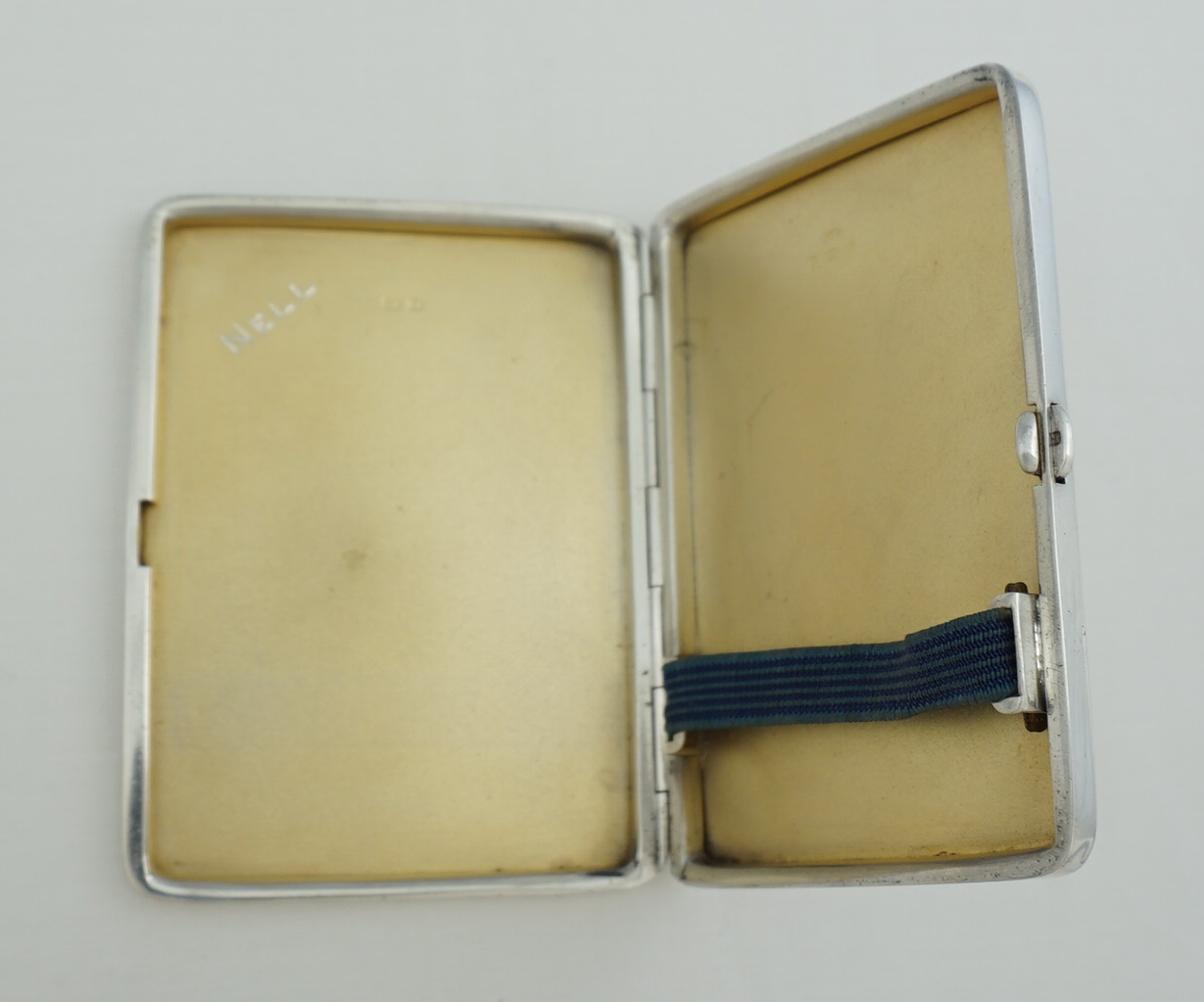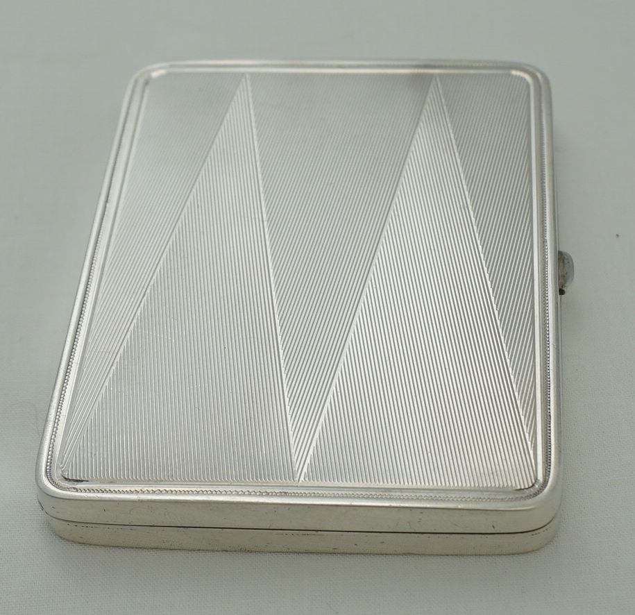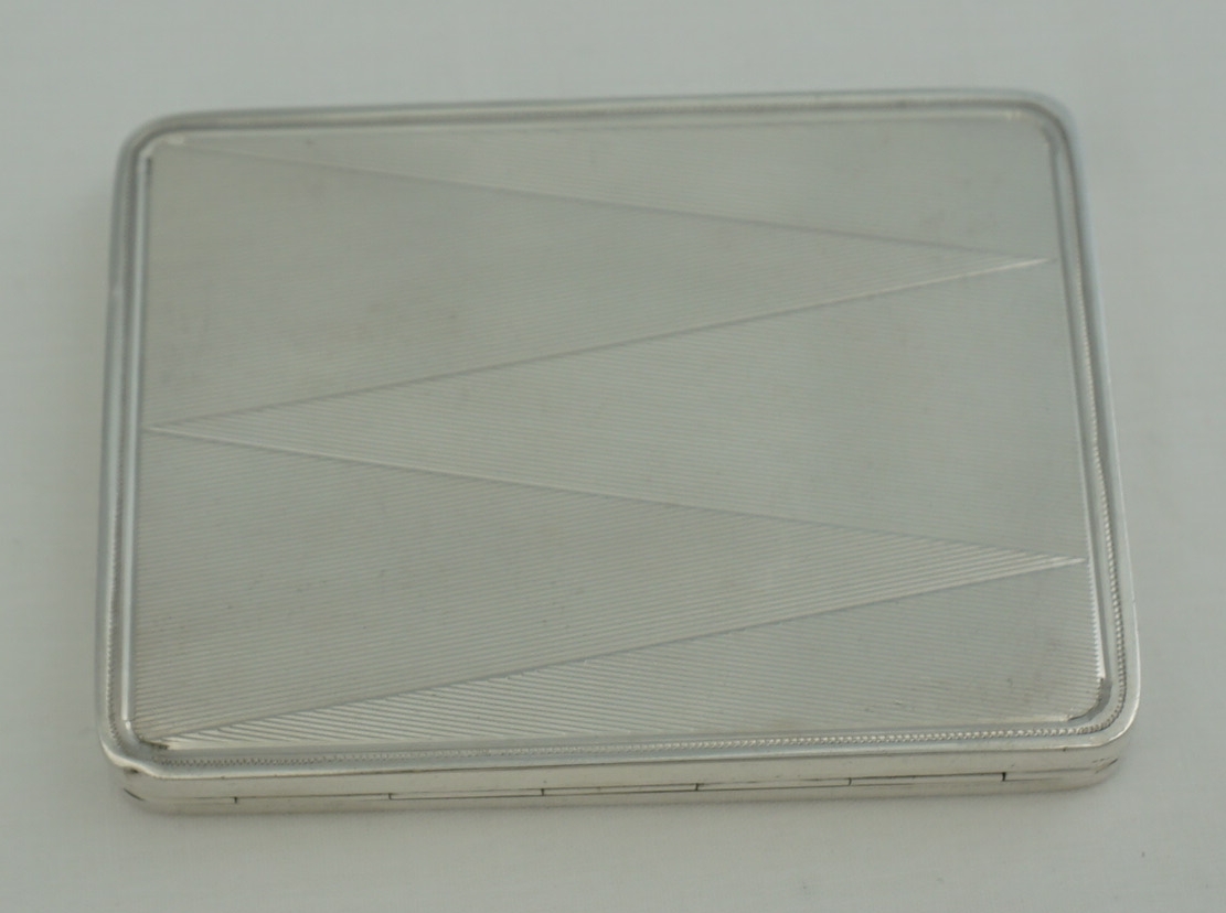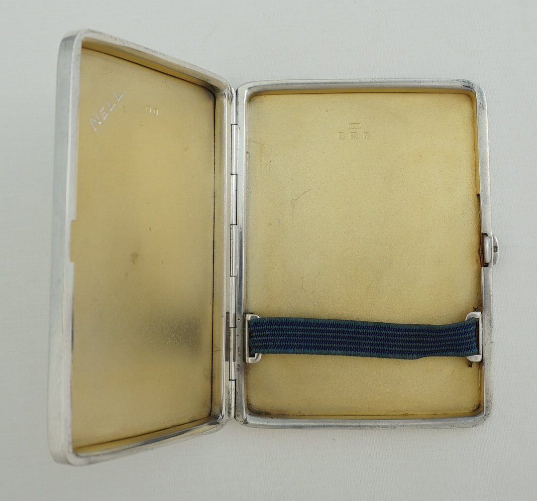 DESCRIPTION | Good quality and very stylish vintage English Art Deco solid sterling silver cigarette case with unusual engine turned engraved decoration and a gilded interior discretely engraved 'NELL' top left. |