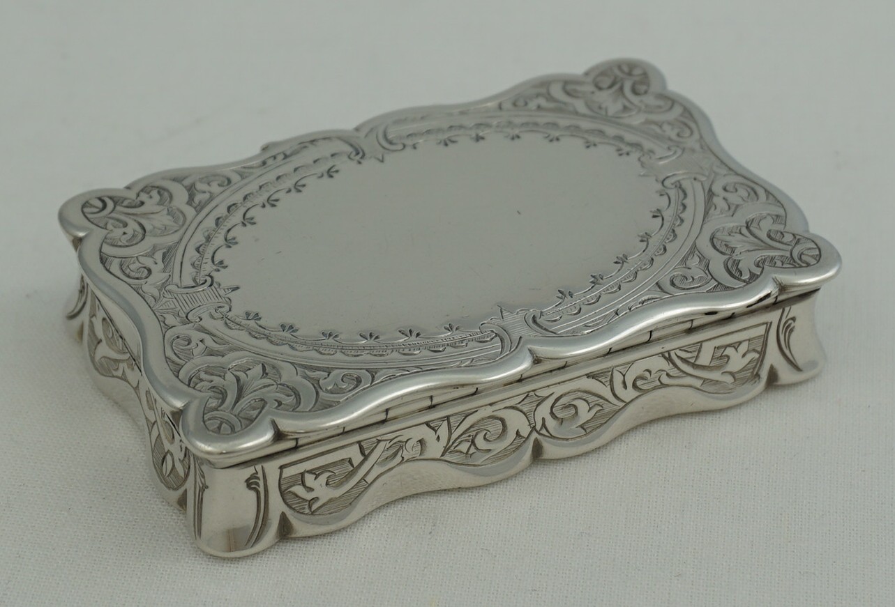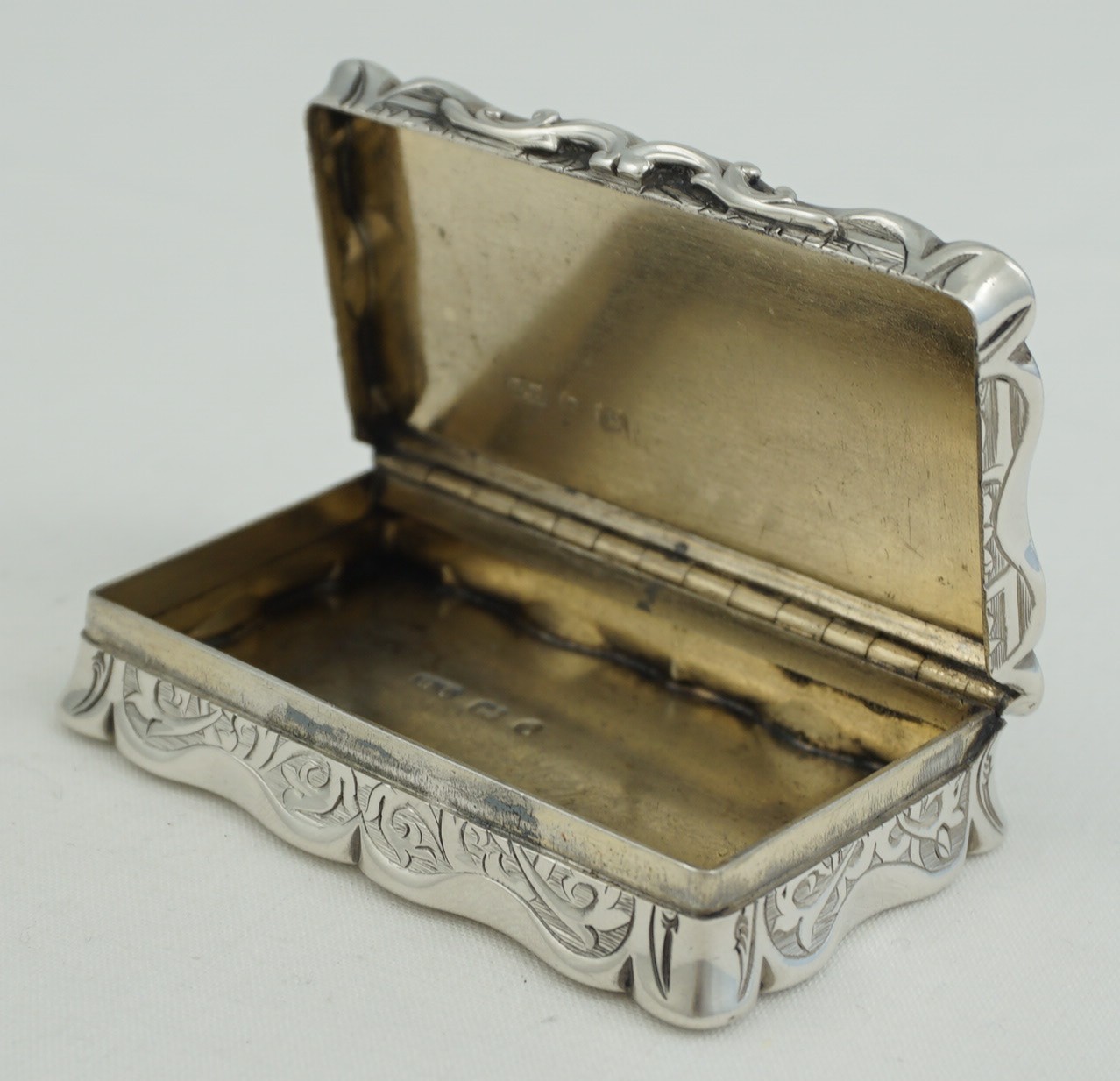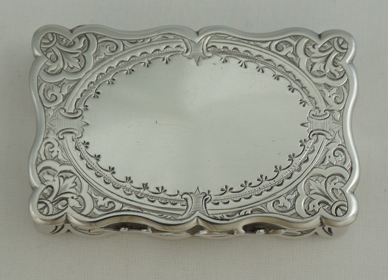 DESCRIPTION | Very good antique English Victorian solid sterling silver snuff box with a gilded interior, engraved decoration and no engraving or erasure to the cartouche. |
