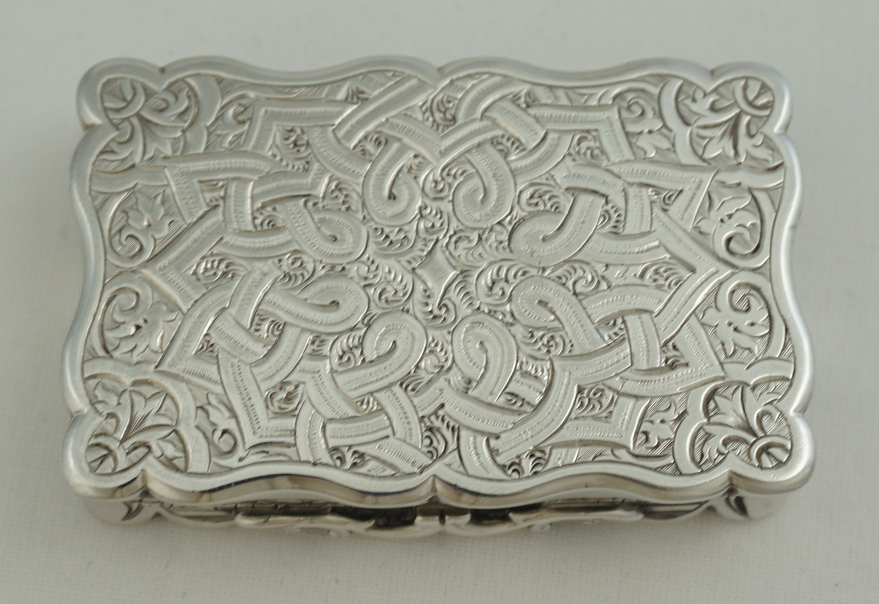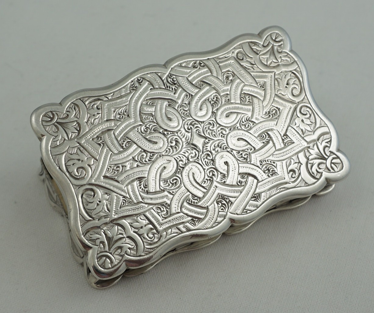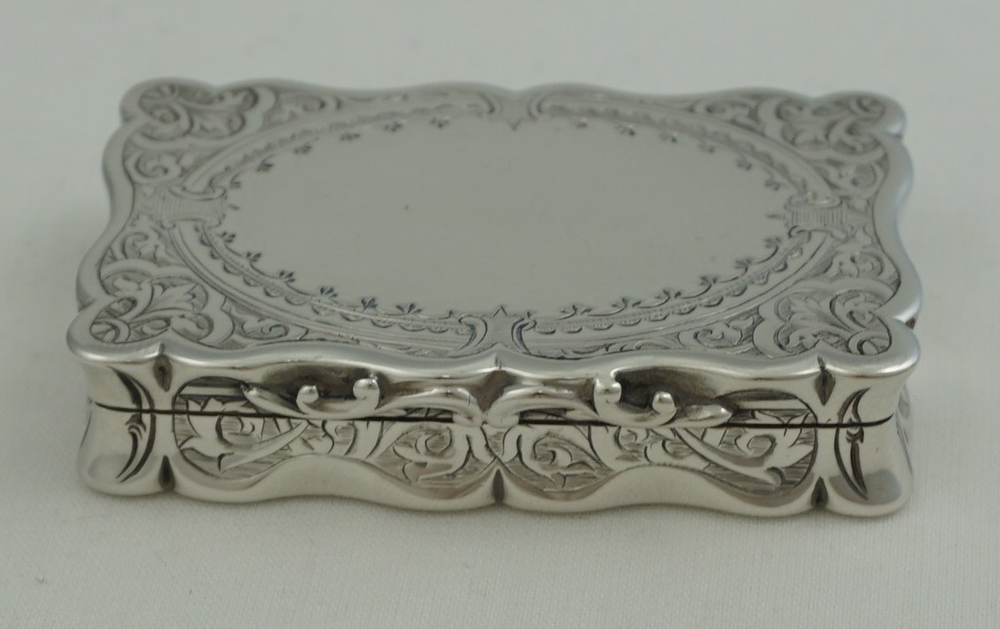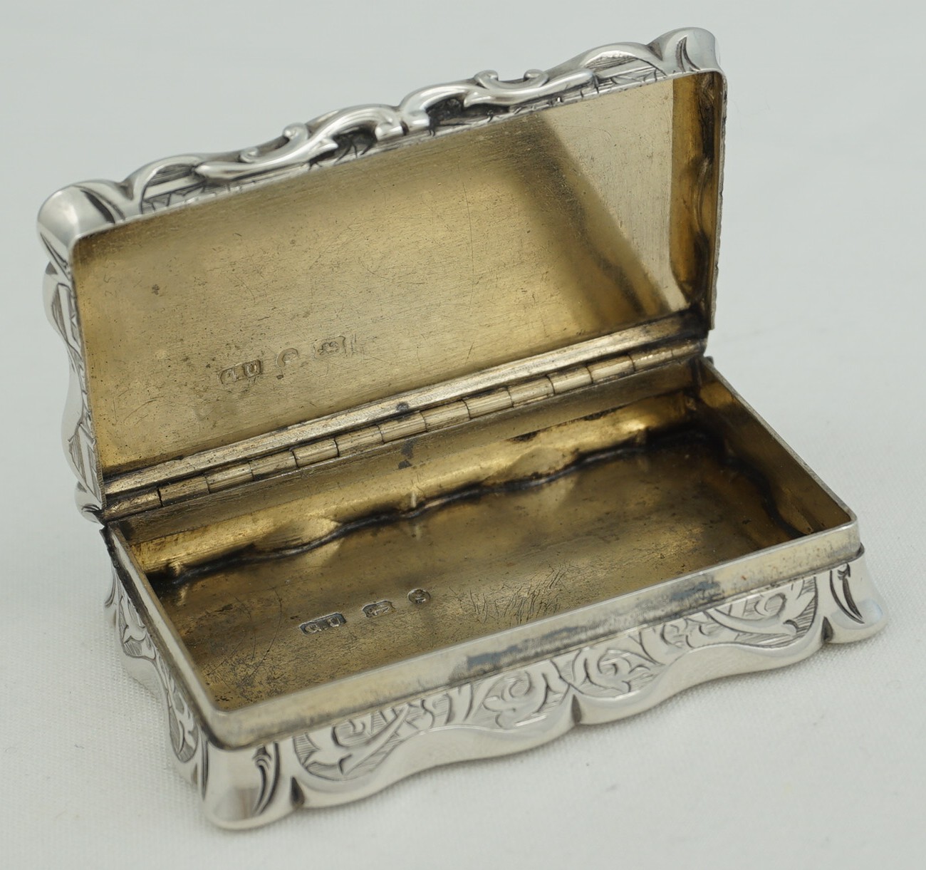 DESCRIPTION | Very good antique English Victorian solid sterling silver snuff box with a gilded interior, engraved decoration and no engraving or erasure to the cartouche. |
