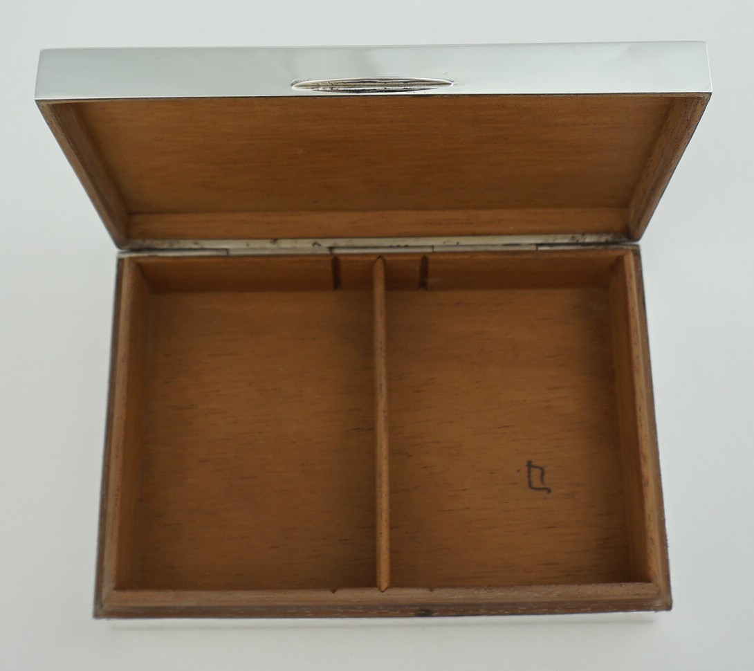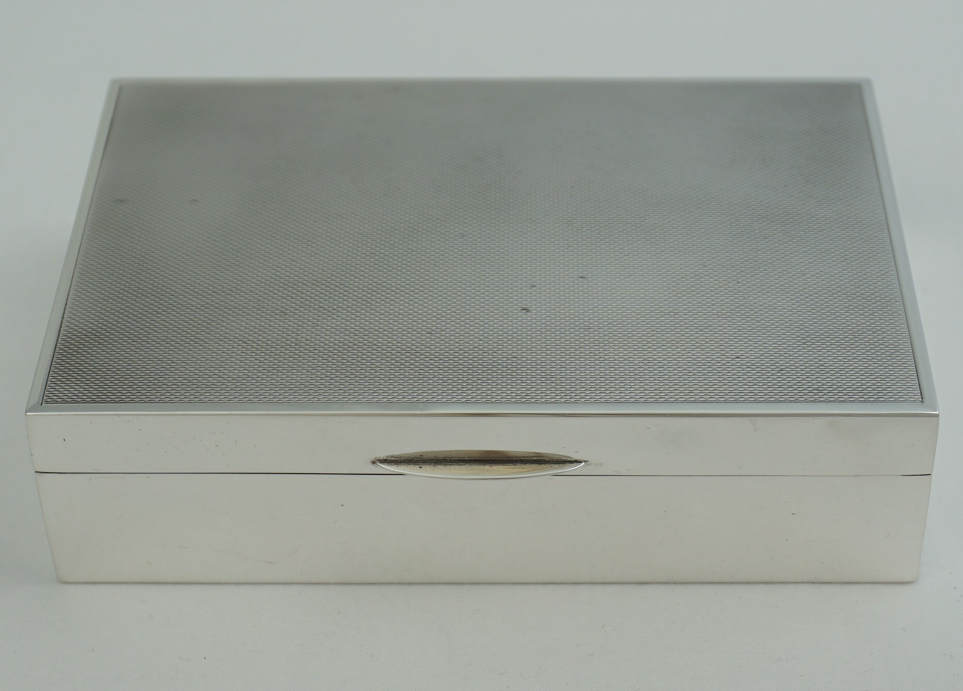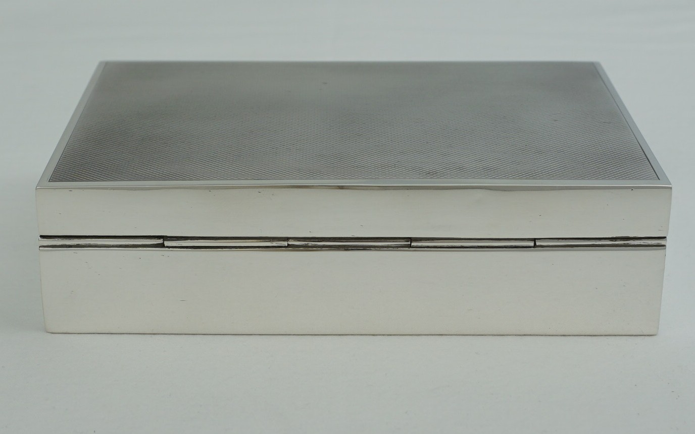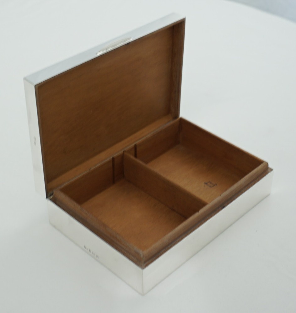 | DESCRIPTION | Very good vintage English silver cigarette box with engine turned engraved decoration and a wood lined interior. |